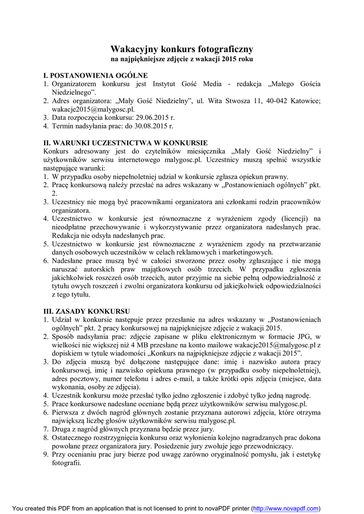Wakacyjny konkurs fotograficzny na najpiękniejsze zdjęcie z wakacji 2015 roku I. POSTANOWIENIA OGÓLNE 1. Organizatorem konkursu jest Instytut Gość Media - redakcja „Małego Gościa Niedzielnego”. 2. Adres organizatora: „Mały Gość Niedzielny”, ul. Wita Stwosza 11, 40-042 Katowice; [email protected]. 3. Data rozpoczęcia konkursu: 29.06.2015 r. 4. Termin nadsyłania prac: do 30.08.2015 r. II. WARUNKI UCZESTNICTWA W KONKURSIE Konkurs adresowany jest do czytelników miesięcznika „Mały Gość Niedzielny” i użytkowników serwisu internetowego malygosc.pl. Uczestnicy muszą spełnić wszystkie następujące warunki: 1. W przypadku osoby niepełnoletniej udział w konkursie zgłasza opiekun prawny. 2. Pracę konkursową należy przesłać na adres wskazany w „Postanowieniach ogólnych” pkt. 2. 3. Uczestnicy nie mogą być pracownikami organizatora ani członkami rodzin pracowników organizatora. 4. Uczestnictwo w konkursie jest równoznaczne z wyrażeniem zgody (licencji) na nieodpłatne przechowywanie i wykorzystywanie przez organizatora nadesłanych prac. Redakcja nie odsyła nadesłanych prac. 5. Uczestnictwo w konkursie jest równoznaczne z wyrażeniem zgody na przetwarzanie danych osobowych uczestników w celach reklamowych i marketingowych. 6. Nadesłane prace muszą być w całości stworzone przez osoby zgłaszające i nie mogą naruszać autorskich praw majątkowych osób trzecich. W przypadku zgłoszenia jakichkolwiek roszczeń osób trzecich, autor przyjmie na siebie pełną odpowiedzialność z tytułu owych roszczeń i zwolni organizatora konkursu od jakiejkolwiek odpowiedzialności z tego tytułu. III. ZASADY KONKURSU 1. Udział w konkursie następuje przez przesłanie na adres wskazany w „Postanowieniach ogólnych” pkt. 2 pracy konkursowej na najpiękniejsze zdjęcie z wakacji 2015. 2. Sposób nadsyłania prac: zdjęcie zapisane w pliku elektronicznym w formacie JPG, w wielkości nie większej niż 4 MB przesłane na konto mailowe [email protected] z dopiskiem w tytule wiadomości „Konkurs na najpiękniejsze zdjęcie z wakacji 2015”. 3. Do zdjęcia muszą być dołączone następujące dane: imię i nazwisko autora pracy konkursowej, imię i nazwisko opiekuna prawnego (w przypadku osoby niepełnoletniej), adres pocztowy, numer telefonu i adres e-mail, a także krótki opis zdjęcia (miejsce, data wykonania, osoby ze zdjęcia). 4. Uczestnik konkursu może przesłać tylko jedno zgłoszenie i zdobyć tylko jedną nagrodę. 5. Prace konkursowe nadesłane oceniane będą przez użytkowników serwisu malygosc.pl. 6. Pierwsza z dwóch nagród głównych zostanie przyznana autorowi zdjęcia, które otrzyma największą liczbę głosów użytkowników serwisu malygosc.pl. 7. Druga z nagród głównych przyznana będzie przez jury. 8. Ostatecznego rozstrzygnięcia konkursu oraz wyłonienia kolejno nagradzanych prac dokona powołane przez organizatora jury. Posiedzenie jury zwołuje jego przewodniczący. 9. Przy ocenianiu prac jury bierze pod uwagę zarówno oryginalność pomysłu, jak i estetykę fotografii. You created this PDF from an application that is not licensed to print to novaPDF printer (http://www.novapdf.com) V. JURY W skład komisji konkursowej wchodzą redaktorzy redakcji miesięcznika „Mały Gość Niedzielny” i tygodnika „Gość Niedzielny”: a. redaktor naczelna Gabriela Szulik - przewodnicząca, b. fotoedytor Józef Wolny, c. redaktor Piotr Sacha. VI. NAGRODY 1. Organizator przyzna dwie równorzędne nagrody główne: a. I miejsce, nagroda czytelników – aparat fotograficzny Canon PowerShot S200 oraz gadżety firmowe „Małego Gościa Niedzielnego”, b. I miejsce, nagroda jury, aparat fotograficzny Canon PowerShot S200 oraz gadżety firmowe „Małego Gościa Niedzielnego”, c. 10 wyróżnionych miejsc – gra komputerowa LEGO Marvel Super Heroes PC oraz gadżety firmowe „Małego Gościa Niedzielnego”, d. 10 wyróżnionych miejsc – gra planszowa Monopoly e-banking oraz gadżety firmowe „Małego Gościa Niedzielnego”, 2. Lista laureatów konkursu zostanie opublikowana na stronie malygosc.pl 15 września 2015 r., a prace, które zajmą I miejsca, zostaną opublikowane dodatkowo we wrześniowym numerze „Małego Gościa Niedzielnego”. 3. Nagrody zostaną przesłane na adres podany w zgłoszeniu. 4. Nagrody nie podlegają zamianie na inne nagrody rzeczowe. Nie jest możliwe otrzymanie równowartości nagrody w gotówce. 5. Nagrodzone prace zostaną opublikowane na stronie malygosc.pl w terminie ustalonym przez organizatora. VII. DANE OSOBOWE UCZESTNIKÓW KONKURSU 1. Warunkiem udziału w konkursie jest przesłanie wiadomości e-mail, w której zamieszczone będą: zdjęcie konkursowe, dane osobowe: imię i nazwisko osoby biorącej udział w konkursie, imię i nazwisko opiekuna prawnego (w przypadku osoby niepełnoletniej), adres zamieszkania, numer telefonu i adres e-mail. Podanie nieprawdziwych lub niepełnych danych osobowych albo ich brak powoduje wykluczenie z konkursu. 2. Osoby biorące udział w konkursie zgadzają się na opublikowanie imienia i nazwiska oraz miejscowości na stronie malygosc.pl. VIII. POSTANOWIENIA KOŃCOWE 1. Regulamin niniejszy jest jedynym dokumentem określającym zasady konkursu. Zgłoszenie się do konkursu jest jednoznaczne z akceptacją niniejszego regulaminu. 2. Organizatorowi przysługuje wyłączne prawo do: a. ustalenia zadań konkursowych, b. wyboru uczestników konkursu, c. wyłonienia zdobywców nagród na podstawie zasad określonych w niniejszym regulaminie. 3. Spory odnoszące się do konkursu i z niego wynikające będą rozwiązywane przez organizatora konkursu. 4. Wszelkie decyzje organizatora będą wiążące i ostateczne. 5. Organizator nie jest odpowiedzialny za niedostępność konkursu wskutek problemów z przesyłaniem prac konkursowych, nie bierze odpowiedzialności za jakąkolwiek utratę materiałów lub uszkodzenia powstałe nie z winy organizatora. You created