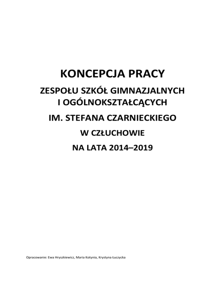 KONCEPCJA PRACY ZESPOŁU SZKÓŁ GIMNAZJALNYCH I OGÓLNOKSZTAŁCĄCYCH IM. STEFANA CZARNIECKIEGO W CZŁUCHOWIE NA LATA 2014–2019 Opracowanie: Ewa Hryszkiewicz, Maria Kotynia, Krystyna Łuczycka KONCEPCJA PRACY ZESPOŁU SZKÓŁ GIMNAZJALNYCH I OGÓLNOKSZTAŁCĄCYCH IM. STEFANA CZARNIECKIEGO W CZŁUCHOWIE NA LATA 2014 – 2019 Spis treści I. PROCES OPRACOWYWANIA KONCEPCJI PRACY SZKOŁY. 3 1.1. PODSTAWA PRAWNA OPRACOWANIA KONCEPCJI: 1.2. DOKUMENTACJA SZKOLNA WYKORZYSTANA DO OPRACOWANIA KONCEPCJI: 1.3. SPOSÓB ZAPOZNANIA Z KONCEPCJĄ: 1.4. SPOSÓB UPUBLICZNIENIA KONCEPCJI: 3 3 3 4 II. WIZJA I MISJA ZESPOŁU SZKÓŁ GIMNAZJALNYCH I OGÓLNOKSZTAŁCĄCYCH IM. ST. CZARNIECKIEGO W CZŁUCHOWIE. 4 2.1 CHARAKTERYSTYKA SZKOŁY: 2.2 ORGANIZACJA ZAJĘĆ DYDAKTYCZNYCH W SZKOLE: 2.3. WIZJA SZKOŁY: 2.4. MISJA SZKOŁY: 2.5. MODEL ABSOLWENTA: 4 4 7 7 8 III. ANALIZA SWOT STANU SZKOŁY. 10 3. 1. MOCNE STRONY SZKOŁY: 3.2. SŁABE STRONY SZKOŁY: 3.3. SZANSE SZKOŁY: 3.4. ZAGROŻENIA WYNIKAJĄCE Z WPŁYWÓW ŚRODOWISKA NA SZKOŁĘ: 10 10 10 11 IV. GŁÓWNE CELE SZKOŁY ORAZ ZADANIA I FORMY ICH REALIZACJI. 11 4.1 ROZWÓJ ZAWODOWY NAUCZYCIELI: 4.2. DYDAKTYKA. 4.3. WYCHOWANIE I OPIEKA. 4.4. NADZÓR PEDAGOGICZNY. 4.5. WSPÓŁPRACA Z RODZICAMI, ŚRODOWISKIEM LOKALNYM, WŁADZAMI SAMORZĄDOWYMI I OŚWIATOWYMI. 4.6. PROMOCJA SZKOŁY. 4.7. BAZA DYDAKTYCZNA. 11 12 14 16 V. PODSUMOWANIE. 19 16 17 18 Strona 2 z 19 KONCEPCJA PRACY ZESPOŁU SZKÓŁ GIMNAZJALNYCH I OGÓLNOKSZTAŁCĄCYCH IM. STEFANA CZARNIECKIEGO W CZŁUCHOWIE NA LATA 2014 – 2019 I. Proces opracowywania koncepcji pracy szkoły. 1.1. Podstawa prawna opracowania Koncepcji: Ustawa z dnia 7 września 1991 r. o systemie oświaty (Dz. U. z 2004 r. Nr 256, poz. 2572 z późniejszymi zmianami), Ustawa z dnia 26 stycznia 1982 r. Karta Nauczyciela (Dz. U. z 2006 r. Nr 97, poz. 674 z późniejszymi zmianami), Rozporządzenie Ministra Edukacji Narodowej z dnia 7 października 2009 r. w sprawie nadzoru pedagogicznego (Dz. U. z 2009 r. Nr 168, poz. 1324 ze zmianami) – załącznik, Rozporządzenie Ministra Edukacji Narodowej z dnia 23 grudnia 2008 r. w sprawie podstawy programowej wychowania przedszkolnego oraz kształcenia ogólnego w poszczególnych typach szkół (Dz. U. z 2009 r. Nr 4, poz. 17), Konwencja o prawach dziecka, przyjęta przez Zgromadzenie Ogólne Narodów Zjednoczonych dnia 20 listopada 1989 r. (Dz. U. z 1991 r. Nr 120, poz. 526). 1.2. Dokumentacja szkolna wykorzystana do opracowania koncepcji: Statut Zespołu Szkół Gimnazjalnych i Ogólnokształcących im. St. Czarnieckiego w Człuchowie. Regulamin Działania Rady Rodziców. Regulamin Działania Samorządu Uczniowskiego. Szkolny Program Wychowawczy i Profilaktyczny. Wnioski Zespołów Przedmiotowych. Wnioski Zespołu Wychowawczego. Wnioski z nadzoru pedagogicznego dyrektora szkoły. Uwagi i spostrzeżenia nauczycieli, uczniów i rodziców. Wnioski z analizy ankiet przeprowadzonych wśród rodziców, nauczycieli i uczniów. Wyniki ewaluacji wewnętrznych. 1.3. Sposób zapoznania z koncepcją: Uczniowie – na godzinach wychowawczych. Nauczyciele – na spotkaniu Rady Pedagogicznej. Pracownicy niepedagogiczni – w trakcie zebrania. Samorząd Szkolny – w trakcie zebrań. Rada Rodziców Szkoły – w trakcie zebrań. Rodzice – podczas zebrań informacyjnych. Strona 3 z 19 KONCEPCJA PRACY ZESPOŁU SZKÓŁ GIMNAZJALNYCH I OGÓLNOKSZTAŁCĄCYCH IM. STEFANA CZARNIECKIEGO W CZŁUCHOWIE NA LATA 2014 – 2019 1.4. Sposób upublicznienia koncepcji: Zamieszczenie na stronie internetowej szkoły. Umieszczenie na tablicy informacyjnej w pokoju nauczycielskim. Biblioteka. II. Wizja i misja Zespołu Szkół Gimnazjalnych i Ogólnokształcących im. St. Czarnieckiego w Człuchowie. 2.1 Charakterystyka szkoły: Liceum Ogólnokształcące powstało 1946 roku, gimnazjum w 2014. Obecnie Rada Pedagogiczna Szkoły to 30 nauczycieli w tym 22 zatrudnionych w pełnym wymiarze czasu pracy - 22 posiada najwyższy stopień awansu zawodowego, tj. nauczyciela dyplomowanego, 5 stopień nauczyciela mianowanego, 2 kontraktowego oraz 1 to stażysta. Obecnie w naszej szkole uczy się 275 uczniów. Reforma oświaty przyniosła nowe spojrzenie na jakość szkoły, którą określa się obecnie jako osiąganie przez szkołę założonych celów, nieustanne doskonalenie się oraz zaspokajanie potrzeb klientów (w pierwszym rzędzie uczniów i rodziców). Ewaluacja wewnętrzna ukierunkowana na jej doskonalenie to dzisiaj nieodzowny element pracy szkoły. Dlatego szkoła powinna planować, organizować i wraz ze swoimi nauczycielami przeprowadzać ewaluację wewnętrzną, w tym badania osiągnięć edukacyjnych uczniów. Wewnętrzna ewaluacja realizowana będzie zgodnie z opracowanym i przyjętym planem na dany rok szkolny. Takich zadań nie można realizować samodzielnie, wymagają one zespołowego, zorganizowanego i odpowiedzialnego działania. Istotnym dla podnoszenia jakości pracy szkoły przedsięwzięciem jest tworzenie kompetentnej, wykwalifikowanej, dążącej do sukcesu swojego i szkoły kadry nauczycielskiej, a taką są nauczyciele zatrudnieni w szkole. Na podstawie badanych dotychczas dokumentów szkolnych i przeprowadzonych ankiet wśród uczniów, nauczycieli i rodziców można stwierdzić, iż nauczyciele cieszą się autorytetem wśród młodzieży i rodziców, a życzliwym podejściem do swoich wychowanków budzą ich zaufanie. Wspierają uczniów w ich rozwoju, pomagają w rozwiązywaniu problemów, obiektywnie i systematycznie oceniają. 2.2 Organizacja zajęć dydaktycznych w szkole: Szkoła posiada bardzo dobrze wyposażone pracownie, min. informatyczne, historyczną, chemiczną, języków obcych i matematyczną. Większość klas ma wyposażenie multimedialne: projektory, tablice interaktywne, telewizory o wysokiej rozdzielczości laptopy, DVD, Strona 4 z 19 KONCEPCJA PRACY ZESPOŁU SZKÓŁ GIMNAZJALNYCH I OGÓLNOKSZTAŁCĄCYCH IM. STEFANA CZARNIECKIEGO W CZŁUCHOWIE NA LATA 2014 – 2019 magnetowidy, dostęp 