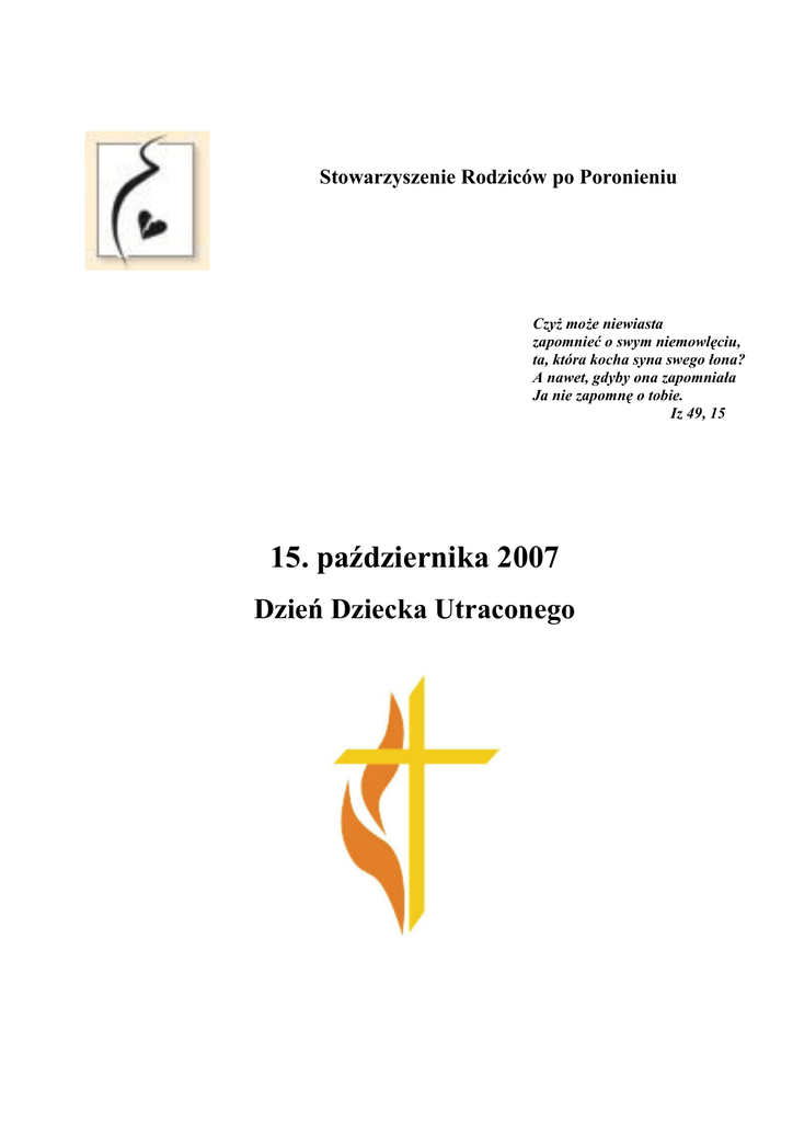 Stowarzyszenie Rodziców po Poronieniu Czyż może niewiasta zapomnieć o swym niemowlęciu, ta, która kocha syna swego łona? A nawet, gdyby ona zapomniała Ja nie zapomnę o tobie. Iz 49, 15 15. października 2007 Dzień Dziecka Utraconego Stowarzyszenie Rodziców po Poronieniu – www.poronienie.pl Spis treści 1. Wprowadzenie 2. Komentarze do czytań niedzielnych października z propozycją modlitw powszechnych 3. Modlitwy rodziców po stracie 4. Pomoc w przypadku poronienia, czyli co ksiądz o poronieniu wiedzieć powinien 5. Miejsca wsparcia dla rodziców po poronieniu 6. Wizytówki z adresem strony Stowarzyszenia Rodziców po Poronieniu (do wydrukowania) 7. Plakat informujący o mszy św. W intencji zmarłych dzieci ich rodziców (do wydrukowania) 1. Wprowadzenie Sprawa jest pozornie prosta, dzieci się ma albo nie ma. Jednak jest spora grupa rodziców, która dzieci ma i jednocześnie nie ma. Mowa o osieroconych rodzicach, tych, którym dzieci zmarły. W Polsce co roku około 2 tysiące dzieci rodzi się martwo, 40 tysięcy kobiet doświadcza poronienia, ..... dzieci nie dożywa 18. urodzin. Te liczby gdzieś giną w naszej świadomości i wciąż w nas za mało refleksji, że za każdą z tych liczb kryje się czyjaś tragedia. Towarzyszenie innym w cierpieniu nie jest łatwe... A przecież w ten sposób można okazać miłość bliźniego. "Byłem głodny... byłem spragniony..." powie każdemu z nas na końcu czasów Jezus. Tym bardziej, że wszyscy dostrzegając wartość życia człowieka od pierwszych chwil jego istnienia, zapominają o tych tysiącach ludzi, którzy odchodzą zanim się narodzą lub krótko po nim, a tym samym o ogromie cierpienia osamotnionych rodziców. Od wielu lat miesiąc październik w Stanach Zjednoczonych oraz w krajach Europy Zachodniej obchodzony jest jako miesiąc pamięci dzieci zmarłych, a 15 października obchodzony jako Dzień Dziecka Utraconego. Od kilku lat organizacje, które pomagają polskim rodzicom po stracie, starają się ten zwyczaj przenieść na grunt naszej rzeczywistości. W całej Polsce organizowane są Msze święte w intencji zmarłych dzieci i ich rodziców. Wszystkim nam potrzebna jest modlitwa, szczególnie tym, którzy cierpią. Jeśli komuś wydaje się, że nie może nic zrobić dla rodziców doświadczających śmierci dziecka, to choć to jedno można ofiarować zawsze - modlitwę. Miesiąc październik poświęcony jest Maryi - ona również stała i patrzyła, jak umiera jej Ukochane Dziecko. Niech Maryja, Matka Bolesna, uczy nas jak wspierać innych w cierpieniu. Stowarzyszenie Rodziców po Poronieniu także i w tym roku przygotowało rozważania do czytań na niedziele października. Mamy nadzieję, że to wspólne pochylenie się nad tekstami biblijnymi przyniesie błogosławione owoce. Do każdej niedzieli zostały ułożone także wezwania modlitwy powszechnej. Do rozważań dołączone zostały także propozycje modlitw za dzieci zmarłe przed narodzeniem, które można wykorzystać w pracy duszpasterskiej. Umieściliśmy też tekst przygotowany z myślą o księżach, w którym w skrócie opisane zostały różne pojawiające się problemy po stracie dziecka w trakcie ciąży. Informujemy także o możliwościach udzielenia osieroconym rodzicom wsparcia. 2 Stowarzyszenie Rodziców po Poronieniu – www.poronienie.pl 2. Komentarze powszechnych do czytań niedzielnych października z propozycją modlitw 7. października 2007, 27. niedziela w ciągu roku, cykl czytań niedzielnych C, I: Ha 1,2-3; 2,2-4 Ps: 95(94) Ref: Słysząc głos Pana, serc nie zatwardzajcie. II: 2 Tm 1,6-8.13-14 Akl: 1. P 1, 25 Słowo Pana trwa na wieki, to słowo ogłoszono wam jako Dobrą Nowinę. Ew: Łk 17, 5-10 Rozważanie "Krzywda mi się dzieje", a Ty nie pomagasz? Chyba każdy z nas potrafi znaleźć takie wydarzenia w swoim życiu, które utożsamiałyby się ze skargą autora pierwszego czytania. "Krzywda mi się dzieje..." Te słowa stawiają nas również wobec problemu cierpienia w naszym życiu, szczególnie tego niezawinionego. Czy nie za często tłumaczymy sobie jego obecność działaniem Boga? "Bóg tak chciał, Bogu nie zadaje się pytań dlaczego..." Brak skargi czy pytań ma być przejawem wiary, ale czy tak jest rzeczywiście? Autor natchniony widząc krzywdę idzie do Boga i czyni Mu wyrzuty, rozmawia z Nim, bo ten Bóg jest dla niego Kimś bliskim, na kogo może liczyć, czyjej pomocy może się spodziewać. Idzie do Boga, bo wiemy, że Jemu zależy na nim, pokrzywdzonym przez innych. O cierpieniu myślimy często jako próbie wiary, ale nierozsądne byłoby patrzenie na Boga, jako Tego, który chce naszego cierpienia, chce nas sprawdzić, czy dokręcić przysłowiową śrubę. Jednym z trudniejszych wydarzeń w naszym życiu jest śmierć kogoś bliskiego. Inaczej jest, gdy odchodzi ktoś starszy po spełnionym życiu, inaczej, gdy młody człowiek ginie w wypadku samochodowym, inaczej jeszcze gdy rodzic staje wobec śmierci dziecka. Ten miesiąc , który niedawno się rozpoczął, poświęcony jest pamięci zmarłych dzieci. Choć nieobecne - są z nami nieustannie... Dla wielu osób śmierć dziecka jest takim doświadczeniem, że ich wiara tego nie wytrzymuje. A jak jest z nami, którzy nie doświadczyli śmierci dziecka? Czy to nie jest tak, że odczuwamy ulgę, że to nie nas spotkało nieszczęście? W jakimś sensie nie zrozumiemy do końca, co się dzieje się w sercu rodzica. Dlatego też wraca pytanie, czy możemy jakoś pomóc? znaleźć słowa pociechy tam, gdzie ich nie ma? Wyśpiewany kilka minut temu psalm daje nam podpowiedź, co my możemy zrobić dla tych, którzy doświadczają wielkiego cierpienia: słysząc głos Pana, serc nie zatwardzajcie. Jak trudno czasami nie zatwardzić serca... Niech te słowa będą wezwaniem do modlitwy, abyśmy wobec krzywdy, naszej czy cudzej, nie zatwardzili serc, aby ci, którzy cierpią nie zatwardzili serc. Szczególnie za tych się módlmy, którzy przygię