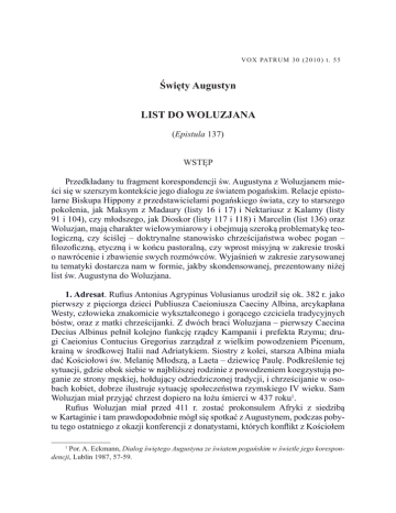 V O X PAT R U M 3 0 ( 2 0 1 0 ) t . 5 5 Święty Augustyn LIST DO WOLUZJANA (Epistula 137) WSTĘP Przedkładany tu fragment korespondencji św. Augustyna z Woluzjanem mieści się w szerszym kontekście jego dialogu ze światem pogańskim. Relacje epistolarne Biskupa Hippony z przedstawicielami pogańskiego świata, czy to starszego pokolenia, jak Maksym z Madaury (listy 16 i 17) i Nektariusz z Kalamy (listy 91 i 104), czy młodszego, jak Dioskor (listy 117 i 118) i Marcelin (list 136) oraz Woluzjan, mają charakter wielowymiarowy i obejmują szeroką problematykę teologiczną, czy ściślej – doktrynalne stanowisko chrześcijaństwa wobec pogan – filozoficzną, etyczną i w końcu pastoralną, czy wprost misyjną w zakresie troski o nawrócenie i zbawienie swych rozmówców. Wyjaśnień w zakresie zarysowanej tu tematyki dostarcza nam w formie, jakby skondensowanej, prezentowany niżej list św. Augustyna do Woluzjana. 1. Adresat. Rufius Antonius Agrypinus Volusianus urodził się ok. 382 r. jako pierwszy z pięciorga dzieci Publiusza Caeioniusza Caeciny Albina, arcykapłana Westy, człowieka znakomicie wykształconego i gorącego czciciela tradycyjnych bóstw, oraz z matki chrześcijanki. Z dwóch braci Woluzjana – pierwszy Caecina Decius Albinus pełnił kolejno funkcję rządcy Kampanii i prefekta Rzymu; drugi Caeionius Contucius Gregorius zarządzał z wielkim powodzeniem Picenum, krainą w środkowej Italii nad Adriatykiem. Siostry z kolei, starsza Albina miała dać Kościołowi św. Melanię Młodszą, a Laeta – dziewicę Paulę. Podkreślenie tej sytuacji, gdzie obok siebie w najbliższej rodzinie z powodzeniem koegzystują poganie ze strony męskiej, hołdujący odziedziczonej tradycji, i chrześcijanie w osobach kobiet, dobrze ilustruje sytuację społeczeństwa rzymskiego IV wieku. Sam Woluzjan miał przyjąć chrzest dopiero na łożu śmierci w 437 roku1. Rufius Woluzjan miał przed 411 r. zostać prokonsulem Afryki z siedzibą w Kartaginie i tam prawdopodobnie mógł się spotkać z Augustynem, podczas pobytu tego ostatniego z okazji konferencji z donatystami, których konflikt z Kościołem Por. A. Eckmann, Dialog świętego Augustyna ze światem pogańskim w świetle jego korespondencji, Lublin 1987, 57-59. 1 884 PRZEKŁADY godził nie tylko w jedność katolicką, ale również zagrażał spójności państwa rzymskiego, dodatkowo zagrożonego wtedy od zewnątrz najazdami Gotów. Wymiana korespondencji Augustyna z Woluzjanem obejmuje pięć listów2, a mianowicie: list 135 Woluzjana do Augustyna oraz list 136 autorstwa Marcelina, ale podejmujący zasadniczo kwestie wcześniej sformułowane przez Woluzjana pod adresem biskupa Hippony, a także listy 132, 137 i 138 Augustyna do Woluzjana. List 137, który jest przedmiotem naszego zainteresowania, stanowi odpowiedź na pytania Woluzjana, zawarte w liście 135, i z dużym prawdopodobieństwem można go datować na przełom 411-412 roku. W zakresie stawianych pytań i sposobu rozumowania Woluzjana nie bez znaczenia było środowisko, w którym dojrzewał i przebywał, filarów antychrześcijańskiej, pogańskiej reakcji i głównych obrońców starej rzymskiej tradycji. W lekturze Saturnaliów Makrobiusza w pełni ujawnia się duch rzymskiego konserwatyzmu, pełnego pietyzmu dla starej religii i dawnej poezji w dziełach Wergiliusza, jak i atencji dla platonizmu ich wieku, w osobach Plotyna i Porfiriusza, w poglądach których mogli w pełni realizować swoje ambicje intelektualne, czego w szczególności, w ich opinii, brakowało chrześcijaństwu. Nosicielami tej kultury, spośród współczesnych Woluzjanowi postaci, byli Symmach3 – mówca rzymski oraz zwolennik kultury i religii rzymskiej, a w szczególności jego własny ojciec Albin i przedstawiony również w dziele Makrobiusza ekspert od spraw religijnych Praetextatus. 2. Problematyka listu. W klasyfikacji korespondencji św. Augustyna, dokonanej przez W. Eborowicza4, list 137 od strony formy jako litterae, obok używanych nazw epistula lub liber, czasami ogólnie – scriptura, bądź jak w Sprostowaniach, w przypadku pisma do Hieronima – opus5, zostaje ulokowany jako synonim rozmowy. Od strony celu natomiast, umieszczony wśród listów literackich, klasyfikuje się jako odpowiedź na przedkładane pytania. Ta uwaga ma tu o tyle znaczenie, że plan całego listu, wyjąwszy względy kurtuazji i zaprezentowania kunsztu wybitnego profesora wymowy (n. 1 i n. 3), jest ostatecznie podporządkowany odpowiedzi na postawione pytania, a samo odpowiadanie służy w dużej mierze perswazji. Pytania zaś dotyczą (n. 2): narodzenia Jezusa Chrystusa z dziewicy, wcielenia trudnego do pogodzenia z boską transcendencją oraz cudów Pana Jezusa. Rozumiejąc taką konwencję omawianego listu, poruszone w nim zagadnienia dają Por. tamże, s. 60. Symmachus, Quintus Aureliusz (ok. 345-405) był prefektem Rzymu w latach 384-385 i konsulem w 391 roku. Jako mówca jest autorem mów i listów, z których zachowało się około 9000. Styl jego pisarstwa odznaczał się wyszukaną elegancją i wytwornością. Wzmianka o nim jest tu podyktowana zarówno faktem jego pozycji lidera w gronie przeciwników chrześcijaństwa, jak i uwagą samego Augustyna o nim. Otóż Symmach, jako prefekt Rzymu, miał rekomendować Augustyna na posadę nauczyciela retoryki do Mediolanu, por. Augustinus, Confessiones V 13, tłum. Z. Kubiak: Św. Augustyn, Wyznania, Warszawa 1978, 83; zob. też Słownik pisarzy antycznych, Warszawa 1991, 440. 4 Por. Wstęp, w: Św. Augustyn, Listy, tłum. W. Eborowicz, Pelplin 1991, 11-12. 5 Por. Augustinus, Retractationes II 45, PL 32, 649 lub CCL 57, 126-127. 2 3 PRZEKŁADY 885 się pogrupować w pewne bloki tematyczne: zagadnień teologicznych – nieograniczoność Boga (nn. 4-7), wielkość Bożej mocy (n. 8), wcielenie Słowa (nn. 9-11), Chrystus Pośrednik między Bogiem a człowiekiem (n. 12), cuda Chrystusa a cuda proroków i magów (nn. 13-14); zagadnień f