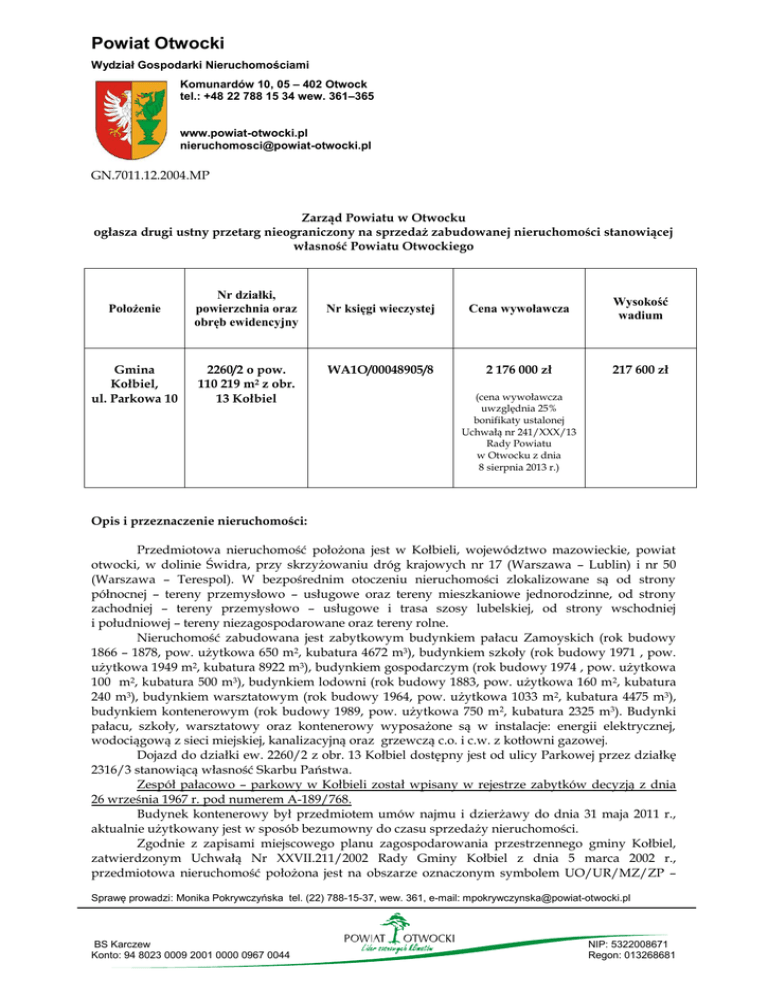 Powiat Otwocki Wydział Gospodarki Nieruchomościami Komunardów 10, 05 – 402 Otwock tel.: +48 22 788 15 34 wew. 361–365 www.powiat-otwocki.pl [email protected] GN.7011.12.2004.MP Zarząd Powiatu w Otwocku ogłasza drugi ustny przetarg nieograniczony na sprzedaż zabudowanej nieruchomości stanowiącej własność Powiatu Otwockiego Położenie Nr działki, powierzchnia oraz obręb ewidencyjny Gmina Kołbiel, ul. Parkowa 10 2260/2 o pow. 110 219 m2 z obr. 13 Kołbiel Nr księgi wieczystej Cena wywoławcza Wysokość wadium WA1O/00048905/8 2 176 000 zł 217 600 zł (cena wywoławcza uwzględnia 25% bonifikaty ustalonej Uchwałą nr 241/XXX/13 Rady Powiatu w Otwocku z dnia 8 sierpnia 2013 r.) Opis i przeznaczenie nieruchomości: Przedmiotowa nieruchomość położona jest w Kołbieli, województwo mazowieckie, powiat otwocki, w dolinie Świdra, przy skrzyżowaniu dróg krajowych nr 17 (Warszawa – Lublin) i nr 50 (Warszawa – Terespol). W bezpośrednim otoczeniu nieruchomości zlokalizowane są od strony północnej – tereny przemysłowo – usługowe oraz tereny mieszkaniowe jednorodzinne, od strony zachodniej – tereny przemysłowo – usługowe i trasa szosy lubelskiej, od strony wschodniej i południowej – tereny niezagospodarowane oraz tereny rolne. Nieruchomość zabudowana jest zabytkowym budynkiem pałacu Zamoyskich (rok budowy 1866 – 1878, pow. użytkowa 650 m2, kubatura 4672 m3), budynkiem szkoły (rok budowy 1971 , pow. użytkowa 1949 m2, kubatura 8922 m3), budynkiem gospodarczym (rok budowy 1974 , pow. użytkowa 100 m2, kubatura 500 m3), budynkiem lodowni (rok budowy 1883, pow. użytkowa 160 m 2, kubatura 240 m3), budynkiem warsztatowym (rok budowy 1964, pow. użytkowa 1033 m 2, kubatura 4475 m3), budynkiem kontenerowym (rok budowy 1989, pow. użytkowa 750 m 2, kubatura 2325 m3). Budynki pałacu, szkoły, warsztatowy oraz kontenerowy wyposażone są w instalacje: energii elektrycznej, wodociągową z sieci miejskiej, kanalizacyjną oraz grzewczą c.o. i c.w. z kotłowni gazowej. Dojazd do działki ew. 2260/2 z obr. 13 Kołbiel dostępny jest od ulicy Parkowej przez działkę 2316/3 stanowiącą własność Skarbu Państwa. Zespół pałacowo – parkowy w Kołbieli został wpisany w rejestrze zabytków decyzją z dnia 26 września 1967 r. pod numerem A-189/768. Budynek kontenerowy był przedmiotem umów najmu i dzierżawy do dnia 31 maja 2011 r., aktualnie użytkowany jest w sposób bezumowny do czasu sprzedaży nieruchomości. Zgodnie z zapisami miejscowego planu zagospodarowania przestrzennego gminy Kołbiel, zatwierdzonym Uchwałą Nr XXVII.211/2002 Rady Gminy Kołbiel z dnia 5 marca 2002 r., przedmiotowa nieruchomość położona jest na obszarze oznaczonym symbolem UO/UR/MZ/ZP – Sprawę prowadzi: Monika Pokrywczyńska tel. (22) 788-15-37, wew. 361, e-mail: [email protected] BS Karczew Konto: 94 8023 0009 2001 0000 0967 0044 NIP: 5322008671 Regon: 013268681 tereny ponadpodstawowych usług oświaty oraz mieszkalnictwa zbiorowego z zielenią parkową i jest objęta strefą ochrony konserwatorskiej A. Pierwszy przetarg na sprzedaż nieruchomości odbył się w dniu 16 grudnia 2016 r. Na konto depozytowe Starostwa nie wpłynęło żadne wadium w związku z czym przetarg zakończył się wynikiem negatywnym. Drugi ustny przetarg nieograniczony na sprzedaż nieruchomości odbędzie się w dniu 19 kwietnia 2017 r. o godz. 10 00 w siedzibie Starostwa Powiatowego w Otwocku przy ul. Górnej 13 – pokój nr 121 (sala konferencyjna). Wadium należy wpłacić w pieniądzu w wysokości podanej w tabeli najpóźniej do dnia 14 kwietnia 2017 r. na niżej podany numer konta depozytowego Starostwa Powiatowego w Otwocku: nr 40 8023 0009 2001 0000 0967 0046. Sprzedaż nieruchomości nastąpi według stanu granic ujawnionych w operacie ewidencji gruntów i budynków. Nabywca przejmuje nieruchomość w stanie istniejącym. Z chwilą przeniesienia prawa własności do nieruchomości Nabywca przejmuje obowiązki w zakresie utrzymania i zabezpieczenia zabytku. Zgodnie z art. 36 ust. 1 ustawy z dnia 23 lipca 2003 r. o ochronie zabytków i opiece nad zabytkami (tekst jedn. Dz. U. z 2014 r. poz. 1446), zmiana sposobu korzystania z nieruchomości zabytkowej oraz wszelkie działania z nią związane wymagają pozwolenia wojewódzkiego konserwatora zabytków. Zalecenia konserwatorskie, ujęte w piśmie Mazowieckiego Wojewódzkiego Konserwatora Zabytków z dnia 3 lutego 2015 r. (znak: WN.5173.7.2014.MP), zostaną zapisane w notarialnej umowie sprzedaży nieruchomości i nakładają na nabywcę nieruchomości obowiązek przeprowadzenia w określonym terminie prac konserwatorskich przy zabytku, tj.: 1. Wymagane jest zachowanie historycznego układu przestrzennego założenia parkowego, zabytkowych budynków pałacu i lodowni, stawu i zieleni parkowej. 2. Ze względu na stan zachowania zabytkowych budynków i parku krajobrazowego z cennym starodrzewem, niezbędne jest przeprowadzenie w określonych terminach następujących prac konserwatorskich: przed upływem 1 roku od daty nabycia nieruchomości nabywca ma obowiązek po rozpoznaniu stanu technicznego obiektu, przeprowadzić prace zabezpieczające w budynku pałacu, zwłaszcza tarasu w elewacji ogrodowej. przed upływem 4 lat od daty nabycia nieruchomości nabywca ma obowiązek przeprowadzić prace remontowo-konserwatorskie budynku pałacu w oparciu o uzgodniony z MWKZ program prac, określający zakres i sposób ich prowadzenia oraz wskazujący niezbędne do zastosowania materiały i technologie, oraz program zagospodarowania zabytku nieruchomego i dalszego korzystania z tego zabytku z uwzględnieniem wyeksponowania jego wartości (zgodnie z art. 25 ust. 1 pkt 2 i 3 ustawy o ochronie zabytków i opiece nad zabytkami). Ze względu na stan techniczny obiektu wymagane jest przeprowadzenie kompleksowych prac remontowo-konserwatorskich fundamentów, elewacji, stropów, dachu, stolarki okiennej i drzwiowej, tarasu w elewacji południowej. przed 