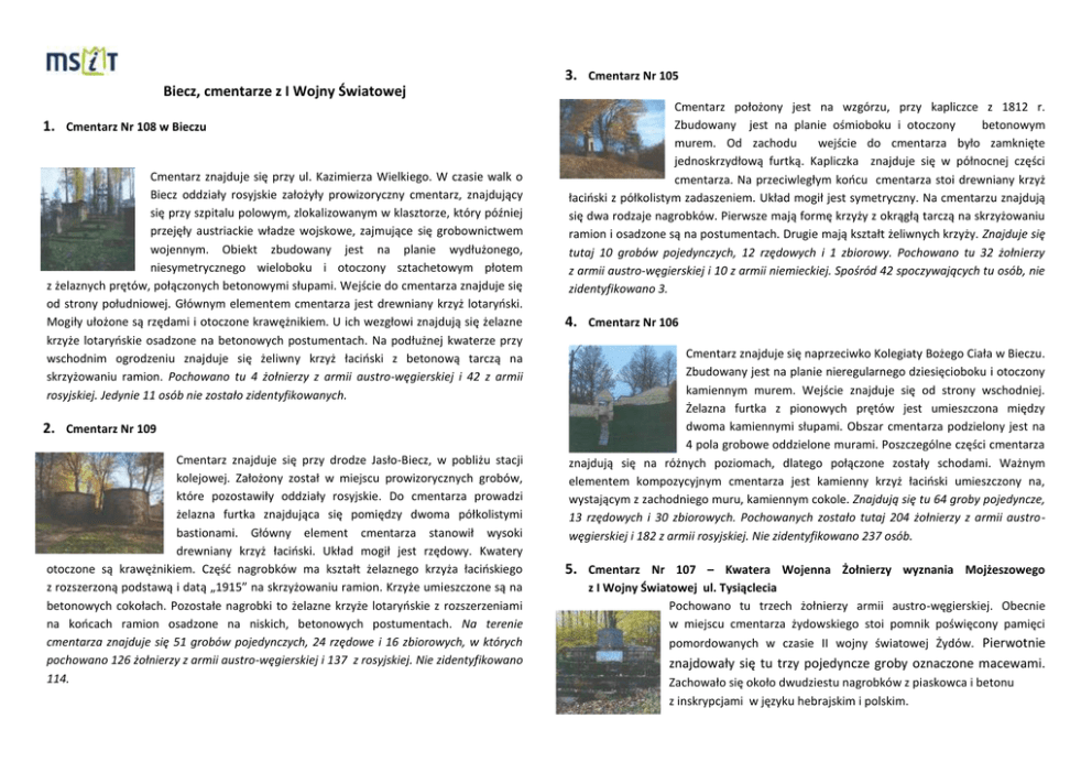 3. Cmentarz Nr 105 Biecz, cmentarze z I Wojny Światowej 1. Cmentarz Nr 108 w Bieczu Cmentarz znajduje się przy ul. Kazimierza Wielkiego. W czasie walk o Biecz oddziały rosyjskie założyły prowizoryczny cmentarz, znajdujący się przy szpitalu polowym, zlokalizowanym w klasztorze, który później przejęły austriackie władze wojskowe, zajmujące się grobownictwem wojennym. Obiekt zbudowany jest na planie wydłużonego, niesymetrycznego wieloboku i otoczony sztachetowym płotem z żelaznych prętów, połączonych betonowymi słupami. Wejście do cmentarza znajduje się od strony południowej. Głównym elementem cmentarza jest drewniany krzyż lotaryński. Mogiły ułożone są rzędami i otoczone krawężnikiem. U ich wezgłowi znajdują się żelazne krzyże lotaryńskie osadzone na betonowych postumentach. Na podłużnej kwaterze przy wschodnim ogrodzeniu znajduje się żeliwny krzyż łaciński z betonową tarczą na skrzyżowaniu ramion. Pochowano tu 4 żołnierzy z armii austro-węgierskiej i 42 z armii rosyjskiej. Jedynie 11 osób nie zostało zidentyfikowanych. 2. Cmentarz Nr 109 Cmentarz znajduje się przy drodze Jasło-Biecz, w pobliżu stacji kolejowej. Założony został w miejscu prowizorycznych grobów, które pozostawiły oddziały rosyjskie. Do cmentarza prowadzi żelazna furtka znajdująca się pomiędzy dwoma półkolistymi bastionami. Główny element cmentarza stanowił wysoki drewniany krzyż łaciński. Układ mogił jest rzędowy. Kwatery otoczone są krawężnikiem. Część nagrobków ma kształt żelaznego krzyża łacińskiego z rozszerzoną podstawą i datą „1915” na skrzyżowaniu ramion. Krzyże umieszczone są na betonowych cokołach. Pozostałe nagrobki to żelazne krzyże lotaryńskie z rozszerzeniami na końcach ramion osadzone na niskich, betonowych postumentach. Na terenie cmentarza znajduje się 51 grobów pojedynczych, 24 rzędowe i 16 zbiorowych, w których pochowano 126 żołnierzy z armii austro-węgierskiej i 137 z rosyjskiej. Nie zidentyfikowano 114. Cmentarz położony jest na wzgórzu, przy kapliczce z 1812 r. Zbudowany jest na planie ośmioboku i otoczony betonowym murem. Od zachodu wejście do cmentarza było zamknięte jednoskrzydłową furtką. Kapliczka znajduje się w północnej części cmentarza. Na przeciwległym końcu cmentarza stoi drewniany krzyż łaciński z półkolistym zadaszeniem. Układ mogił jest symetryczny. Na cmentarzu znajdują się dwa rodzaje nagrobków. Pierwsze mają formę krzyży z okrągłą tarczą na skrzyżowaniu ramion i osadzone są na postumentach. Drugie mają kształt żeliwnych krzyży. Znajduje się tutaj 10 grobów pojedynczych, 12 rzędowych i 1 zbiorowy. Pochowano tu 32 żołnierzy z armii austro-węgierskiej i 10 z armii niemieckiej. Spośród 42 spoczywających tu osób, nie zidentyfikowano 3. 4. Cmentarz Nr 106 Cmentarz znajduje się naprzeciwko Kolegiaty Bożego Ciała w Bieczu. Zbudowany jest na planie nieregularnego dziesięcioboku i otoczony kamiennym murem. Wejście znajduje się od strony wschodniej. Żelazna furtka z pionowych prętów jest umieszczona między dwoma kamiennymi słupami. Obszar cmentarza podzielony jest na 4 pola grobowe oddzielone murami. Poszczególne części cmentarza znajdują się na różnych poziomach, dlatego połączone zostały schodami. Ważnym elementem kompozycyjnym cmentarza jest kamienny krzyż łaciński umieszczony na, wystającym z zachodniego muru, kamiennym cokole. Znajdują się tu 64 groby pojedyncze, 13 rzędowych i 30 zbiorowych. Pochowanych zostało tutaj 204 żołnierzy z armii austrowęgierskiej i 182 z armii rosyjskiej. Nie zidentyfikowano 237 osób. 5. Cmentarz Nr 107 – Kwatera Wojenna Żołnierzy wyznania Mojżeszowego z I Wojny Światowej ul. Tysiąclecia Pochowano tu trzech żołnierzy armii austro-węgierskiej. Obecnie w miejscu cmentarza żydowskiego stoi pomnik poświęcony pamięci pomordowanych w czasie II wojny światowej Żydów. Pierwotnie znajdowały się tu trzy pojedyncze groby oznaczone macewami. Zachowało się około dwudziestu nagrobków z piaskowca i betonu z inskrypcjami w języku hebrajskim i polskim.