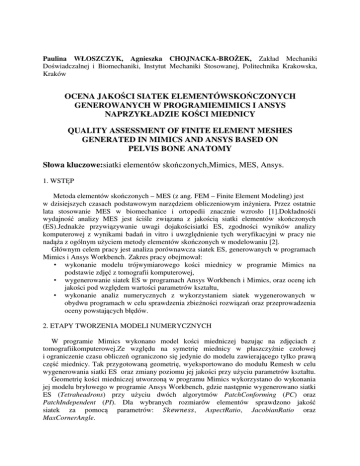 Paulina WŁOSZCZYK, Agnieszka CHOJNACKA-BROŻEK, Zakład Mechaniki Doświadczalnej i Biomechaniki, Instytut Mechaniki Stosowanej, Politechnika Krakowska, Kraków OCENA JAKOŚCI SIATEK ELEMENTÓWSKOŃCZONYCH GENEROWANYCH W PROGRAMIEMIMICS I ANSYS NAPRZYKŁADZIE KOŚCI MIEDNICY QUALITY ASSESSMENT OF FINITE ELEMENT MESHES GENERATED IN MIMICS AND ANSYS BASED ON PELVIS BONE ANATOMY Słowa kluczowe:siatki elementów skończonych,Mimics, MES, Ansys. 1. WSTĘP Metoda elementów skończonych – MES (z ang. FEM – Finite Element Modeling) jest w dzisiejszych czasach podstawowym narzędziem obliczeniowym inżyniera. Przez ostatnie lata stosowanie MES w biomechanice i ortopedii znacznie wzrosło [1].Dokładnośći wydajność analizy MES jest ściśle związana z jakością siatki elementów skończonych (ES).Jednakże przywiązywanie uwagi dojakościsiatki ES, zgodności wyników analizy komputerowej z wynikami badań in vitro i uwzględnienie tych weryfikacyjni w pracy nie nadąża z ogólnym użyciem metody elementów skończonych w modelowaniu [2]. Głównym celem pracy jest analiza porównawcza siatek ES, generowanych w programach Mimics i Ansys Workbench. Zakres pracy obejmował: • wykonanie modelu trójwymiarowego kości miednicy w programie Mimics na podstawie zdjęć z tomografii komputerowej, • wygenerowanie siatek ES w programach Ansys Workbench i Mimics, oraz ocenę ich jakości pod względem wartości parametrów kształtu, • wykonanie analiz numerycznych z wykorzystaniem siatek wygenerowanych w obydwu programach w celu sprawdzenia zbieżności rozwiązań oraz przeprowadzenia oceny powstających błędów. 2. ETAPY TWORZENIA MODELI NUMERYCZNYCH W programie Mimics wykonano model kości miedniczej bazując na zdjęciach z tomografiikomputerowej.Ze względu na symetrię miednicy w płaszczyźnie czołowej i ograniczenie czasu obliczeń ograniczono się jedynie do modelu zawierającego tylko prawą część miednicy. Tak przygotowaną geometrię, wyeksportowano do modułu Remesh w celu wygenerowania siatki ES oraz zmiany poziomu jej jakości przy użyciu parametrów kształtu. Geometrię kości miedniczej utworzoną w programu Mimics wykorzystano do wykonania jej modelu bryłowego w programie Ansys Workbench, gdzie następnie wygenerowano siatki ES (Tetraheadrons) przy użyciu dwóch algorytmów PatchConforming (PC) oraz PatchIndependent (PI). Dla wybranych rozmiarów elementów sprawdzono jakość siatek za pomocą parametrów: ܵ݇݁ݏݏ݁݊ݓ, AspectRatio, JacobianRatio oraz MaxCornerAngle. XII Konferencja Naukowa Majówka Młodych Biomechaników im. prof. Dagmary Tejszerskiej s. 148 3. WYTRZYMAŁOŚCIOWA ANALIZA NUMERYCZNA W celu wykonania analizy numerycznej siatki wygenerowane w programie Mimics zaimportowano do programu Ansys. Następnie zdefiniowano miejsca utwierdzenia i obciążenia analogicznie jak dla modelu wykonanego w programie Ansys. Zadano prosty schemat statyczny układu z uwagi na fakt, iż głównym zadaniem pracy było określenie wpływu jakości wygenerowanych siatek ES na poprawność wyników. Dla wszystkich siatek wykonano obliczenia numeryczne analizując rozkłady i wartości naprężenia zredukowanego wg hipotezy Hubera-Misesa-Hencky’ego (σH-M-H) oraz błędu energetycznego (SERR) w odniesieniu do parametru Skewness. Rys. 1. Wykres zależności pomiędzy wartością maksymalną parametru Skewness, a maksymalną wartością σHMH 4. WNIOSKI Przeprowadzając analizę numeryczną dla zmodyfikowanych siatek wygenerowanych w programie Mimics uzyskujemy rozwiązania o niewielkiej rozbieżności. Siatki generowane w programie Ansys Workbench algorytmem PI, w przypadku tego zagadnienia, wykazywały znacznie lepszą jakość niż wykonywane z wykorzystaniem algorytmu PC. Ponadto okazuje się, że siatki wykonane w programie Ansys o bardzo dobrej jakości, ale dużej liczbie elementów generują znacząco wyższe wartości naprężenia σH-M-H. Uzyskane wyniki są bardziej wrażliwe na liczbę elementów niż na wartości parametrów kształtu, dlatego oceniając ich poprawność nie można kierować się jedynie jakością elementów siatki. Omówione powyżej zależności przedstawione zostały na wykresie(rys. 1). LITERATURA [1] Bielski J.: Wprowadzenie do inżynierskich zastosowań MES, Politechnika Krakowska im. Tadeusza Kościuszki, Kraków, 2010. [2] Burkhart T.A., Andrews D.M., Dunning C.E. : Finite element modeling mesh quality, energy balance and validation methods: A review with recommendations associated with the modeling of bone tissue, Journal of biomechanics, 9, 46, 2013, s. 1477-1488.