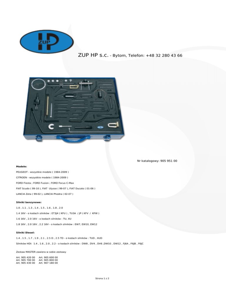 ZUP HP s.c. - Bytom, Telefon: +48 32 280 43 66 Nr katalogowy: 905 951 00 Modele: PEUGEOT - wszystkie modele ( 1984-2009 ) CITROEN - wszystkie modele ( 1984-2009 ) FORD Fiesta ; FORD Fusion ; FORD Focus C-Max FIAT Scudo ( 99-10 ), FIAT Ulysse ( 99-07 ), FIAT Ducato ( 01-06 ) LANCIA Zeta ( 99-02 ), LANCIA Phedra ( 02-07 ) Silniki benzynowe: 1.0 , 1.1 , 1.3 , 1.4 , 1.5 , 1.6 , 1.8 , 2.0 1.4 16V - o kodach silników : ET3J4 ( KFU ) , TU3A / JP ( KFV / KFW ) 1.6 16V , 2.0 16V - o kodach silników : TU, XU 1.8 16V , 2.0 16V , 2.2 16V - o kodach silników : EW7, EW10, EW12 Silniki Diesel: 1.4 , 1.5 , 1.7 , 1.9 , 2.1 , 2.5 D , 2.5 TD - o kodach silników : TUD , XUD Silników HDI: 1.4 , 1.6 , 2.0 , 2.2 - o kodach silników : DW8 , DV4 , DV6 ,DW10 , DW12 , FJ6A , F6JB , F6JC Zestaw MASTER zawiera w sobie zestawy Art. 905 420 00 Art. 905 600 00 Art. 905 700 00 Art. 905 800 00 Art. 905 430 00 Art. 907 180 00 Strona 1 z 2 W skład zestawu wchodzą (OEM) narzędzia fabryczne: 0117Ar , 0132AJ1 , 0132AJ2 , 0132AK , 0132P , 0132Q , 0132QZ , 0132QY , 0132R , 0132RZ , 0132X1Z , 0134Q , 0153A , 0153AA , 0153AB , 0153AF , 0153AK , 0153AL , 0153G , 0153M , 0153N , 0153U , 0178A , 0178B , 0178C , 0178D , 0178E , 0178T , 0188-E , 0188-F , 0188-H , 0188-J1 , 0188-J2 , 0188-K , 0188-M , 0188-P , 0188-X , 0188-Y , 0189-A , 0189-AZ , 0189-B , 0189-C , 0189-J , 0189-K , 0189-L , 0189-R , 0189-S1 , 0189-S2 , 0194-B , 0194-C , 4200TH , 4507-TA , 4507-TJ , 4507-TL , 4527-TS1 , 4527-TS2 , 4533-TAC1, 4533-TAC2 , 4533-TAD , 5711-TA , 5711-TB , 5711-TC , 5711-TD , 5711-TE , 6012-T , 7004-TG , 7014-TJ , 7014-TM , 4014-TN , 7017-TR , 7017-TU , 7018-TY , 7019T , 7044-T , 9004-T , 9022-TM , 9041-TZ , 9044-T , 9765.54 , 9766.98 , 9767.27 , 9767.34 , 9767.89 , 9767.94 , D86 , M8 Bolts , 1860617000 , 1860638000 Strona 2 z 2
