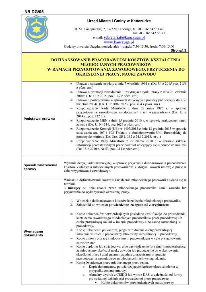 NR DG/05 Urząd Miasta i Gminy w Kańczudze Ul. M. Konopnickiej 2, 37-220 Kańczuga, tel. /0 – 16/ 642 31 42, fax. /0 – 16/ 642 66 30 e-mail: [email protected] www.kanczuga.pl Godziny otwarcia Urzędu: poniedziałek – piątek: 7.30-15.30, środa: 7.00-15.00 Strona1/2 DOFINANSOWANIE PRACODAWCOM KOSZTÓW KSZTAŁCENIA MŁODOCIANYCH PRACOWNIKÓW W RAMACH PRZYGOTOWANIA ZAWODOWEGO, PRZYUCZENIA DO OKRESLONEJ PRACY, NAUKI ZAWODU • • • • Podstawa prawna • • • Sposób załatwienia sprawy Ustawa o systemie oświaty z dnia 7 września 1991 r. (Dz. U. z 2015 poz. 2156 z późn. zm.) Ustawa o promocji zatrudnienia i instytucjach rynku pracy z dnia 20 kwietnia 2004r. (Dz. U. z 2015, poz. 149 z późn. zm.) Ustawa o postępowaniu w sprawach dotyczących pomocy publicznej z dnia 30 kwietnia 2004r. (Dz. U. z 2007 Nr 59, poz. 404 z późn. zm.) Rozporządzenie Rady Ministrów z dnia 28 maja 1996 r. w sprawie przygotowania zawodowego młodocianych i ich wynagradzania (Dz. U. z 2014 r., poz. 232 t.j) Rozporządzenie MEN z dnia 15 grudnia 2010 r. w sprawie praktycznej nauki zawodu (Dz. U. Nr 244, poz.1626 z późn. zm.) Rozporządzenie Komisji (UE) nr 1407/2013 z dnia 18 grudnia 2013 w sprawie stosowania art. 107 i 108 Traktatu o funkcjonowaniu Unii Europejskiej do pomocy de minimis (Dz. Urz. UE L 352 z 24.12.2013, str .1) Rozporządzenie Rady Ministrów z 29 marca 2010 r. w sprawie zakresu informacji przedstawianych przez podmiot ubiegający się o pomoc de minimis (Dz. U. z 2010 r. Nr 53, poz. 311 z późn.zm.) Wydanie decyzji administracyjnej w sprawie przyznania dofinansowania pracodawcom kosztów kształcenia młodocianych pracowników, z którymi zawarli umowę o pracę w celu przygotowania zawodowego. Wnioski o dofinansowanie kosztów kształcenia młodocianego pracownika składa się w terminie 3 miesięcy od dnia zdania przez młodocianego pracownika nauki zawodu lub przyuczenia do wykonywania określonej pracy. Wymagane dokumenty 1. 2. Wniosek o dofinansowanie kosztów kształcenia młodocianego pracownika, Załączniki do wniosku potwierdzone za zgodność z oryginałem: • Kopie dokumentów potwierdzających posiadane kwalifikacje do prowadzenia kształcenia zawodowego młodocianych pracowników przez pracodawcę lub osobę prowadzącą zakład w imieniu pracodawcy albo osobę zatrudnioną u pracodawcy, Kopię dokumentu potwierdzającego zatrudnienie osoby prowadzącej szkolenie w imieniu pracodawcy albo osoby zatrudnionej u pracodawcy, Kopię umowy o pracę z młodocianym pracownikiem w celu przygotowania zawodowego, Kopię dyplomu lub świadectwa, albo zaświadczenie (oryginał) potwierdzające, że młodociany ukończył naukę zawodu lub przyuczenie do wykonywania określonej pracy i zdał egzamin zgodnie z przepisami w sprawie przygotowania zawodowego młodocianych i ich wynagradzania, Kopię świadectwa pracy młodocianego pracownika, o Kopie dokumentów potwierdzających krótszy okres szkolenia w przypadku zmiany umowy, o Aktualny wydruk z CEIDG lub wpis z KRS w zależności od formy prowadzonej działalności prowadzonej przez pracodawcę, Kopie dokumentów potwierdzających status prawny • • • • prowadzonej działalności w przypadku spółek, Wypełniony formularz informacji przedstawianych przy ubieganiu się o pomoc de minimis, Kopie wszystkich zaświadczeń o pomocy de minimis, jakie otrzymał w roku, w którym ubiega się o pomoc, oraz w ciągu dwóch poprzedzających go lat, albo oświadczenia o wielkości pomocy de minimis otrzymanej w tym okresie, albo oświadczenia o nieotrzymaniu takiej pomocy w tym okresie, Opłaty Termin załatwienia sprawy Tryb odwoławczy Brak opłat Zgodnie z Kodeksem Postępowania Administracyjnego – załatwienie sprawy wymagającej postępowania wyjaśniającego powinno nastąpić nie później niż w ciągu miesiąca, a sprawy szczególnie skomplikowanej nie później niż w ciągu dwóch miesięcy od dnia wszczęcia postępowania, zaś w postępowaniu odwoławczym – w ciągu miesiąca od dnia otrzymania odwołania. Odwołanie wnosi się do Samorządowego Kolegium Odwoławczego w Przemyślu za pośrednictwem Burmistrza Miasta i Gminy Kańczuga w terminie 14 dni od daty otrzymania zezwolenia Komórka odpowiedzialna Samodzielne stanowisko d/s działalności gospodarczej, spraw społecznych promocji Miasta i Gminy ochrony zdrowia oraz rozwiązywanie problemów alkoholowych Osoba właściwa do załatwienia sprawy Urszula Lech-Inglot tel. 642 31 42 wew. 20 (II piętro, pokój nr 32) Wysokość kwoty dofinansowania kosztów kształcenia młodocianego pracownika Tryb nauki W w przypadku nauki zawodu przy okresie kształcenia wynoszącym 24 miesiące (wypłacane na mocy przepisów przejściowych do 31.12.2014 r.) przypadku nauki zawodu przy okresie kształcenia wynoszącym 36 miesięcy (jeżeli okres kształcenia jest krótszy niż 36 miesięcy, kwotę dofinansowania wypłaca w wysokości proporcjonalnej do okresu kształcenia) przyuczenie do wykonywania określonej pracy (za każdy pełny miesiąc kształcenia ) Wysokość dofinansowania 4 587 zł do 8 081 zł 254 zł Waloryzacja dofinansowania Inne informacje Kwoty dofinansowania podlegają waloryzacji wskaźnikiem cen towarów i usług konsumpcyjnych ogółem, jeżeli wskaźnik ten w roku kalendarzowym poprzedzającym rok, w którym następuje wypłata dofinansowania, wynosi co najmniej 105%. O zawarciu umowy o pracę z młodocianym pracownikiem, zamieszkałym na terenie Miasta i Gminy Kańczuga, pracodawca jest zobowiązany powiadomić Burmistrza Miasta i Gminy Kańczuga, a w przypadku pracodawcy będącego rzemieślnikiem – również izbę rzemieślniczą właściwą ze względu na siedzibę rzemieślnika, co umożliwi zaplanowanie środków na dofinansowanie kształcenia. Zgodnie ze znowelizowanym art. 70b ust. 11 ustawy o systemie oświaty dofinansowanie kosztów kształcenia młodocianych pracowników stanowi pomoc de minimis udzielaną zgodnie z warunkami określonymi