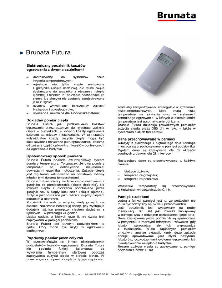 Brunata Futura Elektroniczny podzielnik kosztów ogrzewania z dwoma czujnikami • • • • dostosowany do systemów nisko i wysokotemperaturowych; rejestruje nie tylko ciepło emitowane z grzejnika (ciepło dodatnie), ale takŜe ciepło dostarczone do grzejnika z otoczenia (ciepło ujemne). Oznacza to, Ŝe ciepło pochodzące ze słońca lub piecyka nie zostanie zarejestrowane jako zuŜycie; czytelny wyświetlacz pokazujący zuŜycie bieŜącego i ubiegłego roku; wymienne, neutralne dla środowiska baterie; Dokładny pomiar ciepła Brunata Futura jest podzielnikiem kosztów ogrzewania przeznaczonym do rejestracji zuŜycia ciepła w budynkach, w których koszty ogrzewania dzielone są między mieszkańców. W ten sposób indywidualne koszty zuŜycia ciepła mogą być kalkulowane i rozliczane jako sprawiedliwa, zaleŜna od zuŜycia część całkowitych kosztów poniesionych na ogrzewanie budynku. Opatentowany sposób pomiaru Brunata Futura posiada dwuczujnikowy system pomiaru temperatury. To znaczy, Ŝe dwa pomiary temperatur są dokonywane nieustannie: powierzchni grzejnika i otoczenia. ZuŜycie ciepła jest regularnie kalkulowane na podstawie róŜnicy między tymi dwoma temperaturami. Brunata Futura mierzy nie tylko ciepło emitowane z grzejnika do pomieszczenia (ciepło dodatnie), ale równieŜ ciepło z otoczenia pochłaniane przez grzejnik np. w ciepły letni dzień (ciepło ujemne). ZuŜycie jest obliczane jako róŜnica między ciepłem dodatnim a ujemnym. Podzielnik nie nalicza zuŜycia, kiedy grzejnik nie pracuje. Naliczanie następuję wtedy, gdy występuje dodatnia róŜnica pomiędzy ciepłem dodatnim a ujemnym w przeciągu 24 godzin. Liczba godzin, w których grzejnik nie działa jest zapisywana w pamięci podzielnika. Brunata Futura jest jedynym podzielnikiem na rynku, który moŜe być uŜyty w ogrzewaniu podłogowym. Poprawny pomiar przez cały rok W przeciwieństwie do innych elektronicznych podzielników kosztów ogrzewania, Brunata Futura nie posiada funkcji kalendarza do wywołania temperatury startowej podczas zapisywania zuŜycia ciepła w okresie letnim. W przeciwnym razie pewna część zuŜytego ciepła nie zostałaby zarejestrowana, szczególnie w systemach niskotemperaturowych, które mają niską temperaturę na zasilaniu oraz w systemach centralnego ogrzewania, w których w okresie letnim temperatura jest automatycznie obniŜana. Brunata Futura dokonuje prawidłowych pomiarów zuŜycia ciepła przez 365 dni w roku – takŜe w systemach niskich temperatur. Dane przechowywane w pamięci Odczyty z pierwszego i piętnastego dnia kaŜdego miesiąca są przechowywane w pamięci podzielnika. Ogółem dane są zapisywane dla 52 okresów zgodnych z danymi dla 26 miesięcy. Następujące dane są przechowywane w kaŜdym okresie: • • • bieŜące zuŜycie; temperatura grzejnika; temperatura pokojowa. Wszystkie temperatury są przechowywane w Kelwinach w rozdzielczości 0,1 K. Pamięć z zaletami Jedną z funkcji pamięci jest to, Ŝe podzielnik nie musi być odczytany np. w dniu przeprowadzki. Jeśli podzielnik jest wystawiony na próby manipulacji, ten fakt jest równieŜ zapisywany w pamięci wraz z rodzajem uszkodzenia i jego datą. Dane zapisywane przez podzielnik są sprawdzane w połączeniu z rocznymi odczytami i wówczas, gdy lokator wprowadza się lub wyprowadza z mieszkania. Wiele zapisanych pomiarów umoŜliwia analizę sytuacji, kiedy duŜe zuŜycie energii spowodowane jest złymi nawykami lokatorów, uszkodzeniami systemu ogrzewania lub nieodpowiednie ocieplenie budynku. Roczne zuŜycia ciepła są zapisywane w pamięci podzielnika przez 10 lat. Brun - Pol Silesia Sp. z o.o. · tel +48 32 205 52 12 · fax +48 205 52 13 · [email protected] · www.brunpol.pl Czytelny wyświetlacz Brunata Futura ma łatwy do przeczytania wyświetlacz bez konieczności naciskania jakichkolwiek przycisków. Wyświetla kolejno dane pokazując: Jednostki Aktualne zuŜycie ciepła jest mierzone w jednostkach i wyświetlane jako “ZuŜycie”. W pierwszym dniu nowego okresu rozliczeniowego, pomiar zuŜycia z bieŜącego roku automatycznie zaczyna się od zera. ZuŜycie w poprzednim okresie rozliczeniowym ZuŜycie ciepła z ubiegłego roku jest wyświetlane na podzielniku, po to by lokator mógł obserwować i porównać zuŜycie z obecnego i zeszłego roku. ZuŜycie z ostatnich dziesięciu lat jest przechowane w pamięci wewnętrznej podzielnika. Skala Podczas instalowania kaŜdy podzielnik jest dostosowany do mocy grzejnika za pomocą skali. To zapewnia, Ŝe zuŜycie ciepła jest wymierzone poprawnie i jest porównywalne ze zuŜyciem w innych pomieszczeniach gdzie są zainstalowane podzielniki Brunata Futura. Obszar stosowania: System ogrzewania 1 i 2 rurowy, włączając tak zwane systemy niskiej temperatury i budynki ocieplone. Kryterium rejestrowania zuŜycia: tz – tI › 0 ° zgodnie z DS/EN kpt. 5.3 ciepło + , -tylko ciepło dostarczone do grzejnika z systemu centralnego ogrzewania jest mierzone jako zuŜycie t min = 20 °C mierzy dokładnie w niskich temperaturach t pokojowa zasięg pomiaru 0 0C -105 0C t grzejnika zasięg pomiaru 0 0C -105 0C Oznaczenia typu: E1 z zewnętrznym czujnikiem temperatury grzejnika zasięg pomiaru 0 0C -125 0C E2 z zewnętrznym czujnikiem temperatury grzejnika i temperatury pokojowej, zasięg pomiaru 0 °C -125 °C K z tylną częścią dla konwektora G z czujnikiem temperatury ogrzewania podłogowego Wyświetlacz: “ZuŜycie”, “ZuŜycie ub. roku”, “Skala” „Numer” są pokazywane po kolei. Numer podzielnika Stopień ochrony załączników: IP42 KaŜdy podzielnik ma własny unikalny numer. W rezultacie firma rozliczająca moŜe zawsze sprawdzić szczegóły zuŜycia, miejsce instalacji itd. Pamięć: Ochrona środowiska połączona z wieloletnim uŜytkowaniem Brunata Futura ma bardzo długą Ŝywotność, poniewaŜ jego bateria jest wymienialna. Większość innych elektronicznych podzielników na rynku nie ma tej mo