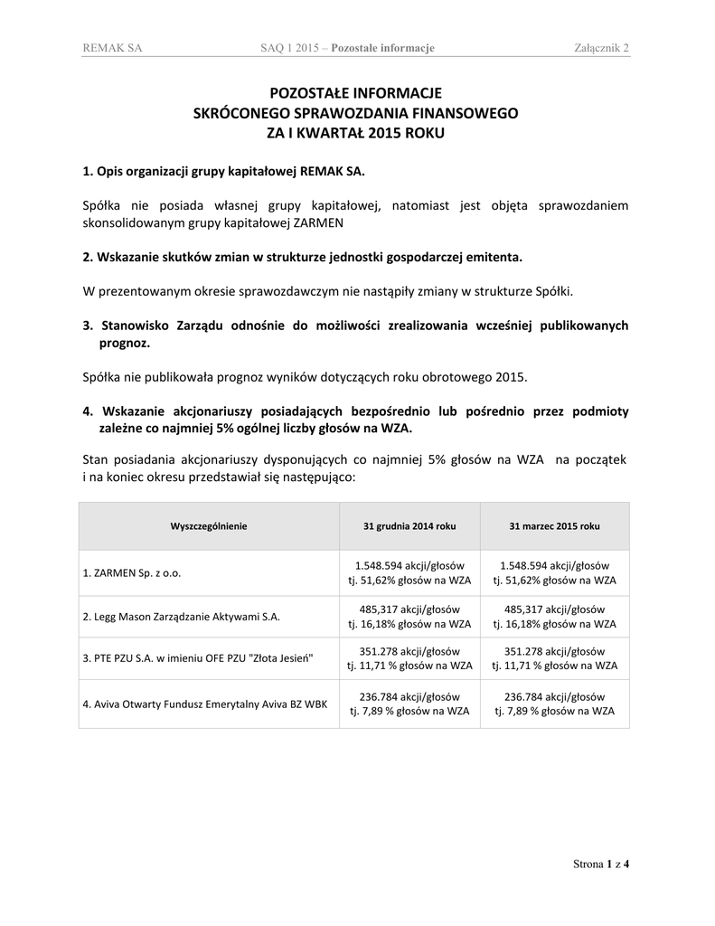 SAQ 1 2015 – Pozostałe informacje REMAK SA Załącznik 2 POZOSTAŁE INFORMACJE SKRÓCONEGO SPRAWOZDANIA FINANSOWEGO ZA I KWARTAŁ 2015 ROKU 1. Opis organizacji grupy kapitałowej REMAK SA. Spółka nie posiada własnej grupy kapitałowej, natomiast jest objęta sprawozdaniem skonsolidowanym grupy kapitałowej ZARMEN 2. Wskazanie skutków zmian w strukturze jednostki gospodarczej emitenta. W prezentowanym okresie sprawozdawczym nie nastąpiły zmiany w strukturze Spółki. 3. Stanowisko Zarządu odnośnie do możliwości zrealizowania wcześniej publikowanych prognoz. Spółka nie publikowała prognoz wyników dotyczących roku obrotowego 2015. 4. Wskazanie akcjonariuszy posiadających bezpośrednio lub pośrednio przez podmioty zależne co najmniej 5% ogólnej liczby głosów na WZA. Stan posiadania akcjonariuszy dysponujących co najmniej 5% głosów na WZA na początek i na koniec okresu przedstawiał się następująco: Wyszczególnienie 31 grudnia 2014 roku 31 marzec 2015 roku 1. ZARMEN Sp. z o.o. 1.548.594 akcji/głosów tj. 51,62% głosów na WZA 1.548.594 akcji/głosów tj. 51,62% głosów na WZA 2. Legg Mason Zarządzanie Aktywami S.A. 485,317 akcji/głosów tj. 16,18% głosów na WZA 485,317 akcji/głosów tj. 16,18% głosów na WZA 3. PTE PZU S.A. w imieniu OFE PZU "Złota Jesień" 351.278 akcji/głosów tj. 11,71 % głosów na WZA 351.278 akcji/głosów tj. 11,71 % głosów na WZA 4. Aviva Otwarty Fundusz Emerytalny Aviva BZ WBK 236.784 akcji/głosów tj. 7,89 % głosów na WZA 236.784 akcji/głosów tj. 7,89 % głosów na WZA Strona 1 z 4 REMAK SA SAQ 1 2015 – Pozostałe informacje Załącznik 2 5. Zestawienie stanu posiadania akcji REMAK SA lub uprawnień do nich przez osoby zarządzające i nadzorujące REMAK SA. Osoby zarządzające i nadzorujące nie posiadają akcji REMAK SA. Do dnia przekazania niniejszego raportu Spółka nie otrzymała informacji o zmianach w stanach posiadania akcji emitenta przez osoby zarządzające i nadzorujące. 6. Wskazanie postępowań toczących się przed sądem i innymi organami. W 2014 roku w wyniku postępowania administracyjnego prowadzonego przez ZUS w Opolu została podważona prawidłowość naliczenia przez Remak S.A. składek na ubezpieczenie społeczne i innych składek od udostępnianych pracownikom za częściową odpłatnością zakwaterowań. W IV kwartale 2014 roku spółka złożyła 539 odwołań od decyzji ZUS na łączną kwotę 1.162 tys. zł do Sądu Okręgowego w Opolu V Wydział Pracy i Ubezpieczeń Społecznych. Na zgodny wniosek stron postępowania Sąd Okręgowy w Opolu zawiesił 538 postępowań i prowadził postępowanie w jednej sprawie (Sygn. Akt VU 3801/14). Sąd Okręgowy w Opolu wyrokiem z dnia 16.03.2015 roku oddalił odwołanie Spółki w tej sprawie. Spółka dnia 13.04.2015 roku złożyła do Sądu Apelacyjnego we Wrocławiu apelacje od tego wyroku wnosząc o uchylenie zaskarżonego wyroku w całości. 7. Informacje o zawarciu przez emitenta znaczących transakcji z podmiotami powiązanymi. W I kwartale 2015 roku Spółka nie zawarła z podmiotami powiązanymi istotnych transakcji na innych warunkach niż rynkowe 8. Informacje o udzieleniu przez emitenta poręczeń kredytu lub gwarancji znaczącej wartości łącznie jednemu podmiotowi. Spółka w prezentowanym okresie nie udzielała poręczeń kredytów czy gwarancji. Według stanu na 31.03.2015 roku łączna wartość istniejących gwarancji dobrego wykonania i zwrotu zaliczki przekraczająca 10% wartości kapitałów własnych po wycenie bilansowej występowała w przypadku: Mostostal Warszawa S.A. - poręczenie do wartości 311.354 tys. zł z tytułu umowy realizacji gwarancji udzielonej przez Mostostal Warszawa S.A. do umowy na Eemshaven, na wartość 76.826 tys. EUR, poręczenie ważne do 14.07.2019 roku, Alstom Boiler Deutschland GmbH – trzy gwarancje na łączną wartość 16.897 tys. zł z najdłuższym terminem ważności do 30.04.2018 roku, Foster Wheeler Energia Polska Sp. z o.o. - gwarancja na wartość 3.827 tys. zł, z terminem ważności do 16.07.2015 roku, Alstom Power Ltd. – jedna gwarancja na wartość 5.243 tys. zł z terminem ważności do 25.05.2016 roku; Strona 2 z 4 REMAK SA SAQ 1 2015 – Pozostałe informacje Załącznik 2 RAFAKO S.A. - trzy gwarancje na łączną wartość 3.595 tys. zł z najdłuższym terminem ważności do 10.02.2017 roku, ALSTOM Power Sp. z o.o. - pięć gwarancji na łączną wartość 3.256 tys. zł z najdłuższym terminem ważności do 15.01.2018 roku, SNC Lavalin Sp. z o.o. - jedna gwarancja na wartość 1.694 tys. zł z okresem ważności do 30.03.2016 roku, Grupa Azoty S.A. - sześć gwarancji na łączną wartość 744 tys. zł z najdłuższym okresem ważności do 15.03.2018 roku. 9. Inne informacje istotne dla oceny sytuacji kadrowej, majątkowej i finansowej spółki i ich zmian oraz informacje oceniające możliwości realizacji zobowiązań. W dniu 17 lutego 2015 roku Spółka otrzymała od Rady Nadzorczej Emitenta uchwałę w sprawie odwołania Pani Aleksandry Kowalskiej z pełnienia funkcji Członka Zarządu – Wiceprezesa Spółki z dniem 17 lutego 2015 roku. W dniu 17 lutego 2015 roku Rada Nadzorcza Emitenta podjęła uchwałę o powołaniu do Zarządu Spółki Pani Gabrieli Cebuli powierzając jej z dniem 17 lutego 2015 roku funkcję Wiceprezesa Zarządu Spółki. W dniu 29 kwietnia 2015 roku odbyło się Walne Zgromadzenie Akcjonariuszy REMAK S.A., które podjęło uchwałę o przeznaczeniu zysku netto roku 2014 na pokrycie strat z lat ubiegłych. Pozostałe informacje istotne dla oceny sytuacji kadrowej, majątkowej, finansowej i wyniku finansowego Spółki przedstawione zostały w Informacji dodatkowej skróconego sprawozdania finansowego za I kwartał 2015 roku. 10. Czynniki, które będą miały wpływ na wyniki spółki w perspektywie co najmniej kolejnego kwartału. Pomimo dobrej pozycji rynkowej Spółki występują czynniki ryzyka mogące mieć wpływ na wyniki Spółki w