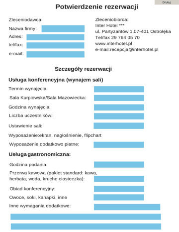 Potwierdzenie rezerwacji Drukuj Zleceniobiorca: Inter Hotel *** ul. Partyzantów 1,07-401 Ostrołęka Tel/fax 29 764 05 70 www.interhotel.pl e-mail:[email protected] Zleceniodawca: Nazwa firmy: Adres: tel/fax: e-mail: Szczegóły rezerwacji Usługa konferencyjna (wynajem sali) Termin wynajęcia: Sala Kurpiowska/Sala Mazowiecka: Godzina wynajęcia: Liczba uczestników: Ustawienie sali: Wyposażenie:ekran, nagłośnienie, flipchart Wyposażenie dodatkowo płatne: Usługa gastronomiczna: Godzina podania: Przerwa kawowa (pakiet standard: kawa, herbata, woda, kruche ciasteczka): Obiad konferencyjny: Owoce, soki, kanapki, inne Inne wymagania dodatkowe: