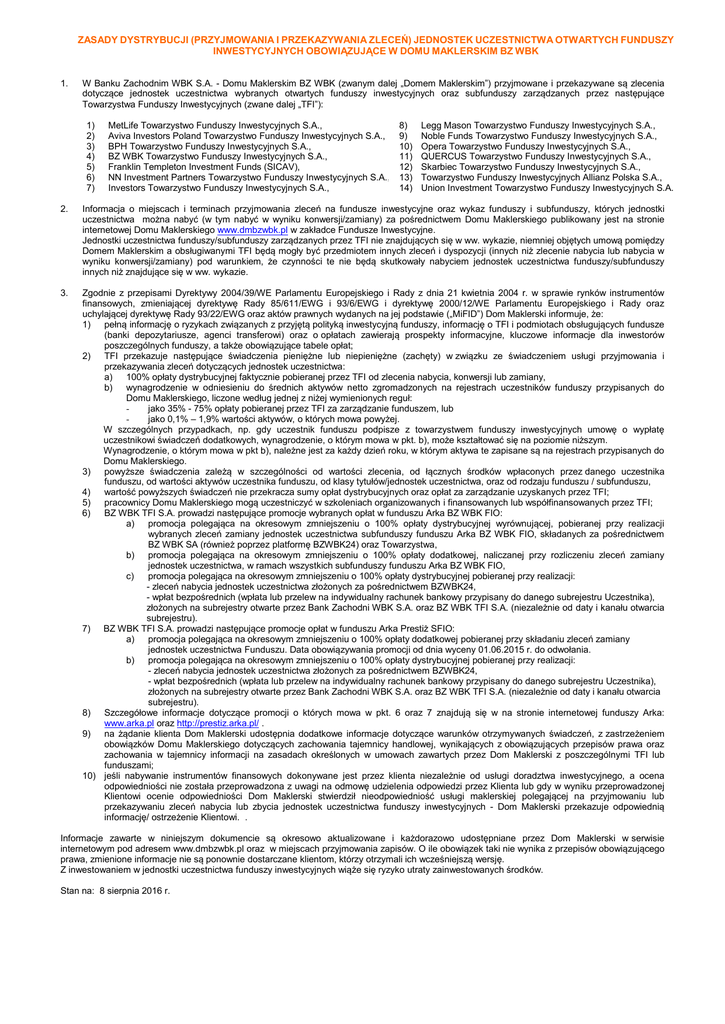 ZASADY DYSTRYBUCJI (PRZYJMOWANIA I PRZEKAZYWANIA ZLECEŃ) JEDNOSTEK UCZESTNICTWA OTWARTYCH FUNDUSZY INWESTYCYJNYCH OBOWIĄZUJĄCE W DOMU MAKLERSKIM BZ WBK 1. W Banku Zachodnim WBK S.A. - Domu Maklerskim BZ WBK (zwanym dalej „Domem Maklerskim”) przyjmowane i przekazywane są zlecenia dotyczące jednostek uczestnictwa wybranych otwartych funduszy inwestycyjnych oraz subfunduszy zarządzanych przez następujące Towarzystwa Funduszy Inwestycyjnych (zwane dalej „TFI”): 1) 2) 3) 4) 5) 6) 7) MetLife Towarzystwo Funduszy Inwestycyjnych S.A., Aviva Investors Poland Towarzystwo Funduszy Inwestycyjnych S.A., BPH Towarzystwo Funduszy Inwestycyjnych S.A., BZ WBK Towarzystwo Funduszy Inwestycyjnych S.A., Franklin Templeton Investment Funds (SICAV), NN Investment Partners Towarzystwo Funduszy Inwestycyjnych S.A., Investors Towarzystwo Funduszy Inwestycyjnych S.A., 8) 9) 10) 11) 12) 13) 14) Legg Mason Towarzystwo Funduszy Inwestycyjnych S.A., Noble Funds Towarzystwo Funduszy Inwestycyjnych S.A., Opera Towarzystwo Funduszy Inwestycyjnych S.A., QUERCUS Towarzystwo Funduszy Inwestycyjnych S.A., Skarbiec Towarzystwo Funduszy Inwestycyjnych S.A., Towarzystwo Funduszy Inwestycyjnych Allianz Polska S.A., Union Investment Towarzystwo Funduszy Inwestycyjnych S.A. 2. Informacja o miejscach i terminach przyjmowania zleceń na fundusze inwestycyjne oraz wykaz funduszy i subfunduszy, których jednostki uczestnictwa można nabyć (w tym nabyć w wyniku konwersji/zamiany) za pośrednictwem Domu Maklerskiego publikowany jest na stronie internetowej Domu Maklerskiego www.dmbzwbk.pl w zakładce Fundusze Inwestycyjne. Jednostki uczestnictwa funduszy/subfunduszy zarządzanych przez TFI nie znajdujących się w ww. wykazie, niemniej objętych umową pomiędzy Domem Maklerskim a obsługiwanymi TFI będą mogły być przedmiotem innych zleceń i dyspozycji (innych niż zlecenie nabycia lub nabycia w wyniku konwersji/zamiany) pod warunkiem, że czynności te nie będą skutkowały nabyciem jednostek uczestnictwa funduszy/subfunduszy innych niż znajdujące się w ww. wykazie. 3. Zgodnie z przepisami Dyrektywy 2004/39/WE Parlamentu Europejskiego i Rady z dnia 21 kwietnia 2004 r. w sprawie rynków instrumentów finansowych, zmieniającej dyrektywę Rady 85/611/EWG i 93/6/EWG i dyrektywę 2000/12/WE Parlamentu Europejskiego i Rady oraz uchylającej dyrektywę Rady 93/22/EWG oraz aktów prawnych wydanych na jej podstawie („MiFID”) Dom Maklerski informuje, że: 1) pełną informację o ryzykach związanych z przyjętą polityką inwestycyjną funduszy, informację o TFI i podmiotach obsługujących fundusze (banki depozytariusze, agenci transferowi) oraz o opłatach zawierają prospekty informacyjne, kluczowe informacje dla inwestorów poszczególnych funduszy, a także obowiązujące tabele opłat; 2) TFI przekazuje następujące świadczenia pieniężne lub niepieniężne (zachęty) w związku ze świadczeniem usługi przyjmowania i przekazywania zleceń dotyczących jednostek uczestnictwa: a) 100% opłaty dystrybucyjnej faktycznie pobieranej przez TFI od zlecenia nabycia, konwersji lub zamiany, b) wynagrodzenie w odniesieniu do średnich aktywów netto zgromadzonych na rejestrach uczestników funduszy przypisanych do Domu Maklerskiego, liczone według jednej z niżej wymienionych reguł: jako 35% - 75% opłaty pobieranej przez TFI za zarządzanie funduszem, lub jako 0,1% – 1,9% wartości aktywów, o których mowa powyżej. W szczególnych przypadkach, np. gdy uczestnik funduszu podpisze z towarzystwem funduszy inwestycyjnych umowę o wypłatę uczestnikowi świadczeń dodatkowych, wynagrodzenie, o którym mowa w pkt. b), może kształtować się na poziomie niższym. Wynagrodzenie, o którym mowa w pkt b), należne jest za każdy dzień roku, w którym aktywa te zapisane są na rejestrach przypisanych do Domu Maklerskiego. 3) powyższe świadczenia zależą w szczególności od wartości zlecenia, od łącznych środków wpłaconych przez danego uczestnika funduszu, od wartości aktywów uczestnika funduszu, od klasy tytułów/jednostek uczestnictwa, oraz od rodzaju funduszu / subfunduszu, 4) wartość powyższych świadczeń nie przekracza sumy opłat dystrybucyjnych oraz opłat za zarządzanie uzyskanych przez TFI; 5) pracownicy Domu Maklerskiego mogą uczestniczyć w szkoleniach organizowanych i finansowanych lub współfinansowanych przez TFI; 6) BZ WBK TFI S.A. prowadzi następujące promocje wybranych opłat w funduszu Arka BZ WBK FIO: a) promocja polegająca na okresowym zmniejszeniu o 100% opłaty dystrybucyjnej wyrównującej, pobieranej przy realizacji wybranych zleceń zamiany jednostek uczestnictwa subfunduszy funduszu Arka BZ WBK FIO, składanych za pośrednictwem BZ WBK SA (również poprzez platformę BZWBK24) oraz Towarzystwa, b) promocja polegająca na okresowym zmniejszeniu o 100% opłaty dodatkowej, naliczanej przy rozliczeniu zleceń zamiany jednostek uczestnictwa, w ramach wszystkich subfunduszy funduszu Arka BZ WBK FIO, c) promocja polegająca na okresowym zmniejszeniu o 100% opłaty dystrybucyjnej pobieranej przy realizacji: - zleceń nabycia jednostek uczestnictwa złożonych za pośrednictwem BZWBK24, - wpłat bezpośrednich (wpłata lub przelew na indywidualny rachunek bankowy przypisany do danego subrejestru Uczestnika), złożonych na subrejestry otwarte przez Bank Zachodni WBK S.A. oraz BZ WBK TFI S.A. (niezależnie od daty i kanału otwarcia subrejestru). 7) BZ WBK TFI S.A. prowadzi następujące promocje opłat w funduszu Arka Prestiż SFIO: a) promocja polegająca na okresowym zmniejszeniu o 100% opłaty dodatkowej pobieranej przy składaniu zleceń zamiany jednostek uczestnictwa Funduszu. Data obowiązywania promocji od dnia wyceny 01.06.2015 r. do odwołania. b) promocja polegająca na okresowym zmniejszeniu o 100% opłaty dystrybucyjnej pobieranej przy realizacji: - zleceń nabycia jednostek uczestnictwa złożonych za pośrednictwem BZWBK24, - wpłat bezpośrednich (wpłata lub 