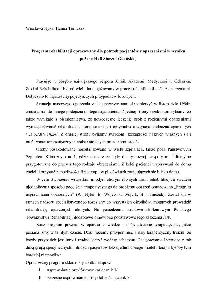 Wiesława Nyka, Hanna Tomczak Program rehabilitacji opracowany dla potrzeb pacjentów z oparzeniami w wyniku pożaru Hali Stoczni Gdańskiej Pracując w obrębie największego zespołu Klinik Akademii Medycznej w Gdańsku, Zakład Rehabilitacji był od wielu lat angażowany w proces rehabilitacji osób z oparzeniami. Dotyczyło to najczęściej pojedynczych przypadków losowych. Sytuacja masowego oparzenia z jaką przyszło nam się zmierzyć w listopadzie 1994r. zmusiła nas do innego podejścia do tego zagadnienia. Z jednej strony przekonani byliśmy, co także wynikało z piśmiennictwa, że nowoczesne leczenie osób z rozległymi oparzeniami wymaga również rehabilitacji, której celem jest optymalna integracja społeczna oparzonych /1,3,6,7,8,9,14,24/. Z drugiej strony byliśmy świadomi szczupłości naszych własnych sił i możliwości terapeutycznych wobec stojących przed nami zadań. Osoby poszkodowane hospitalizowano w wielu szpitalach, także poza Państwowym Szpitalem Klinicznym nr 1, gdzie nie zawsze były do dyspozycji zespoły rehabilitacyjne przygotowane do pracy z tego rodzaju obrażeniami. Z kolei pacjenci wypisywani do domu chcieli korzystać z możliwości fizjoterapii w placówkach znajdujących się blisko domu. W celu stworzenia wszystkim młodym chorym równych szans rehabilitacji, a zarazem ujednolicenia sposobu podejścia terapeutycznego do problemu oparzeń opracowano „Program usprawniania oparzonych” (W. Nyka, B. Wojewska-Wójcik, H. Tomczak). Został on w ramach nadzoru specjalistycznego rozesłany do wszystkich ośrodków, mogących prowadzić rehabilitację oparzonych chorych. Na posiedzeniu naukowo-szkoleniowym Polskiego Towarzystwa Rehabilitacji dodatkowo omówiono podstawowe jego założenia /14/. Nasz program powstał w oparciu o wiedzę i doświadczenie terapeutyczne, jakie posiadaliśmy w tamtym czasie. Dziś możemy przypomnieć znany terapeutyczny truizm, że każdy przypadek jest inny i trudno leczyć według schematu. Postępowanie lecznicze z tak dużą grupą specyficznych, młodych pacjentów bez ujednoliconego modelu terapii byłoby tym bardziej niemożliwe. Opracowany program składał się z kilku etapów: I – usprawnianie przyłóżkowe /załącznik 1/ II – wczesne usprawnianie poszpitalne /załącznik 2/ III – późna rehabilitacja poszpitalna /załącznik 3/ Przewidywany czas trwania poszczególnych okresów traktowaliśmy orientacyjnie. Świadomi byliśmy, że w wyborze taktyki postępowania terapeutycznego u chorych z oparzeniami istotną rolę odgrywa specyfika i rozległość uszkodzeń. Składają się na nią bezpośrednie i pośrednie następstwa obrażeń termicznych, uszkodzenia mechaniczne wynikłe z paniki w trakcie ewakuacji oraz reakcje psychiczne związane z przebytym stresem zagrożenia życia, utraty zdrowia, dobrego wyglądu /14/. Ogień i wysoka temperatura powietrza, w której przebywają poszkodowani powoduje nie tylko oparzenia skóry, ale także dróg oddechowych, aparatu ochronnego oka i gałki ocznej, włosów. Może również wpływać na funkcję wielu innych narządów. Stan ogólny chorego, jego szanse przeżycia zależą od rozległości, głębokości oparzeń, a także od dalszych następowych powikłań pogarszających stan ogólny i miejscowy /13/. Współczesne chirurgiczne leczenie oparzeń opisano w poprzednim rozdziale. Jest ono zawsze związane z obrzękiem, bólem i odruchowym eliminowaniem jakichkolwiek ruchów. Powstająca w procesie gojenia nowa skóra w istocie swojej jest blizną lub otoczona jest bliznami, które będą kształtować się i dojrzewać około 12–18 miesięcy, a często znacznie dłużej /11/. Efekt czynnościowy terapii zależy od utrzymania dobrego stanu funkcjonalnego narządów ruchu. Efekt kosmetyczny zaś w dużym stopniu od jakości blizny. Metodami fizjoterapeutycznymi można przyspieszyć proces gojenia i pośrednio wpłynąć na optymalizację tworzącej się blizny. Nie kwestionowana jest tu rola kinezyterapii i terapii uciskowej. Co do innych metod fizykalnych, czasu i zakresu ich stosowania poglądy są różne /2,4,5,10,18,19,20,21,22,23,24/. Stworzony przez nas program terapeutyczny uwzględnił szeroki wachlarz możliwości fizjoterapii. Jednak ostateczny wybór metody leczenia danego pacjenta należał do lekarza specjalisty z rehabilitacji medycznej. I Etap: Usprawnianie przyłóżkowe (6 tygodni) - realizowany był na oddziałach chirurgicznych. Celem naszego działania w tym okresie była z jednej strony poprawa krążenia obwodowego i likwidowanie obrzęku, z drugiej zapobieganie tworzeniu się przykurczy, utrzymanie elastyczności elementów aparatu ruchowego, tj. mięśni, ścięgien i torebek stawowych. Ukierunkowany był także na uelastycznienie przeszczepów skóry. Fizjoterapeuci w warunkach możliwej aseptyki prowadzili ćwiczenia, pokonując ból i sztywność wynikającą z obrzęku, a także lęk przed wtórnym uszkodzeniem przeszczepu skórnego. Ćwiczenia bierne, potem czynne wspomagane biernie przez terapeutę, wykonywane były z dużą ostrożnością w stopniowo narastającym zakresie ruchu. Żmudne ćwiczenia każdego stawu w izolowanych płaszczyznach ruchowych wymagały cierpliwości zarówno ze strony terapeuty jak i młodego, często labilnego emocjonalnie pacjenta. Pozyskany, dzięki dodatkowym zakupom drobny sprzęt rehabilitacyjny, piłeczki, dyski ułatwiał i uatrakcyjnił terapię. Warunkiem jego używania było utrzymanie go w idealnej czystości ze względu na możliwości wtórnych zakażeń. Na tym etapie leczenia w profilaktyce obrzęku istotne było wysokie ułożenie i delikatny masaż odprowadzający, polegający głównie na „przegłaskiwaniu” w kierunku przyśrodkowym. Tego typu masaż można wykonać nawet w opatrunkach. Istotny punkt naszego programu leczniczego stanowiła poprawa wentylacji płuc. Podrażnienie, bądź wręcz oparzenie dróg oddechowych wymagało specjalnych ćwiczeń w celu poprawy w