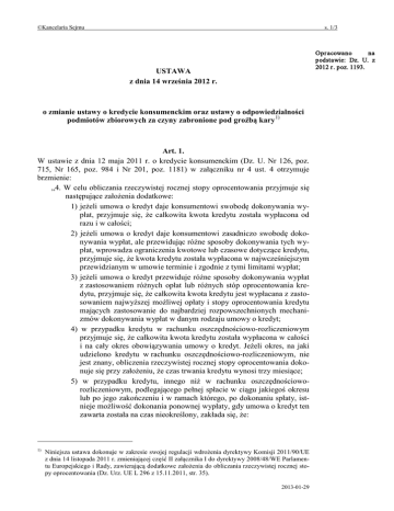 ©Kancelaria Sejmu s. 1/3 Opr acowano na podstawie: Dz. U. z 2012 r . poz. 1193. USTAWA z dnia 14 września 2012 r. o zmianie ustawy o kredycie konsumenckim oraz ustawy o odpowiedzialności podmiotów zbiorowych za czyny zabronione pod groźbą kary 1) Art. 1. W ustawie z dnia 12 maja 2011 r. o kredycie konsumenckim (Dz. U. Nr 126, poz. 715, Nr 165, poz. 984 i Nr 201, poz. 1181) w załączniku nr 4 ust. 4 otrzymuje brzmienie: „4. W celu obliczania rzeczywistej rocznej stopy oprocentowania przyjmuje się następujące założenia dodatkowe: 1) jeżeli umowa o kredyt daje konsumentowi swobodę dokonywania wypłat, przyjmuje się, że całkowita kwota kredytu została wypłacona od razu i w całości; 2) jeżeli umowa o kredyt daje konsumentowi zasadniczo swobodę dokonywania wypłat, ale przewidując różne sposoby dokonywania tych wypłat, wprowadza ograniczenia kwotowe lub czasowe dotyczące kredytu, przyjmuje się, że kwota kredytu została wypłacona w najwcześniejszym przewidzianym w umowie terminie i zgodnie z tymi limitami wypłat; 3) jeżeli umowa o kredyt przewiduje różne sposoby dokonywania wypłat z zastosowaniem różnych opłat lub różnych stóp oprocentowania kredytu, przyjmuje się, że całkowita kwota kredytu jest wypłacana z zastosowaniem najwyższej możliwej opłaty i stopy oprocentowania kredytu mających zastosowanie do najbardziej rozpowszechnionych mechanizmów dokonywania wypłat w danym rodzaju umowy o kredyt; 4) w przypadku kredytu w rachunku oszczędnościowo-rozliczeniowym przyjmuje się, że całkowita kwota kredytu została wypłacona w całości i na cały okres obowiązywania umowy o kredyt. Jeżeli okres, na jaki udzielono kredytu w rachunku oszczędnościowo-rozliczeniowym, nie jest znany, obliczenia rzeczywistej rocznej stopy oprocentowania dokonuje się przy założeniu, że czas trwania kredytu wynosi trzy miesiące; 5) w przypadku kredytu, innego niż w rachunku oszczędnościoworozliczeniowym, podlegającego pełnej spłacie w ciągu jakiegoś okresu lub po jego zakończeniu i w ramach którego, po dokonaniu spłaty, istnieje możliwość dokonania ponownej wypłaty, gdy umowa o kredyt ten zawarta została na czas nieokreślony, zakłada się, że: 1) Niniejsza ustawa dokonuje w zakresie swojej regulacji wdrożenia dyrektywy Komisji 2011/90/UE z dnia 14 listopada 2011 r. zmieniającej część II załącznika I do dyrektywy 2008/48/WE Parlamentu Europejskiego i Rady, zawierającą dodatkowe założenia do obliczania rzeczywistej rocznej stopy oprocentowania (Dz. Urz. UE L 296 z 15.11.2011, str. 35). 2013-01-29 ©Kancelaria Sejmu s. 2/3 a) kredytu udziela się na okres jednego roku, począwszy od dnia pierwszej wypłaty, i płatność końcowa dokonana przez konsumenta pokrywa ewentualny kapitał pozostający do spłaty, ewentualne odsetki i inne opłaty, b) kapitał spłacany jest przez konsumenta w równych płatnościach miesięcznych, przy czym pierwsza płatność dokonywana jest po upływie miesiąca od daty pierwszej wypłaty. Jednakże w przypadkach gdy spłata kapitału musi nastąpić w całości, w jednej płatności, w ramach każdorazowego okresu płatności, zakłada się, że kolejne wypłaty i spłaty całego kapitału przez konsumenta następują w okresie jednego roku. Odsetki i inne opłaty stosuje się odpowiednio do tych wypłat i spłat kapitału oraz zgodnie z ustaleniami umowy o kredyt; 6) w przypadku umowy o kredyt inny niż kredyty, o których mowa w pkt 4 i 5: a) jeżeli nie można ustalić terminu lub kwoty spłaty kapitału, do której zobowiązany jest konsument, zakłada się, że spłaty dokonano w najwcześniejszym terminie przewidzianym w umowie o kredyt z zastosowaniem najniższej kwoty przewidzianej w umowie o kredyt, b) jeżeli data zawarcia umowy o kredyt nie jest znana, zakłada się, że dzień pierwszej wypłaty to dzień ustalony na podstawie najmniejszego odstępu czasu między tym dniem a dniem pierwszej płatności, do której zobowiązany jest konsument; 7) jeżeli na podstawie umowy o kredyt lub założeń określonych w pkt 4–6 nie można ustalić terminu lub kwoty płatności, do której zobowiązany jest konsument, zakłada się, że płatności dokonano zgodnie z terminami i warunkami wymaganymi przez kredytodawcę, a jeżeli te nie są znane, zakłada się, że: a) odsetki podlegają zapłacie wraz ze spłatą kapitału, b) opłata inna niż odsetki wyrażona w pojedynczej kwocie podlega zapłacie w dniu zawarcia umowy o kredyt, c) opłaty inne niż odsetki wyrażone jako szereg płatności podlegają zapłacie w regularnych odstępach czasu, począwszy od dnia pierwszej spłaty kapitału, przy czym w przypadku gdy kwoty takich płatności nie są znane, zakłada się, że kwoty te są jednakowe, d) płatność końcowa pokrywa ewentualny kapitał pozostający do spłaty, ewentualne odsetki i inne opłaty; 8) jeżeli maksymalny pułap kredytu nie został ustalony, przyjmuje się, że wynosi on w walucie polskiej równowartość 1 500 euro, ustaloną z zastosowaniem średniego kursu tej waluty ogłoszonego przez Narodowy Bank Polski z dnia obliczania rzeczywistej rocznej stopy oprocentowania; 9) jeżeli dla danego okresu lub dla danej kwoty oferuje się różne stopy oprocentowania kredytu i różną wysokość opłat, za stopę oprocentowania kredytu i opłaty w całym okresie obowiązywania umowy o kredyt przyjmuje się najwyższą stopę i najwyższe opłaty; 10) w przypadku umów o kredyt konsumencki, w których ustalono stałą stopę oprocentowania kredytu w odniesieniu do początkowego okresu, 2013-01-29 ©Kancelaria Sejmu s. 3/3 na koniec którego ustala się nową stopę oprocentowania, która następnie jest okresowo zmieniana zgodnie z uzgodnionym wskaźnikiem, rzeczywistą roczną stopę oprocentowania oblicza się na podstawie założenia, że po zakończeniu okresu, w którym obowiązuje stała stopa oprocentowania kredytu, stopa oprocentowania kredytu jest taka sama jak w ch