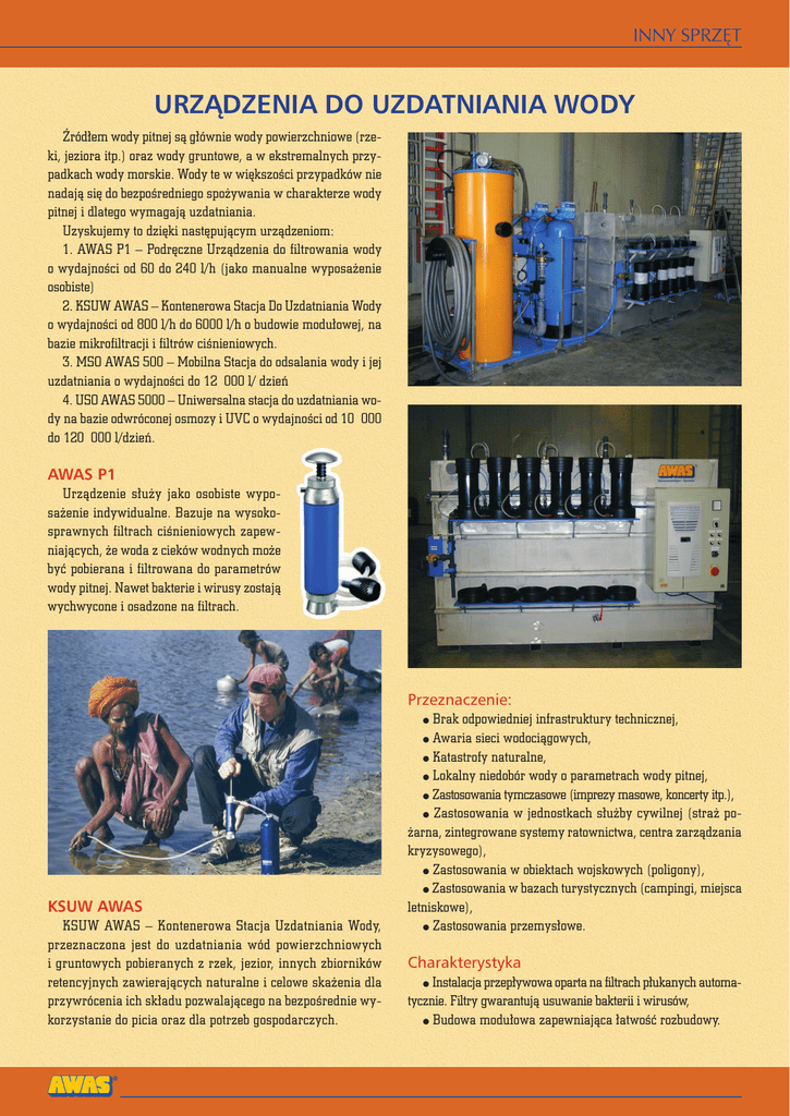 INNY SPRZĘT URZĄDZENIA DO UZDATNIANIA WODY Źródłem wody pitnej są głównie wody powierzchniowe (rzeki, jeziora itp.) oraz wody gruntowe, a w ekstremalnych przypadkach wody morskie. Wody te w większości przypadków nie nadają się do bezpośredniego spożywania w charakterze wody pitnej i dlatego wymagają uzdatniania. Uzyskujemy to dzięki następującym urządzeniom: 1. AWAS P1 – Podręczne Urządzenia do filtrowania wody o wydajności od 60 do 240 l/h (jako manualne wyposażenie osobiste) 2. KSUW AWAS – Kontenerowa Stacja Do Uzdatniania Wody o wydajności od 800 l/h do 6000 l/h o budowie modułowej, na bazie mikrofiltracji i filtrów ciśnieniowych. 3. MSO AWAS 500 – Mobilna Stacja do odsalania wody i jej uzdatniania o wydajności do 12 000 l/ dzień 4. USO AWAS 5000 – Uniwersalna stacja do uzdatniania wody na bazie odwróconej osmozy i UVC o wydajności od 10 000 do 120 000 l/dzień. AWAS P1 Urządzenie służy jako osobiste wyposażenie indywidualne. Bazuje na wysokosprawnych filtrach ciśnieniowych zapewniających, że woda z cieków wodnych może być pobierana i filtrowana do parametrów wody pitnej. Nawet bakterie i wirusy zostają wychwycone i osadzone na filtrach. Przeznaczenie: Brak odpowiedniej infrastruktury technicznej, ● Awaria sieci wodociągowych, ● Katastrofy naturalne, ● Lokalny niedobór wody o parametrach wody pitnej, ● Zastosowania tymczasowe (imprezy masowe, koncerty itp.), ● Zastosowania w jednostkach służby cywilnej (straż pożarna, zintegrowane systemy ratownictwa, centra zarządzania kryzysowego), ● Zastosowania w obiektach wojskowych (poligony), ● Zastosowania w bazach turystycznych (campingi, miejsca letniskowe), ● Zastosowania przemysłowe. ● KSUW AWAS KSUW AWAS – Kontenerowa Stacja Uzdatniania Wody, przeznaczona jest do uzdatniania wód powierzchniowych i gruntowych pobieranych z rzek, jezior, innych zbiorników retencyjnych zawierających naturalne i celowe skażenia dla przywrócenia ich składu pozwalającego na bezpośrednie wykorzystanie do picia oraz dla potrzeb gospodarczych. Charakterystyka ● Instalacja przepływowa oparta na filtrach płukanych automatycznie. Filtry gwarantują usuwanie bakterii i wirusów, ● Budowa modułowa zapewniająca łatwość rozbudowy. INNY SPRZĘT stacjonarna – w pomieszczeniu Przewoźną stację uzdatniania można zastosować jako stabilne źródło wody pitnej. ● Warunki eksploatacyjne oraz parametry stacji uzdatniania (dane techniczne). Wydajność filtrów – od 800 l/h – 6000 l/h, Kompatybilność w przyłączach i zasilaniu ze sprzętem pożarniczym, ● Całość instalacji sterowana jest układem sterowania wbudowanym w centralną szafkę sterowniczą. Sterowanie przebiega zasadniczo w trybie automatycznym, ● Zapewnia kontrolę jakości uzdatniania wody oraz stanu filtrów (instalacja przepływowa oparta jest na filtrach płukanych automatycznie), ● Możliwość podłączenia stacji do urządzenia pakującego wodę w opakowania foliowe oraz poboru wody uzdatnionej z pominięciem pakowaczki, ● Posiada własną linię do czerpania wody o dług. min. 100 m, ● Posiada możliwość podłączenia do zewnętrznych źródeł zasilania, ● Ciężar KSUW z kontenerem – 4800 kg, ● Pobór mocy – 3 kW. Stacja przewoźna, można ją zastosować w krótkim czasie na terenach dotkniętych brakiem wody pitnej. Stacja może być podłączona do systemu wodociągowego albo też może być zastosowana do odbioru indywidualnego. Nie są wymagane żadne prace budowlane. ● ● Pobór wody: Głównie zbiorniki naturalne: rzeki, jeziora Studnie ● Sztuczne zbiorniki retencyjne ● Woda nie może być zasolona ● ● MSO AWAS 500 MSO AWAS 500, ur ządzenie charakteryzuje się przede wszystkim skutecznością w uzdatnianiu wód mocno zasolonych. Technologia: Odwrócona osmoza i system dezynfekcji UV Wydajność stacji: od 500 l/h Wymiary: 1185 mm (l) x 785 mm (w) x 585 mm (h) Waga: 197 kg (stacja bez wody) Warianty zabudowy: ● ● mobilna – na przyczepie przenośna – w kontenerze Główne zastosowanie znajduje w nadmorskich obiektach letniskowych, hotelach, wojsku oraz wszędzie tam gdzie mocno zasolona woda i jej uzdatnienie jest dużym problemem. Technologia urządzenia oparta na zasadzie odwróconej osmozy oraz systemie dezynfekcji UV. MSO AWAS jest w stanie zaopatrzyć w wodę do spożycia do 6 000 osób dziennie. USO AWAS 5000 USO AWAS 5000, jest w stanie uzdatnić zarówno wodę z rzek, jezior czy innych zbiorników retencyjnych, lecz szczególne zastosowanie znajduje w uzdatnianiu wód z wysoką zawartością soli. Instalacja działa na zasadzie odwróconej osmozy oraz wspomagana jest przez system dezynfekcji UV. Woda dostarczana jest do urządzenia poprzez pompy, które pompują surową wodę z otwartych źródeł. INNY SPRZĘT Zabudowa: Standardowo w kontenerze 20-sto stopowym o wymiarach(dł. x szer. x wys.) 6058 mm x 2435 mm x 2439 mm Waga: Zależnie od wyposażenia, z kontenerem ok. 6000kg USO AWAS dzięki kontenerowej zabudowie stanowi łatwy w obsłudze oraz niezawodny i skuteczny system uzdatniania wody, zarówno morskiej jak również innych wód dla ludności w campingach, hotelach czy w wojsku. Wszystkie przedstawione Państwu urządzenia firmy AWAS, posiadają możliwość opcjonalnego wyposażenia. Wyposażenie dodatkowe: pompa do poboru wody surowej ● agregat prądotwórczy ● kontener stacjonarny opcjonalnie ogrzewany lub klimatyzowany ● kontener na naczepie opcjonalnie ogrzewany lub klimatyzowany Oprócz możliwości indywidualnego wyboru wyposażenia urządzeń, cechują je przedstawione zalety; ● Zalety: Mobilność Niezawodność ● Bezpieczeństwo ● Całkowita automatyzacja procesu – łatwość obsługi ● Instalacja przepływowa oparta na filtrach płukanych automatycznie. ● Budowa modułowa zapewniająca łatwość rozbudowy ● Filtry gwarantują usuwanie bakterii i wirusów. ● Zbiorniki do magazynowania wody pitnej 