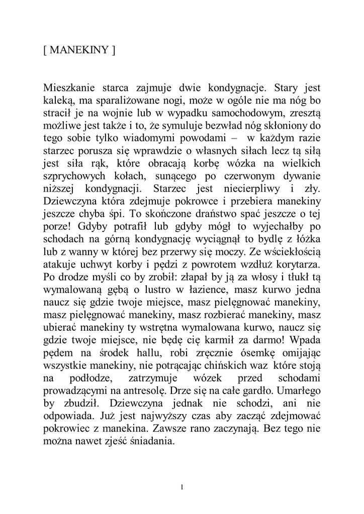 [ MANEKINY ] Mieszkanie starca zajmuje dwie kondygnacje. Stary jest kaleką, ma sparaliżowane nogi, może w ogóle nie ma nóg bo stracił je na wojnie lub w wypadku samochodowym, zresztą możliwe jest także i to, że symuluje bezwład nóg skłoniony do tego sobie tylko wiadomymi powodami – w każdym razie starzec porusza się wprawdzie o własnych siłach lecz tą siłą jest siła rąk, które obracają korbę wózka na wielkich szprychowych kołach, sunącego po czerwonym dywanie niższej kondygnacji. Starzec jest niecierpliwy i zły. Dziewczyna która zdejmuje pokrowce i przebiera manekiny jeszcze chyba śpi. To skończone draństwo spać jeszcze o tej porze! Gdyby potrafił lub gdyby mógł to wyjechałby po schodach na górną kondygnację wyciągnął to bydlę z łóżka lub z wanny w której bez przerwy się moczy. Ze wściekłością atakuje uchwyt korby i pędzi z powrotem wzdłuż korytarza. Po drodze myśli co by zrobił: złapał by ją za włosy i tłukł tą wymalowaną gębą o lustro w łazience, masz kurwo jedna naucz się gdzie twoje miejsce, masz pielęgnować manekiny, masz pielęgnować manekiny, masz rozbierać manekiny, masz ubierać manekiny ty wstrętna wymalowana kurwo, naucz się gdzie twoje miejsce, nie będę cię karmił za darmo! Wpada pędem na środek hallu, robi zręcznie ósemkę omijając wszystkie manekiny, nie potrącając chińskich waz które stoją na podłodze, zatrzymuje wózek przed schodami prowadzącymi na antresolę. Drze się na całe gardło. Umarłego by zbudził. Dziewczyna jednak nie schodzi, ani nie odpowiada. Już jest najwyższy czas aby zacząć zdejmować pokrowiec z manekina. Zawsze rano zaczynają. Bez tego nie można nawet zjeść śniadania. 1 Drżą mu ręce. Rozgląda się po hallu, manekiny pozakrywane są pokrowcami, myśli o ich włosach, o długich perukach zrobionych z różnokolorowych włosów, dziecinne zabawy, indiańskie skalpy, może ona umarła i nie zejdzie, może utopiła się w wannie, kto w takim razie zajmie się manekinem! Ogarnia go panika. Jest już niezwykle późno, trzeba zająć się manekinem jeśli wszystko ma się odbyć w czasie, każda rzecz ma swój czas, wszystko poukładane jest od lat jak pieczątki na biurku pedantycznego urzędnika, od tej do tej się śpi, od tej do tej się je, pozostały czas zajmują manekiny, dziewczyna rozbiera i ubiera manekiny, dlaczego do tej chwili nie zeszła? Szarpiąc korbę drze się znowu. Teraz dziewczyna schodzi. Schodzi powoli jak królowa w czasie uroczystości koronacyjnych, rozgląda się sennym i obojętnym wzrokiem dookoła. Pewnie się znowu moczyła w łazience. Chociaż nie, ona moczy się dopiero potem gdy skończy swoją robotę przy manekinie którego jej wskaże. Jest nadal wściekły! Można by pomyśleć że to nie ona od niego lecz on od niej jest zależny! Gdyby chciał mógłby ją przecież wyrzucić w przeciągu pięciu minut, tak jak tyle innych które nie umiały pracować, dla których nawet ta przypominająca zabawę praca była zbyt uciążliwa. Pozostały tylko ich włosy. Nadto zniecierpliwiony by mówić cokolwiek wskazuje jej pierwszego z rzędu manekina, pokrytego sięgającym do ziemi ortalionowym pokrowcem. Dziewczyna posłusznie rozpina powoli błyskawiczny zamek. Metaliczny, drażniący gwizd i szelest zsuwanego ortalionu. Pierwszy rzut oka, na odsłonięty manekin. Od niego zaczyna się liczyć dzień. Stary uspokaja się. Nieruchoma twarz i wspaniałe rude włosy, nieruchoma twarz która nie gada i nie płacze, zamknięte lub rozchylone w zależności od 2 wprawionego w gumę zawiasu usta, usta które nie wyrzucają ze siebie tysięcy idiotycznych słów, nie jazgoczą nic nie żądają, nigdy nie mają racji, których nie trzeba karmić, których nie trzeba słuchać, ani się ich radzić, wspaniały wynalazek, ci co produkują manekiny powinni pierwsi iść do nieba, dziewczyna milcząc jak zwykle, za to się przecież płaci, musi kurwa znać swoje miejsce, dziewczyna czesze teraz manekina, długie rude włosy spadają na ramiona i puszysty sweter, długie rude naelektryzowane włosy z drobnym szelestem podnoszą się do grzebienia, nieruchome oczy patrzą z uśmiechem na starca w fotelu. Teraz pomaluj ją, mówi rozkazującym głosem i dziewczyna przysuwa stolik na kółkach, podnosi ukryte na zawiasie lustro, naciska guzik i bezszelestnie rozchyla się blat, a spod spodu silniczek elektryczny wypycha na górę półkę zastawioną szczelnie całą kolekcją przyborów kosmetycznych. Stary włącza wsteczny bieg i zaciskając rękę na korbie napędu tak aż bieleją chrząstki palców cofa się do tyłu omal nie potrącając wielkiej chińskiej wazy stojącej na podłodze za jego plecami. Nie ma obawy. Codziennie od dziesiątków lat wykonuje ten sam manewr, te same ruchy. Przedmioty stoją tam gdzie je kazał postawić wtedy, gdy kupił pierwszego manekina i kupił mu pierwszą perukę, mógłby pomiędzy nimi jeździć dwustukonnym wózkiem ortopedycznym z zamkniętymi oczami i z szybkością 100 km na godzinę. Jego ruchy i jego trasa są tak dokładnie wyliczone jak ruchy i trasa dzikiego zwierzęcia w zbyt małej klatce ogrodu zoologicznego. Widział w młodości takie zwierzę. Trzy kroki w lewo, obrót głową, trzy kroki w prawo, obrót głową, trzy kroki w lewo, obrót głową, trzy kroki w prawo, obrót głową, cały dzień, byle tylko słońce nie świeciło w klatkę, trzy kroki w lewo, obrót głową, trzy kroki w prawo, obrót głową, cały dzień, i cały tydzień, cały miesiąc i cały rok ciągle trzy kroki i trzy kroki i głowa która obraca 3 się raz w lewo raz w prawo. On jest też w klatce i zna swoją klatkę o tyle lepiej o ile człowiek przerasta inteligencją zwierzę. Podczas gdy dziewczyna zakrywa sweter manekina plastikową folią i rozpoczyna makijaż starzec krąży po klatce. Kręcąc korbą napędzającą i zręcznie posługując się małą kierownicą wymija gęsto rozsta