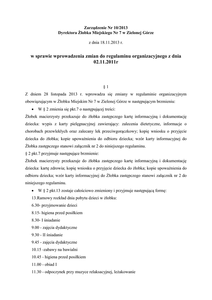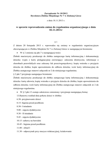 Zarządzenie Nr 10/2013 Dyrektora Żłobka Miejskiego Nr 7 w Zielonej Górze z dnia 18.11.2013 r. w sprawie wprowadzenia zmian do regulaminu organizacyjnego z dnia 02.11.2011r §1 Z dniem 28 listopada 2013 r. wprowadza się zmiany w regulaminie organizacyjnym obowiązującym w Żłobku Miejskim Nr 7 w Zielonej Górze w następującym brzmieniu: W § 2 zmienia się pkt.7 o następującej treści: Żłobek macierzysty przekazuje do żłobka zastępczego kartę informacyjną i dokumentację dziecka: wypis z karty pielęgnacyjnej zawierający: zalecenia dietetyczne, informacje o chorobach przewlekłych oraz zalecany lek przeciwgorączkowy; kopię wniosku o przyjęcie dziecka do żłobka; kopie upoważnienia do odbioru dziecka; wzór karty informacyjnej do Żłobka zastępczego stanowi załącznik nr 2 do niniejszego regulaminu. § 2 pkt.7 przyjmuje następujące brzmienie: Żłobek macierzysty przekazuje do żłobka zastępczego kartę informacyjną i dokumentację dziecka: kartę zdrowia; kopię wniosku o przyjęcie dziecka do żłobka; kopie upoważnienia do odbioru dziecka; wzór karty informacyjnej do Żłobka zastępczego stanowi załącznik nr 2 do niniejszego regulaminu. W § 2 pkt.13 zostaje całościowo zmieniony i przyjmuje następującą formę: 13.Ramowy rozkład dnia pobytu dzieci w żłobku: 6.30- przyjmowanie dzieci 8.15- higiena przed posiłkiem 8.30- I śniadanie 9.00 - zajęcia dydaktyczne 9.30 - II śniadanie 9.45 - zajęcia dydaktyczne 10.15 -zabawy na bawialni 10.45 - higiena przed posiłkiem 11.00 - obiad I 11.30 - odpoczynek przy muzyce relaksacyjnej, leżakowanie 13.15 -higiena przed posiłkiem 13.30 - obiad II 13.45 - czytanie bajek 14.30 -mycie rączek, podwieczorek 15.00 - wyjście na plac zabaw(wiosna-lato),zabawy integracyjne w sali 16.00-18.00-oczekiwanie na rodziców, zabawy dowolne W § 2 pkt.14 zostaje zmieniony i przyjmuje następującą formę: 1.dyżuru rannego w godzinach: 6.30-7.00 W § 2 pkt.16 zostaje częściowo zmieniony i przyjmuje następującą formę: Przy sprzyjających warunkach atmosferycznych organizowany jest pobyt dzieci z grupy II i III w patio przynależącym do grupy. W § 4 pkt.3 zostaje częściowo zmieniony i przyjmuje następującą formę: W żłobku mogą być zatrudnione osoby na niżej wymienionych stanowiskach pracy: 1. Dyrektora Żłobka 2. Głównego księgowego 3. Lekarza Pediatry 4. Starszej Pielęgniarki 5. Pielęgniarki 6. Opiekuna 7. Pokojowej 8. Starszego Konserwatora 9. Robotnika Terenowego 10. Specjalisty ds. żywienia 11. Specjalisty ds.obsługi administracyjno-kancelaryjnej i ds.kadr 12. Praczki 13. Głównego specjalisty ds.BHP i ochrony przeciwpożarowej 14. Kucharki W §6 pkt.2 zostaje zmieniony przyjmuje następująca treść: Dopuszcza się możliwość łączenia grup dziecięcych o których mowa w pkt.1 dla celów organizacyjnych, ale tylko i wyłącznie na tym samym poziomie. W §6 pkt.5 zostaje całkowicie anulowany W §6 pkt.10 zostaje zmieniony i przyjmuje następująca formę: Jeżeli uraz wymaga natychmiastowej interwencji lekarza, opiekun z danej grupy obowiązany jest wezwać pogotowie ratunkowe, zawiadamiając jednocześnie policję i prokuraturę a także o ile jest to możliwe rodziców dziecka oraz Dyrektora Placówki. Opiekun jest zobowiązany postępować zgodnie z obowiązującymi w placówce procedurami bezpieczeństwa. W §7 pkt.1 zostaje zmieniony i przyjmuje następującą formę: W celu zapewnienia właściwych warunków opieki nad dziećmi rodzic zobowiązany jest przyprowadzać do żłobka tylko i wyłącznie dziecko zdrowe. W §7 dodaje się kolejny punkt 4 o następującym brzmieniu: Dzieci, które w danym dniu są szczepione, po szczepieniu nie będą przyjmowane do żłobka. W §8 zostaje zmieniona treść i przyjmuje następujące brzmienie: Z powodów organizacyjnych rodzice winni informować starszą pielęgniarkę żłobka o każdym zachorowaniu dziecka lub innej przyczynie nieobecności dziecka w żłobku w miare możliwości do godziny 8.30 telefonicznie bądź mailowo. W §9 pkt.2 przyjmuje następujące brzmienie: Dzieci przebywające w żłobku objęte są również raz w tygodniu opieką lekarza pediatry. W §9 pkt.3.1,3.2 oraz 3.3 przyjmują następujące brzmienie: 3.1 dzieci przebywające w żłobku są pod bezpośrednią opieką opiekunów, którzy realizują program dydaktyczno-wychowawczy 3.2 opiekun jest w pełni odpowiedzialny za bezpieczeństwo fizyczne i psychiczne powierzonych dzieci 3.3.opiekun każdorazowo podczas pobytu dzieci na salach danej grupy wiekowej kontroluje miejsce przebywania dzieci tj: ma pełna świadomość ilości dzieci pod swoją opieką, po opuszczeniu sali przelicza dzieci i sprawdza pomieszczenie, które opuszczają. Do sal pobytu dzieci w żłobku należą następujące pomieszczenia: bawialnia przy filtrze, łącznik, łazienka z toaletą, sypialnia, bawialnia przy jadalni, jadalnia (grupa II i III) oraz bawialnia z sypialnią i jadalnią, łazienka z toaletą (grupa O) i bawialnia, sypialnia, łazienka z toaletą, jadalnia, bawialnia przy szatni (grupa I). Szatnie grup stanowią jedno z pomieszczeń żłobka spełniających funkcje przebieralni, w których dzieci przebywają tylko i wyłącznie pod opieką rodziców lub innych prawnych opiekunów. W §12 pkt.1 ulega zmianie i przyjmuje następujące brzmienie: 1. Rodzice dziecka uczęszczającego do żłobka mogą wchodzić do sal pobytu, jeżeli nie zakłóca to pracy żłobka i tylko i wyłącznie po wcześniejszym ustaleniu z Dyrektorem placówki. W §13 pkt.1 ulega zmianie i przyjmuje następujące brzmienie: 1. Dziecko powinno być zaopatrzone przez rodziców w : domowe obuwie, podpisane imiennie pampersy, chusteczki nawilżone (1opakowanie/miesiąc),podpisana odzież na zmianę, inne niezbędne artykuły potrzebne do realizacji zadań dydaktycznych ustalone przez opiekuna danej grupy wiekowej po konsultacji z Dyrektorem placówki (gr.II i III) W §14 pkt 5 przyjmuje następującą 