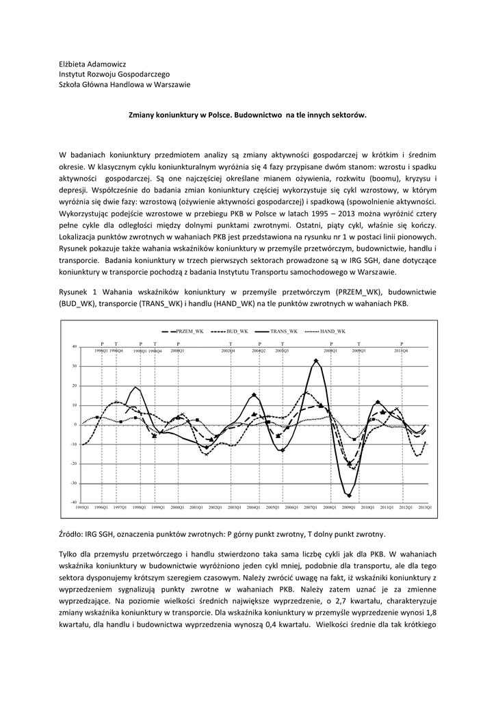Elżbieta Adamowicz Instytut Rozwoju Gospodarczego Szkoła Główna Handlowa w Warszawie Zmiany koniunktury w Polsce. Budownictwo na tle innych sektorów. W badaniach koniunktury przedmiotem analizy są zmiany aktywności gospodarczej w krótkim i średnim okresie. W klasycznym cyklu koniunkturalnym wyróżnia się 4 fazy przypisane dwóm stanom: wzrostu i spadku aktywności gospodarczej. Są one najczęściej określane mianem ożywienia, rozkwitu (boomu), kryzysu i depresji. Współcześnie do badania zmian koniunktury częściej wykorzystuje się cykl wzrostowy, w którym wyróżnia się dwie fazy: wzrostową (ożywienie aktywności gospodarczej) i spadkową (spowolnienie aktywności. Wykorzystując podejście wzrostowe w przebiegu PKB w Polsce w latach 1995 – 2013 można wyróżnić cztery pełne cykle dla odległości między dolnymi punktami zwrotnymi. Ostatni, piąty cykl, właśnie się kończy. Lokalizacja punktów zwrotnych w wahaniach PKB jest przedstawiona na rysunku nr 1 w postaci linii pionowych. Rysunek pokazuje także wahania wskaźników koniunktury w przemyśle przetwórczym, budownictwie, handlu i transporcie. Badania koniunktury w trzech pierwszych sektorach prowadzone są w IRG SGH, dane dotyczące koniunktury w transporcie pochodzą z badania Instytutu Transportu samochodowego w Warszawie. Rysunek 1 Wahania wskaźników koniunktury w przemyśle przetwórczym (PRZEM_WK), budownictwie (BUD_WK), transporcie (TRANS_WK) i handlu (HAND_WK) na tle punktów zwrotnych w wahaniach PKB. PRZEM_WK 40 P T P T BUD_WK P 1996Q1 1996Q4 1998Q1 1998Q4 2000Q1 1996Q1 1998Q1 2000Q1 T 2002Q4 TRANS_WK HAND_WK P T P T P 2004Q2 2005Q3 2008Q1 2009Q3 2011Q4 30 20 10 0 - 10 - 20 - 30 - 40 1995Q1 1997Q1 1999Q1 2001Q1 2002Q1 2003Q1 2004Q1 2005Q1 2006Q1 2007Q1 2008Q1 2009Q1 2010Q1 2011Q1 2012Q1 2013Q1 Źródło: IRG SGH, oznaczenia punktów zwrotnych: P górny punkt zwrotny, T dolny punkt zwrotny. Tylko dla przemysłu przetwórczego i handlu stwierdzono taka sama liczbę cykli jak dla PKB. W wahaniach wskaźnika koniunktury w budownictwie wyróżniono jeden cykl mniej, podobnie dla transportu, ale dla tego sektora dysponujemy krótszym szeregiem czasowym. Należy zwrócić uwagę na fakt, iż wskaźniki koniunktury z wyprzedzeniem sygnalizują punkty zwrotne w wahaniach PKB. Należy zatem uznać je za zmienne wyprzedzające. Na poziomie wielkości średnich największe wyprzedzenie, o 2,7 kwartału, charakteryzuje zmiany wskaźnika koniunktury w transporcie. Dla wskaźnika koniunktury w przemyśle wyprzedzenie wynosi 1,8 kwartału, dla handlu i budownictwa wyprzedzenia wynoszą 0,4 kwartału. Wielkości średnie dla tak krótkiego okresu należy jednak traktować z dużą ostrożnością. Szczegółowe informacje na temat wyprzedzeń w poszczególnych cyklach zawiera tabela 1. Tabela 1. Wyprzedzenia (-) i opóźnienia (+) punktów zwrotnych czynnika cyklicznego PKB przez punkty zwrotne badanych wskaźników koniunktury (w kwartałach). PKB Przemysł Budownictwo Transport Handel 11 10 9 6 11 - 0 1 0 1 1996 Q1 1996 Q4 ns -2 3 ns - -1 -1 T 1996 Q4 -2 ns - 1 P 1998 Q1 -2 ns ns -1 T 1998 Q4 0 3 ns 1 T 1998 Q4 0 3 ns 1 P 2000 Q1 0 1 ns 3 T 2002 Q4 -4 -5 -5 -3 T 2002 Q4 -4 -5 -5 -3 P 2004 Q2 -1 1 -1 2 T 2005 Q3 -1 0 0 1 T 2005 Q3 -1 0 0 1 P 2008 Q1 -2 -5 -3 0 T 2009 Q3 -2 -1 -2 -1 T 2009 Q3 -2 -1 -2 -1 P 2011 Q4 -4 -1 -5 -6 T średnie wyprzedzenie dolnych punktów zwrotnych średnie wyprzedzenie górnych punktów zwrotnych średnie wyprzedzenie wszystkich punktów zwrotnych - - 2012 Q4 - 2012 Q4 -1,8 -0,75 -2,3 -0,5 -1,8 -0,2 -3,0 -0,2 -1,8 -0,4 -2,7 -0,4 ilość sygnalizowanych punktów zwrotnych zmiennej referencyjnej ilość dodatkowych punktów zwrotnych Poprawa po recesji transformacyjnej P T Kryzys rosyjski Kryzys internetowy Bum akcesyjny Kryzys finansowy Kryzys zadłużeniowy Źródło: obliczenia własne na podstawie danych Eurostat, ITS i IRG SGH. Dla lokalizacji punktów zwrotnych w wahaniach wskaźnika koniunktury w budownictwie wyniki są niejednoznaczne. Trzy razy wskaźnik ten z opóźnieniem zareagował na zmiany w dynamice PKB. Dwukrotnie opóźnienia dotyczyły górnego punktu zwrotnego, raz dolnego. Opóźnienia wynosiły odpowiednio 3 i 2 kwartały. Raz lokalizacja punktów zwrotnych w wahaniach PKB i wskaźnika koniunktury w budownictwie pokrywała się. Uzyskane wyniki nie są zgodne z prawidłowością teoretyczną, mówiącą o wyprzedzającym charakterze zmian w budownictwie w stosunku do innych sektorów gospodarki. Ze względu na stosunkowo krótki okres objęty 2 badaniem, ale także i ilość nietypowych wydarzeń, mających w tym okresie miejsce w polskim budownictwie, nie ma jednak wystarczających podstaw do odrzucenia tej prawidłowości. Tym bardziej, iż wskaźnik korelacji wyprzedzających dla budownictwa najwyższą wartość, 0,606 pkt. przyjął dla wyprzedzenia o 3 kwartały. Jest to problem wymagający dalszych obserwacji. Wahania cykliczne badanych zmiennych charakteryzują się zróżnicowanym czasem trwania poszczególnych fazach oraz różną amplitudą. Dla budownictwa czas trwania poszczególnych faz jest dłuższy niż dla pozostałych branż. Średni czas trwania faz spadkowych wynosi 7 kwartałów, faz wzrostowych 7,3 kwartału. Najdłużej, 12 kwartałów, trwała faza wzrostowa podczas boomu akcesyjnego, najdłuższe fazy spadkowa, trwające odpowiednio 11 i 10 kwartałów, miały miejsce podczas kryzysu rosyjskiego i ostatniego kryzysu finansowego. Dla budownictwa czas trwania faz spadkowych jest dłuższy, niż dla pozostałych zmiennych. Dla PKB średnie czasy trwania poszczególnych faz trwają odpowiednio 5,4 i 7 kwartałów. Amplituda wahań cyklicznych wskaźnika koniunktury w budownictwie jest także znacznie większa niż PKB. Różnice w czasie trwania poszczególnych faz jak i amplitudzie wahań widoczne są na rysunku nr 2, który przedstawia wahania czynnika cyklicznego obu zmiennych. Rys.2 Wahania wskaźnika koniunktury w budownictwie (CC