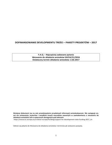 DOFINANSOWANIE DEVELOPMENTU TREŚCI – PAKIETY PROJEKTÓW – 2017 F.A.Q. – Najczęściej zadawane pytania Wezwanie do składania wniosków EACEA/21/2016 Ostateczny termin składania wniosków: 2.02.2017 Niniejszy dokument ma na celu przedstawienie przydatnych informacji wnioskodawcom. Nie zastępuje on, ani nie unieważnia, kryteriów i wszelkich innych warunków zawartych w zawiadomieniu o wezwaniu do składania wniosków lub w wytycznych dostępnych pod adresem: https://eacea.ec.europa.eu/creative-europe/funding/support-for-development-slate-funding-2017_en Odnosi się jedynie do Wezwania do składania wniosków i terminów jak wskazano powyżej. 1 1. KRYTERIA KWALIFIKOWALNOŚCI KWALIFIKUJĄCE SIĘ KRAJE Które kraje mogą uczestniczyć w schematach dotyczących developmentu? Kraje członkowskie UE, a także Islandia, Norwegia, Albania, Bośnia i Hercegowina, Była Jugosłowiańska Republika Macedonii, Czarnogóra i Serbia. Więcej szczegółów znajdą państwo w informacji na temat możliwości uczestnictwa państw spoza UE w programie Kreatywna Europa http://eacea.ec.europa.eu/creative-europe/library/eligibilityorganisations-non-eu-countries_en. Uwaga: Ponieważ lista państw spoza Unii Europejskiej uczestniczących w komponencie MEDIA często się zmienia, zalecamy regularne jej sprawdzanie. KWALIFIKUJĄCY SIĘ WNIOSKODAWCY Jak długo musi firma być legalnie zarejestrowana, aby kwalifikować się w ramach wezwania do składania wniosków? Wnioskująca firma musi być oficjalnie istnieć co najmniej 36 miesięcy przed datą złożenia wniosku (tzn. musi na to wskazywać data zarejestrowania/nadania osobowości prawnej widniejąca w dokumentach rejestrowych). Czy kwalifikuje się stowarzyszenie, którego główną zarejestrowaną działalnością jest „produkcja utworów audiowizualnych” i które prowadzi development i produkcję filmów dokumentalnych od wielu lat? Stowarzyszenie może się kwalifikować, pod warunkiem że jest oficjalnie zarejestrowane na poziomie krajowym i spełnia inne kryteria kwalifikowalności, takie jak produkcja audiowizualna jako główna działalność oraz udokumentowane osiągnięcia. Osoby fizyczne (indywidualne osoby) nie kwalifikują się. Czy istnieją jakieś wymagania dotyczące minimalnej wielkości firmy, która chce wziąć udział w wezwaniu do składania wniosków? Wytyczne nie zawierają żadnego wskazania dotyczącego minimalnej wielkości firmy, kwalifikującej się do dofinansowania pakietu. Ocena zdolności firmy do rozwijania i produkcji pakietu dokonywana jest przez ekspertów w każdym przypadku indywidualnie. Firmę zarejestrowano jako prowadzącą dwa różne rodzaje działalności biznesowej. Jedną z nich jest produkcja filmowa, ale jak udowodnić, że stanowi ona główną działalność? Należy dostarczyć dowód w postaci wyciągu z krajowego rejestru oraz kodu działalności. To najlepszy rodzaj dowodu, ale inne (np. statut firmy) mogą zostać zaakceptowane, jeśli działalność producencka jest wyraźnie określona. Firma została zarejestrowana w 2007 roku. W bieżącym roku jej status prawny został zmieniony i otrzymała nowy numer rejestracyjny. Czy kwalifikuje się ona w obliczu kryterium co najmniej 36 miesięcy legalnego funkcjonowania? 2 Zwykle zmiana nazwy nie oznacza zmiany numeru rejestracyjnego. W przypadku zmiany statusu prawnego, co często pociąga za sobą zmianę numeru rejestracyjnego, dla ustalenia ciągłości działalności wnioskodawca musi udowodnić, że wszelkie aktywa i pasywa dawnej firmy zostały przeniesione do nowego podmiotu i że stara firma została zamknięta. Czy mogą państwo potwierdzić, że dofinansowanie developmentu przyznawane jest tylko pojedynczemu beneficjentowi, a nie kilku koproducentom? Dofinansowanie developmentu to wsparcie dla pojedynczych beneficjentów, dlatego tylko jeden producent powinien zostać wymieniony w e-formularzu. Jednakże, projekty w pakiecie mogą być przedmiotem umowy koprodukcyjnej lub kodevelopmentowej między producentami. Firma wnioskująca musi posiadać większość praw związanych z projektami. W przypadku koprodukcji dwóch firm, czy udziały 50/50 kwalifikują się? A co w przypadku 3 koproducentów? W przypadku 2 koproducentów podział 50/50% praw jest akceptowany. W przypadku 3 producentów, tego który posiada największe udziały uznaje się za właściciela większości praw (przykładowo: 35%-33%-32% własności) i to on powinien składać wniosek. Jakie dowody są wymagane dla wykazania, że aplikująca firma jest właścicielem większości praw związanych w projektem? Wnioskodawca musi wykazać, że posiada większość praw odnoszących się do każdego projektu nie później niż w dniu składania wniosku. Wymagane jest dostarczenie odpowiednio datowanej i podpisanej umowy obejmującej prawa do materiału artystycznego zawartego w aplikacji. Ów materiał artystyczny powinien zawierać co najmniej: koncepcję, temat, treatment, scenariusz lub biblię. Jeśli projekt jest adaptacją istniejącego utworu (powieści, biografii, itd.), wnioskodawca musi również wykazać, że posiada większość praw związanych z prawami do adaptacji tego utworu. KILKA WNIOSKÓW / PONOWNE ZŁOŻENIE WNIOSKU Czy wnioskodawcy mogą aplikować o dofinansowanie pakietu, jak również pojedynczego projektu, dla różnych projektów w nadchodzących wezwaniach do składania wniosków? Nie, to nie jest dozwolone. Wnioskodawca musi wybrać czy aplikuje o dofinansowanie pakietu czy pojedynczego projektu. Jeśli zdecyduje się na projekt pojedynczy, to wniosek można złożyć tylko w jednym terminie zgłoszeń. Ponadto beneficjenci dofinansowania pakietu projektów trwającego od 2014 r. nie mogą aplikować z pojedynczym projektem. Jeśli firma otrzymała dofinansowanie dla pojedynczego projektu w ramach wezwania w roku 2016, czy może ona aplikować o dotację na development treści pakietu projektów w roku 2017? Tak, firma może składać wnios