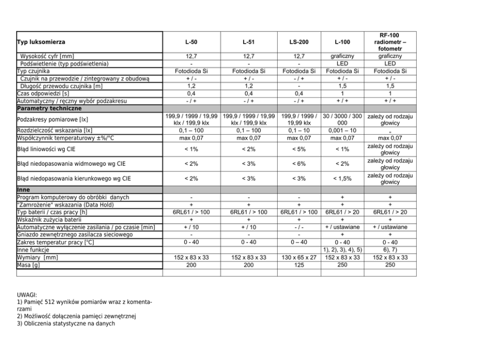 Typ luksomierza Wysokość cyfr [mm] Podświetlenie (typ podświetlenia) Typ czujnika Czujnik na przewodzie / zintegrowany z obudową Długość przewodu czujnika [m] Czas odpowiedzi [s] Automatyczny / ręczny wybór podzakresu Parametry techniczne Podzakresy pomiarowe [lx] Rozdzielczość wskazania [lx] Współczynnik temperaturowy ±%/°C L-50 L-51 LS-200 L-100 12,7 Fotodioda Si +/1,2 0,4 -/+ 12,7 Fotodioda Si +/1,2 0,4 -/+ 12,7 Fotodioda Si -/+ 0,4 -/+ graficzny LED Fotodioda Si +/1,5 1 +/+ 199,9 / 1999 / 19,99 199,9 / 1999 / 19,99 klx / 199,9 klx klx / 199,9 klx 0,1 – 100 0,1 – 100 max 0,07 max 0,07 199,9 / 1999 / 19,99 klx 0,1 – 10 max 0,07 Błąd liniowości wg CIE < 1% < 2% < 5% Błąd niedopasowania widmowego wg CIE < 2% < 3% < 6% Błąd niedopasowania kierunkowego wg CIE < 2% < 3% < 3% + 6RL61 / > 100 + + / 10 0 - 40 + 6RL61 / > 100 + + / 10 0 - 40 + 6RL61 / > 100 + -/0 – 40 152 x 83 x 33 200 152 x 83 x 33 200 130 x 65 x 27 125 Inne Program komputerowy do obróbki danych "Zamrożenie" wskazania (Data Hold) Typ baterii / czas pracy [h] Wskaźnik zużycia baterii Automatyczne wyłączenie zasilania / po czasie [min] Gniazdo zewnętrznego zasilacza sieciowego Zakres temperatur pracy [oC] Inne funkcje Wymiary [mm] Masa [g] UWAGI: 1) Pamięć 512 wyników pomiarów wraz z komentarzami 2) Możliwość dołączenia pamięci zewnętrznej 3) Obliczenia statystyczne na danych RF-100 radiometr – fotometr graficzny LED Fotodioda Si +/1,5 1 +/+ 30 / 3000 / 300 zależy od rodzaju 000 głowicy 0,001 – 10 „ max 0,07 max 0,07 zależy od rodzaju < 1% głowicy zależy od rodzaju < 2% głowicy zależy od rodzaju < 1,5% głowicy + + 6RL61 / > 20 + + / ustawiane + 0 - 40 1), 2), 3), 4), 5) 152 x 83 x 33 250 + + 6RL61 / > 20 + + / ustawiane + 0 - 40 6), 7) 152 x 83 x 33 250 4) Jednoczesne wyświetlanie na ekranie wielu parametrów 5) Pomiar luminancji po zastosowaniu przystawki produkcji Sonopan 6) Jak w punktach 1 – 5 7) Może pracować jako: luksomierz, fitofotometr oraz miernik zagrożenia siatkówki oka światłem niebieskim. Dokładniejsze dane techniczne dostępne na stronie internetowej: www.sonopan.com.pl