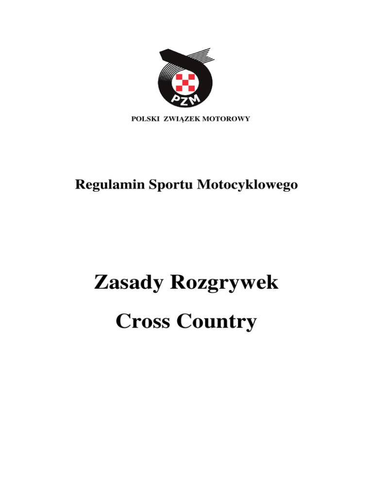 POLSKI ZWIĄZEK MOTOROWY Regulamin Sportu Motocyklowego Zasady Rozgrywek Cross Country Wyrazy zaznaczone pogrubioną czcionką oznaczają zmienione zapisy wprowadzone w porównaniu do roku poprzedniego. Zapisy podkreślone zostały zmodyfikowane podczas spotkania organizatorów i sędziów sportu motocyklowego w lutym 2012. Zasady Rozgrywek Cross Country Wstęp Dyscyplina Cross Country (w skrócie CC) ma na celu propagowanie sportu motocyklowego oraz rozszerzenie możliwości rywalizacji poza tradycyjnymi konkurencjami motocross i enduro. Możliwość startów na okazjonalnych trasach zamkniętych pozwala na udział większej liczby zawodników amatorów na pojazdach nie rejestrowanych w tych regionach Polski, gdzie dotąd nie organizowano zawodów terenowych. Kluby organizujące zawody rangi Mistrzostw Polski oraz Pucharu Polski i zawodnicy biorący w nich udział zobowiązani są do bezwzględnego przestrzegania i respektowania przepisów i zasad zawartych w niżej wymienionych regulaminach: Regulamin Sportu Motocyklowego (Zasady ogólne oraz Zasady rozgrywek Cross Country) Regulamin Techniczny - motocross lub enduro, Kodeks Ochrony Środowiska Regulamin Medyczny Uzupełniający Regulamin Zawodów Komunikaty uzupełniające oraz stosowania jednolitych druków dotyczących zawodów wg załączonych wzorów. I. Ranga zawodów W sezonie 2012 odbędą się zawody zgodnie z kalendarzem centralnym o tytuły: 1. Indywidualnych Mistrzostw Polski w klasach: Senior 1 Senior 2 Junior Junior 85 Quad Open 2. Klubowych Mistrzostw Polski 3. Puchar Polski w klasach: Senior 1 Senior 2 Junior Weteran ▪ Quad 2K ▪ Quad 4K ▪ Quad Junior 2K Do Mistrzostw Polski rozegranych zostanie 14 rund. Do Pucharu Polski rozegranych zostanie 19 rund. II. Organizator Właścicielem rozgrywek jest Polski Związek Motorowy, który na wniosek zainteresowanego klubu zleca organizację zawodów Organizatorowi Wykonawczemu. III. Zasady udziału w zawodach CC Warunkiem dopuszczenia do udziału w zawodach CC jest : posiadanie sprawnego zgodnie z regulaminem technicznym RSM (Motocross, Enduro) pojazdu (motocykl, quad), posiadanie obowiązkowego ubioru sportowego wg RSM, opłacenie wpisowego, posiadanie aktualnych badań lekarskich, posiadanie pisemnej zgody rodziców /opiekunów/ na udział w zawodach w przypadku nieukończonych 18 lat. (w przypadku startu po raz pierwszy – przystąpieniu do egzaminu) opłacenie ubezpieczenia od NNW na czas trwania zawodów (w przypadku braku licencji), opłacenia kosztów egzaminu (w przypadku startu po raz pierwszy), Prawo startu bez licencji w zawodach Pucharu Polski CC wygasa po sklasyfikowaniu zawodnika w jednej rundzie (w zawodach dwudniowych, o ile zawodnik był sklasyfikowany pierwszego dnia, ma prawo startować w drugim dniu tych zawodów bez licencji). W kolejnych zawodach cyklu Cross Country zawodnik ten ma prawo startu wyłącznie z licencją B enduro lub motocross, która należy wyrobić w Zarządzie Okręgu PZM właściwego dla siedziby klubu w którym zawodnik jest zrzeszony. IV. Klasy, wiek zawodników i pojemność motocykli Mistrzostwa Polski CC: • klasa Senior 1 wiek od 15 lat, licencja A motocross, enduro, cross country, motocykl 2T do 125cc – 4T do 250cc • klasa Senior 2 wiek od 17 lat, licencja A motocross, enduro, cross country, motocykl 2T powyżej 175cc do 500cc, 4T powyżej 290cc do 650cc. • klasa Junior wiek 14 do 19 lat, licencja A motocross/enduro/cross country, motocykl 2T o pojemności - do 144 ccm, 4T – do 250 ccm • klasa Junior 85 wiek od 12 do 18 lat, licencja A motocross, enduro, cross country, motocykl 2T o poj. do 85 cc – 4T do 150 cc • klasa Quad Open: o pojazdy czterokołowe 4K o pojemności pojemność do 1000 cc, wiek zawodnika powyżej 16 lat, licencja A motocross, enduro, cross country o pojazdy czterokołowe 2K o pojemności do 750 ccm, wiek zawodnika powyżej 16 lat, licencja A motocross, enduro, cross country Puchar Polski CC: • klasa Senior 1 wiek od 15 lat, licencja B motocross lub B enduro, motocykl 2T o pojemności do 125cc - 4T do 250cc • klasa Senior 2 wiek od 17 lat, licencja B Motocross lub B Enduro, motocykl 2T powyżej 175cc do 500cc, 4T powyżej 290cc do 650cc • Klasa Junior wiek od 14 do 19 lat, licencja B Enduro lub B Motocross, motocykl 2T o pojemności - do 144 ccm, 4T - do 250 ccm, • Klasa Weteran wiek powyżej 40 lat, licencja A lub B motocross lub enduro, motocykl o dowolnej pojemności, • Klasa Quad 2K pojazdy czterokołowe z napędem na tylną oś, pojemność do 750 ccm, wiek zawodnika powyżej 16 roku życia, licencja B Motocross lub B Enduro, • Klasa Quad 4K pojazdy czterokołowe z napędem na dwie osie, pojemność do 1000 ccm, wiek zawodnika powyżej 16 roku życia, licencja B Motocross lub B Enduro, • Klasa Quad Junior2K pojazdy czterokołowe z napędem na tylną oś, od 14 do 19 lat, pojemność do 450 ccm licencja A/B Motocross, Granica dla wieku rozpoczyna się i kończy się z rokiem kalendarzowym. Zawodnik, który w 2012 roku zdobędzie Puchar Polski /zwycięzca konkurencji/ nie ma prawa startu w rozgrywkach o Puchar Polski. Zawodnik ten ma prawo wystartować tylko w rozgrywkach o Mistrzostwo Polski. Nie dotyczy to zawodników klas Weteran, Quad 4K i Quad Junior 2K. V. Numery startowe Numery startowe na rok 2012 można zgłaszać przez firmę Gros (poprzez www.motoresults.pl). Numery raz nadane zawodnikowi obowiązują do końca sezonu: Mistrzostwa Polski - motocykle Senior 1 tło czerwone, cyfry białe Senior 2 tło czerwone, cyfry czarne Junior tło zielone, cyfry białe Junior 85 tło czarne cyfry białe Senior 1 tło czerwone, cyfry białe Senior 2 tło czerwone, cyfry czarne Junior tło zielone, cyfry białe Weteran tło białe, cyfry czarne Puchar polski - motocykle Mistrzostwa Polski - Quady Quad Open tło żółte, cyfry czarne Quad 2K tło białe, cyfry czarne Quad 4K tło białe, cyfry czerwone Quad Junior 2K tło czarne cyfry białe Puchar Polski Quady VI. Zgłoszenia Ter