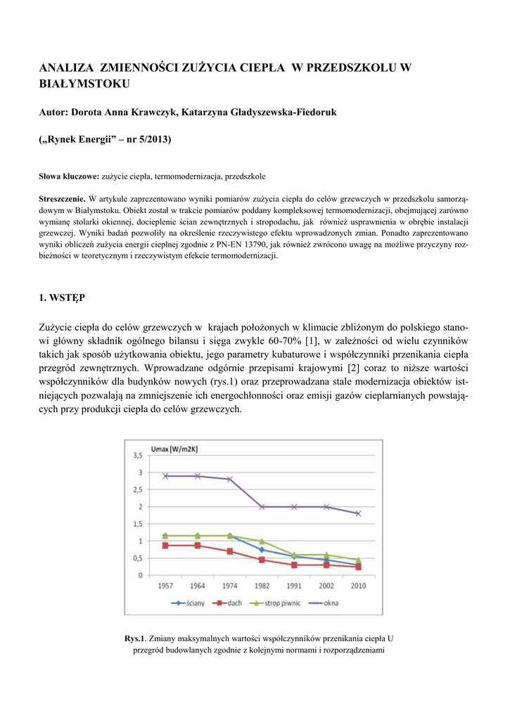 ANALIZA ZMIENNOŚCI ZUŻYCIA CIEPŁA W PRZEDSZKOLU W BIAŁYMSTOKU Autor: Dorota Anna Krawczyk, Katarzyna Gładyszewska-Fiedoruk („Rynek Energii” – nr 5/2013) Słowa kluczowe: zużycie ciepła, termomodernizacja, przedszkole Streszczenie. W artykule zaprezentowano wyniki pomiarów zużycia ciepła do celów grzewczych w przedszkolu samorządowym w Białymstoku. Obiekt został w trakcie pomiarów poddany kompleksowej termomodernizacji, obejmującej zarówno wymianę stolarki okiennej, docieplenie ścian zewnętrznych i stropodachu, jak również usprawnienia w obrębie instalacji grzewczej. Wyniki badań pozwoliły na określenie rzeczywistego efektu wprowadzonych zmian. Ponadto zaprezentowano wyniki obliczeń zużycia energii cieplnej zgodnie z PN-EN 13790, jak również zwrócono uwagę na możliwe przyczyny rozbieżności w teoretycznym i rzeczywistym efekcie termomodernizacji. 1. WSTĘP Zużycie ciepła do celów grzewczych w krajach położonych w klimacie zbliżonym do polskiego stanowi główny składnik ogólnego bilansu i sięga zwykle 60-70% [1], w zależności od wielu czynników takich jak sposób użytkowania obiektu, jego parametry kubaturowe i współczynniki przenikania ciepła przegród zewnętrznych. Wprowadzane odgórnie przepisami krajowymi [2] coraz to niższe wartości współczynników dla budynków nowych (rys.1) oraz przeprowadzana stale modernizacja obiektów istniejących pozwalają na zmniejszenie ich energochłonności oraz emisji gazów cieplarnianych powstających przy produkcji ciepła do celów grzewczych. Rys.1. Zmiany maksymalnych wartości współczynników przenikania ciepła U przegród budowlanych zgodnie z kolejnymi normami i rozporządzeniami 2. ZUŻYCIE CIEPŁA NA CELE GRZEWCZE W OBIEKTACH EDUKACYJNYCH 2.1. Przegląd literatury Energochłonność obiektów użyteczności publicznej jest tematem wielu dyskusji i publikacji. W wielu krajach energochłonność obiektów edukacyjnych była tematem badań, przy czym większość z nich dotyczyła budynków szkół i uczelni wyższych. Wśród opublikowanych wyników prac można znaleźć średnie zużycie ciepła do celów grzewczych w przeliczeniu na m2 powierzchni użytkowej obiektów. Przykładowe wartości dla kilku krajów zestawiono w tabeli 1. Tabela 1 Wskaźniki rocznego zużycia ciepła w wybranych krajach [3]-[8] kraj Grecja Wielka Brytania Irlandia Słowenia Norwegia Zużycie ciepła [kWh/m2rok] 23.1-83.8 [3], 31-46 [4] 240-339 [5], 157 [4] 96 [6] 192 [7] 58-93 [8] Wartość uzyskane w trakcie badań dla budynków położonych w Grecji, są znacznie niższe, niż w przypadku Wielkiej Brytanii, Norwegii, czy Słowenii, co można łatwo wytłumaczyć różnicami w temperaturze zewnętrznej obiektów o różnej lokalizacji. Z przeprowadzonych dotychczas badań własnych wynika, że średnie zużycie ciepła w obiektach szkolnych w Białymstoku w przeliczeniu na m2 powierzchni użytkowej wynosi 135 kWh/m2rok. Podkreślić należy, że wśród badanych obiektów występowały zarówno obiekty o wskaźnikach zużycia ciepła w przeliczeniu na jednostkę powierzchni bardzo niskich, rzędu 48-55 kWh/m2 rok, jak i wysokich dochodzących nawet do 250-270 kWh/m2rok [9]. Również opisywane w literaturze wyniki badań wykazują dosyć dużą rozbieżność między wynikami uzyskanymi dla budynków położonych nawet w tej samej strefie klimatycznej. Może to być spowodowane zarówno różnicą w wieku budynku, a co za tym idzie różnymi współczynnikami przenikania ciepła przegród budowlanych. Przyczyny można też upatrywać w jakości stolarki okiennej i drzwiowej, oraz rzeczywistą krotnością wymian powietrza w pomieszczeniu, które to czynniki wpływają na wartość zapotrzebowania ciepła do ogrzania powietrza wentylacyjnego, którego udział w ogólnym bilansie strat ciepła z roku na rok jest większy. W pojedynczych przypadkach wskaźnik zużycia ciepła w przeliczeniu na m2 powierzchni użytkowej jest stosunkowo wysoki ze względu na sposób użytkowania obiektu, np. częste i długotrwałe wietrzenie pomieszczeń, pozostawianie otwartych okien w nocy. 2.2. Opis obiektu Rozpatrywane przedszkole znajduje się w Białymstoku. Jest to budynek piętrowy, całkowicie podpiwniczony. Obiekt posiada powierzchnię użytkową wynoszącą 2260 m2 i kubaturę ogrzewaną 9300 m3. Budynek został zbudowany w latach 80-tych w technologii uprzemysłowionej z elementów wielkoblokowych typu cegła żerańska o grubości 0,24 m, obustronnie otynkowanych [10]. Stropodach został wykonany częściowo jako wentylowany z płyt korytkowych, na stropie z płyt kanałowych, a częściowo jako pełny niewentylowany z płyt kanałowych ocieplonych wełną mineralną. Widok budynku przedstawia rysunek 2. Rys.2. Badany obiekt Rys.3. Badany obiekt – rzut parteru Piwnica budynku jest przeznaczona na pomieszczenia gospodarcze i magazynowe oraz węzeł cieplny. Na parterze budynku (rys.3) znajduje się część przeznaczona do komunikacji (1) oraz sale poszczególnych grup (2,4,5) wraz z przyległymi do nich sanitariatami i magazynami (3,5,7). Na piętrze badanego przedszkola (rys.4) znajdują się: sale zajęć (8,9,11) i przylegle do nich sanitariaty oraz magazynki (10,12,13), korytarze (15), sala gimnastyczna (18), część kuchenna (16,17) i biurowa (14). N 9 11 8 10 12 13 patio 14 18 15 16 17 Rys.4. Badany obiekt – rzut piętra Ze względu na dążenie do zmniejszenia zużycia ciepła na cele grzewcze w 2007 roku w obiekcie przeprowadzona została kompleksowa termomodernizacja, obejmująca docieplenie przegród zewnętrznych oraz modernizację systemu grzewczego. W ramach zaplanowanych zgodnie z wykonanym audytem energetycznym prac ściany zewnętrzne ocieplono metodą lekką przy użyciu styropianu o grubości 0,14 m. Stropodach wentylowany został ocieplony przy użyciu granulatu wełny mineralnej o grubości 0,16 m, wprowadzonego do przestrzeni między płytami, natomiast stropodach pełny został zmod