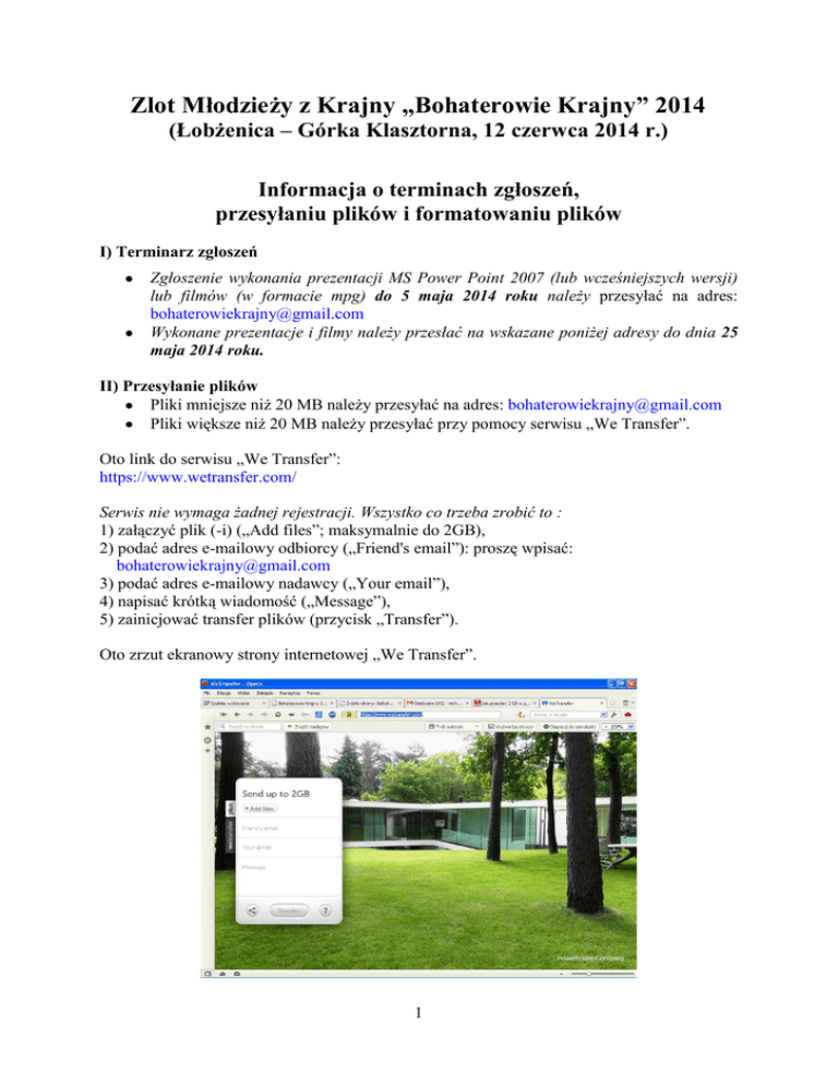Zlot Młodzieży z Krajny „Bohaterowie Krajny” 2014 (Łobżenica – Górka Klasztorna, 12 czerwca 2014 r.) Informacja o terminach zgłoszeń, przesyłaniu plików i formatowaniu plików I) Terminarz zgłoszeń Zgłoszenie wykonania prezentacji MS Power Point 2007 (lub wcześniejszych wersji) lub filmów (w formacie mpg) do 5 maja 2014 roku należy przesyłać na adres: [email protected] Wykonane prezentacje i filmy należy przesłać na wskazane poniżej adresy do dnia 25 maja 2014 roku. II) Przesyłanie plików Pliki mniejsze niż 20 MB należy przesyłać na adres: [email protected] Pliki większe niż 20 MB należy przesyłać przy pomocy serwisu „We Transfer”. Oto link do serwisu „We Transfer”: https://www.wetransfer.com/ Serwis nie wymaga żadnej rejestracji. Wszystko co trzeba zrobić to : 1) załączyć plik (-i) („Add files”; maksymalnie do 2GB), 2) podać adres e-mailowy odbiorcy („Friend's email”): proszę wpisać: [email protected] 3) podać adres e-mailowy nadawcy („Your email”), 4) napisać krótką wiadomość („Message”), 5) zainicjować transfer plików (przycisk „Transfer”). Oto zrzut ekranowy strony internetowej „We Transfer”. 1 III) Prezentacje multimedialne i filmy Prezentacje i filmy powinny zawierać (w podanej kolejności) następujące strony: 1) stronę startową ze zdjęciem lub zdjęciami szkoły (lub innej jednostki) i nazwą szkoły (lub innej jednostki), którą się reprezentuje; 2) stronę z tytułem prezentacji; 3) stronę z nazwiskami autorów prezentacji, poprzedzone napisem: „Autorki prezentacji, uczennice:”, albo „Autorzy prezentacji, uczniowie:” 4) stronę z nazwiskami opiekunów merytorycznych i ich specjalność, poprzedzone napisem „Opieka merytoryczna:”; 5) rzetelne opracowanie tematu (włącznie z właściwie cytowanymi źródłami, w tym użytymi zdjęciami); 6) strony z wyczerpującą bibliografią tematu. Każdemu filmowi powinna towarzyszyć skrócona prezentacja (w formacie MS Power Point 2007 lub wcześniejszej wersji) bez punktu 5. IV) Dozwolone formaty: prezentacja MS Power Point 2007 (pptx) (lub wcześniejsze wersje ppt); filmy: format mpg. V) Schemat bibliografii BIBLIOGRAFIA Źródła archiwalne xxxxxx1. xxxxxx2. Źródła drukowane yyyyyy1. yyyyyy2. Opracowania zzzzzzz1. zzzzzzz2. 1) W przypadku druków zwartych: Imię NAZWISKO rok wydania. Tytuł (kursywą). Miejsce wydania: Wydawnictwo. „Nazwa serwisu” (jeśli dotyczy), adres internetowy (jeśli dotyczy), data dostępu: x (jeśli dotyczy). 2) W przypadku artykułów: Imię NAZWISKO rok wydania. Tytuł (kursywą). „Nazwa czasopisma”, rok x, nr y, s. (strony) u-w. „Nazwa serwisu” (jeśli dotyczy), adres internetowy (jeśli dotyczy), data dostępu: x (jeśli dotyczy). albo: 2 Imię NAZWISKO Rok wydania. Tytuł (kursywą). „Nazwa czasopisma”, data wydania, nr wydania, s. u-w. „Nazwa serwisu” (jeśli dotyczy), adres internetowy (jeśli dotyczy), data dostępu: x (jeśli dotyczy). 3) W przypadku dokumentów elektronicznych: Imię NAZWISKO Rok wydania. Tytuł (kursywą). „Nazwa serwisu”, adres internetowy, data dostępu: x. Na przykład: BIBLIOGRAFIA ŹRÓDŁA ARCHIWALNE Muzeum Ziemi Złotowskiej 2013. Jaśkowie. Materiały archiwalne. ŹRÓDŁA DRUKOWANE Antoni JASIEK (ps. Andrzej KRAJNA–WIELATOWSKI) 1928. Ziemia Złotowska, „Bibljoteka Kresowa. Pogranicze Zachodnie odcięte od Macierzy” t. 1. Poznań; Skład Główny w Księgarni Szkolnej; Wielkopolska Biblioteka Cyfrowa 2005; http://www.wbc.poznan.pl/dlibra/doccontent?id=15223. Antoni JASIEK (ps. Andrzej KRAJNA–WIELATOWSKI) 1932. Miejscowości Pogranicza, „Bibljoteka Kresowa. Pogranicze Zachodnie odcięte od Macierzy”, t. 2. Poznań: Drukarnia Techniczna. Antoni JASIEK 1961. Krwawa granica. Wspomnienia delegata Polskiej Rady Ludowej w Złotowie na konferencję międzynarodową w Spaa (Belgia) – 1920 roku w sprawie ratowania Ziemi Złotowskiej i Piły dla Polski, „Ziemia Nadnotecka” t. 1 1961, nr 2, s. 4–5. Antoni JASIEK 1975. Czterech ostatnich. Księża polscy – obrońcy polskości Ziemi Złotowskiej, [w:] Na okazanie drogi: praca zbiorowa poświęcona pokoleniu księdza Piotra Wawrzyniaka. Poznań: Księgarnia św. Wojciecha, s. 171–203. OPRACOWANIA Jowita KĘCIŃSKA-KACZMAREK, Konrad KACZMAREK 2013. Niecodzienny jubileusz…, „PZL24.pl”, 12.03.2013; http://pzl24.pl/index.php/niecodzienny-jubileusz (dostęp: 24.08.2013). Jan Wróblewski 1989. Paweł Jasiek (1908 –1982). „Rocznik Olsztyński” t. XVI 1989, s. 480–485. 3