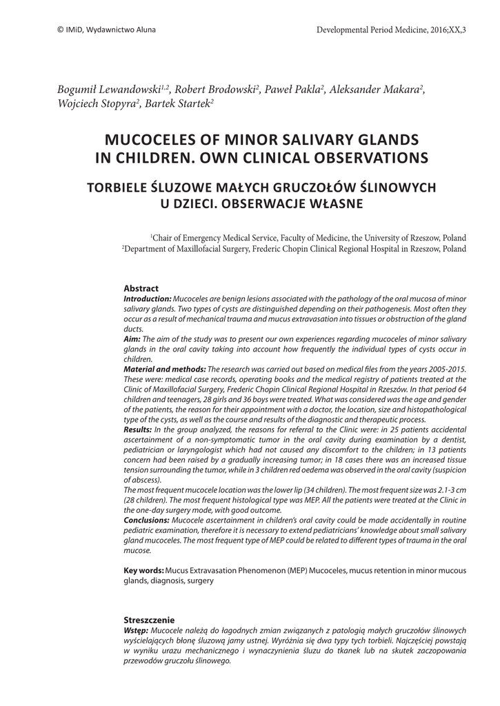 © IMiD, Wydawnictwo Aluna Developmental Period Medicine, 2016;XX,3 235 Bogumił Lewandowski1,2, Robert Brodowski2, Paweł Pakla2, Aleksander Makara2, Wojciech Stopyra2, Bartek Startek2 MUCOCELES OF MINOR SALIVARY GLANDS IN CHILDREN. OWN CLINICAL OBSERVATIONS TORBIELE ŚLUZOWE MAŁYCH GRUCZOŁÓW ŚLINOWYCH U DZIECI. OBSERWACJE WŁASNE Chair of Emergency Medical Service, Faculty of Medicine, the University of Rzeszow, Poland Department of Maxillofacial Surgery, Frederic Chopin Clinical Regional Hospital in Rzeszow, Poland 1 2 Abstract Introduction: Mucoceles are benign lesions associated with the pathology of the oral mucosa of minor salivary glands. Two types of cysts are distinguished depending on their pathogenesis. Most often they occur as a result of mechanical trauma and mucus extravasation into tissues or obstruction of the gland ducts. Aim: The aim of the study was to present our own experiences regarding mucoceles of minor salivary glands in the oral cavity taking into account how frequently the individual types of cysts occur in children. Material and methods: The research was carried out based on medical files from the years 2005-2015. These were: medical case records, operating books and the medical registry of patients treated at the Clinic of Maxillofacial Surgery, Frederic Chopin Clinical Regional Hospital in Rzeszów. In that period 64 children and teenagers, 28 girls and 36 boys were treated. What was considered was the age and gender of the patients, the reason for their appointment with a doctor, the location, size and histopathological type of the cysts, as well as the course and results of the diagnostic and therapeutic process. Results: In the group analyzed, the reasons for referral to the Clinic were: in 25 patients accidental ascertainment of a non-symptomatic tumor in the oral cavity during examination by a dentist, pediatrician or laryngologist which had not caused any discomfort to the children; in 13 patients concern had been raised by a gradually increasing tumor; in 18 cases there was an increased tissue tension surrounding the tumor, while in 3 children red oedema was observed in the oral cavity (suspicion of abscess). The most frequent mucocele location was the lower lip (34 children). The most frequent size was 2.1-3 cm (28 children). The most frequent histological type was MEP. All the patients were treated at the Clinic in the one-day surgery mode, with good outcome. Conclusions: Mucocele ascertainment in children’s oral cavity could be made accidentally in routine pediatric examination, therefore it is necessary to extend pediatricians’ knowledge about small salivary gland mucoceles. The most frequent type of MEP could be related to different types of trauma in the oral mucose. Key words: Mucus Extravasation Phenomenon (MEP) Mucoceles, mucus retention in minor mucous glands, diagnosis, surgery Streszczenie Wstęp: Mucocele należą do łagodnych zmian związanych z patologią małych gruczołów ślinowych wyścielających błonę śluzową jamy ustnej. Wyróżnia się dwa typy tych torbieli. Najczęściej powstają w wyniku urazu mechanicznego i wynaczynienia śluzu do tkanek lub na skutek zaczopowania przewodów gruczołu ślinowego. 236 Bogumił Lewandowski et al. Cel: Celem pracy było przedstawienie własnych spostrzeżeń dotyczących torbieli śluzowych gruczołów ślinowych jamy ustnej z uwzględnieniem typów torbieli występujących u dzieci. Materiał i metody: Badania przeprowadzono na podstawie dokumentacji medycznej z lat 2005-2015. Obejmowała ona historie chorób, księgi operacyjne, księgi rejestru chorych leczonych w Klinice Chirurgii Szczękowo-Twarzowej Klinicznego Szpitala Wojewódzkiego im. Fryderyka Chopina w Rzeszowie. W okresie tym leczono 64 dzieci i młodzieży, w tym 28 dziewcząt i 36 chłopców. Oceniano wiek i płeć pacjentów, przyczyny zgłoszenia się do lekarza, umiejscowienie cysty, wielkość i typ histopatologiczny torbieli śluzowych, a także przebieg i wyniki procesu diagnostycznego i terapeutycznego. Wyniki: W badanej grupie przyczyną skierowania pacjenta do Kliniki było: u 25 pacjentów stwierdzenie w czasie badania przez stomatologa, pediatrę lub laryngologa, istnienia guzka w jamie ustnej, niepowodującego żadnych dolegliwości, u 13 pacjentów niepokój wzbudził guzek stopniowo powiększający się, u 18 wzmożone napięcie tkanek wokół guzka, u trojga zaczerwienienie i obrzęk (podejrzenie ropnia). Najczęstszym miejscem występowania torbieli była warga dolna (34 dzieci). Wielkość torbieli najczęściej wynosiła 2,1-3 cm (28 dzieci). Najczęstszym typem histologicznym mukoceli było MEP. Wszyscy pacjenci byli leczeni w Klinice w oddziale pracującym w trybie chirurgii jednego dnia, z dobrym wynikiem. Wnioski: Stwierdzenie guzka (torbieli) w jamie ustnej u dziecka może być przypadkowe podczas rutynowego badania również przez pediatrów, stąd konieczne jest rozszerzenie wiedzy dotyczącej torbieli śluzowych małych gruczołów ślinowych. Najczęściej występujący typ MEP może mieć związek z różnego typu urazami błony śluzowej jamy ustnej. Słowa kluczowe: torbiele śluzowe związane z wynaczynieniem śluzu, retencja śluzu w małych gruczołach ślinowych, diagnostyka, leczenie chirurgiczne DEV PERIOD MED. 2016;XX,3:235242 INTRODUCTION Mucocele is a cyst of the minor salivary glands located in the oral mucosa. These cysts may also develop in the major salivary glands, predominantly in the sublingual salivary gland. Sublingual ranulas are located in the fundus of the oral cavity. Mucoceles may appear anywhere on the mucosa, however, they appear most commonly on the lower lip, or less frequently on the cheek, palate or tongue mucosa [1, 2, 3]. Mucoceles of minor mucous glands are usually present as a single oval or round nodular lesion growing submucosally and often protruding over the mucosa. The nodules are filled with mucus, which shines through the mucous tissue resultin