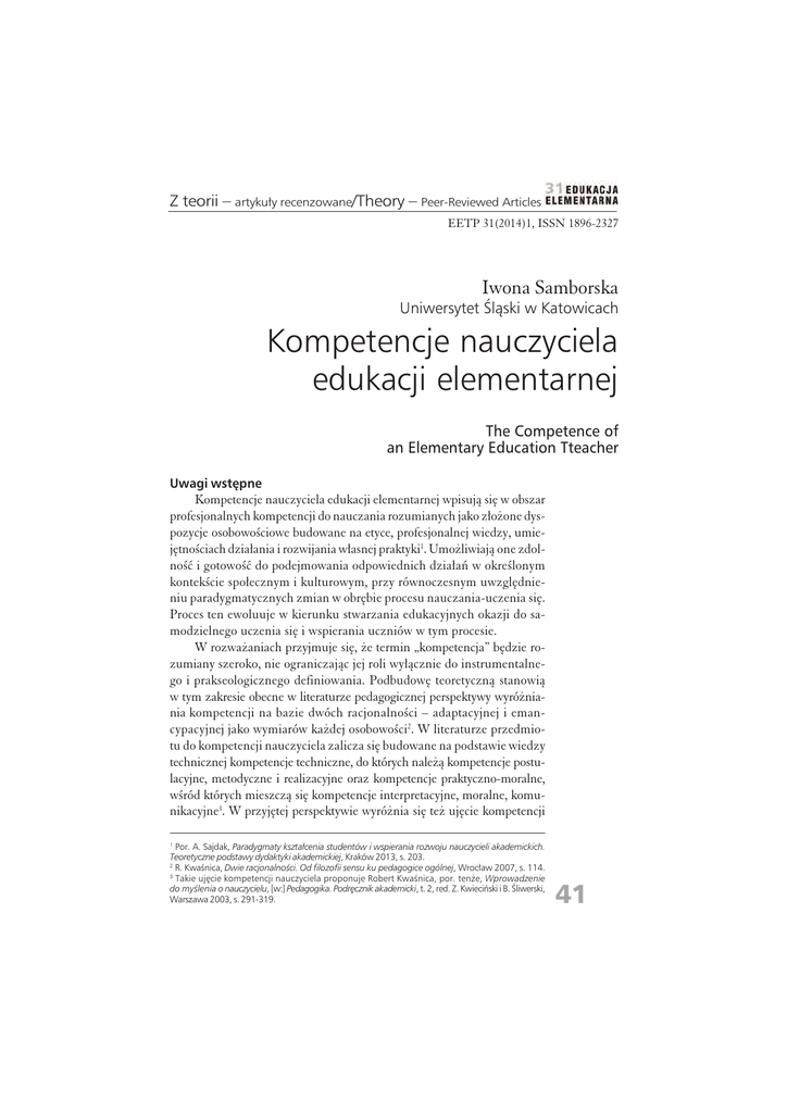 Z teorii – artykuły recenzowane/Theory – Peer-Reviewed Articles EETP 31(2014)1, ISSN 1896-2327 Iwona Samborska Uniwersytet Śląski w Katowicach Kompetencje nauczyciela edukacji elementarnej The Competence of an Elementary Education Tteacher Uwagi wstępne Kompetencje nauczyciela edukacji elementarnej wpisują się w obszar profesjonalnych kompetencji do nauczania rozumianych jako złożone dyspozycje osobowościowe budowane na etyce, profesjonalnej wiedzy, umiejętnościach działania i rozwijania własnej praktyki1. Umożliwiają one zdolność i gotowość do podejmowania odpowiednich działań w określonym kontekście społecznym i kulturowym, przy równoczesnym uwzględnieniu paradygmatycznych zmian w obrębie procesu nauczania-uczenia się. Proces ten ewoluuje w kierunku stwarzania edukacyjnych okazji do samodzielnego uczenia się i wspierania uczniów w tym procesie. W rozważaniach przyjmuje się, że termin „kompetencja” będzie rozumiany szeroko, nie ograniczając jej roli wyłącznie do instrumentalnego i prakseologicznego definiowania. Podbudowę teoretyczną stanowią w tym zakresie obecne w literaturze pedagogicznej perspektywy wyróżniania kompetencji na bazie dwóch racjonalności – adaptacyjnej i emancypacyjnej jako wymiarów każdej osobowości2. W literaturze przedmiotu do kompetencji nauczyciela zalicza się budowane na podstawie wiedzy technicznej kompetencje techniczne, do których należą kompetencje postulacyjne, metodyczne i realizacyjne oraz kompetencje praktyczno-moralne, wśród których mieszczą się kompetencje interpretacyjne, moralne, komunikacyjne3. W przyjętej perspektywie wyróżnia się też ujęcie kompetencji Por. A. Sajdak, Paradygmaty kształcenia studentów i wspierania rozwoju nauczycieli akademickich. Teoretyczne podstawy dydaktyki akademickiej, Kraków 2013, s. 203. 2 R. Kwaśnica, Dwie racjonalności. Od filozofii sensu ku pedagogice ogólnej, Wrocław 2007, s. 114. 3 Takie ujęcie kompetencji nauczyciela proponuje Robert Kwaśnica, por. tenże, Wprowadzenie do myślenia o nauczycielu, [w:] Pedagogika. Podręcznik akademicki, t. 2, red. Z. Kwieciński i B. Śliwerski, Warszawa 2003, s. 291-319. 1 41 Z teorii – artykuły recenzowane/Theory – Peer-Reviewed Articles jako potencjał adaptacyjny i potencjał transgresyjny podmiotu4. Kompetencje nauczyciela w perspektywie racjonalności adaptacyjnej budowane są na bazie wiedzy technicznej wskazującej cele, sposoby ich osiągania oraz środki i warunki, od których zależy możliwość osiągnięcia celów. Składają się one na potencjał adaptacyjny nauczyciela, wyrażający się w byciu sprawnym i efektywnym dydaktykiem. Kompetencje nauczyciela w perspektywie racjonalności emancypacyjnej budowane są na bazie wiedzy moralno-praktycznej nabywanej w szeroko pojętym dialogu na temat rozumienia świata, nadawania sensu i komunikowania go z innymi. Ten rodzaj wiedzy tworzy potencjał transgresyjny podmiotu, pozwalający na samodzielną interpretację oraz twórczą modyfikację działań. Kompetencje nauczyciela w tym ujęciu mają charakter procesualny i rozumiane są jako swoista relacja ze światem w kontekście zmieniającej się rzeczywistości kulturowej5. Celem artykułu jest zwrócenie uwagi na znaczenie oraz specyfikę kompetencji osobowych, metodycznych, społecznych i komunikacyjnych nauczyciela edukacji elementarnej w obliczu wyzwań współczesności. Kompetencje nauczyciela wobec wyzwań edukacyjnych Współczesny nauczyciel edukacji elementarnej to osoba mająca zdolność krytycznego oglądu siebie, świata oraz siebie w świecie w roli nauczyciela. Wśród wymiarów jego kompetencji szczególne miejsce zajmują kompetencje osobowe, które stają się źródłem rozwoju wszelkich kompetencji zawodowych – metodycznych, społecznych i komunikacyjnych. Wpływają one na pozostałe obszary funkcjonowania, w tym również na obszar związany z wypełnianiem roli nauczyciela, projektowaniem ścieżki własnego rozwoju osobowego i zawodowego oraz działaniem ukierunkowanym na kształtowanie relacji z drugim człowiekiem6. Innymi słowy nauczyciel edukacji elementarnej to osoba, która posiada zdolność doskonalenia siebie i swojej praktyki w szybko zmieniającym się świecie. Ciągle poszukuje i zastanawia się: Co jest ważne w edukacji dziecka w świecie zmiennym stawiającym coraz wyższe wymagania? Jak ma wyglądać edukacyjne wspieranie rozwoju dzieci/uczniów w obliczu wciąż nowych doświadczeń edukacyjnych oraz nowych relacji (w tym nowych relacji między nauczycielem i uczniem, a także relacji pomiędzy uczniami)? Jak ma wyglądać edukacja, gdy uczeń ma możliwość dostępu do informacji na różnorodne sposoby (np. wykorzystując urządzenia 42 4 A. Męczkowska, Kompetencja, [w:] Encyklopedia pedagogiczna XXI wieku, red. T. Pilch, t. 2, Warszawa 2003, s. 693-696. 5 A. Sajdak, Paradygmaty kształcenia studentów i wspierania rozwoju nauczycieli akademickich. Teoretyczne podstawy dydaktyki akademickiej, dz. cyt., s. 202. 6 Tamże, s. 206. mobilne do celów edukacyjnych, aplikacje zaprojektowane na urządzenia przenośne, korzystając z otwartego oprogramowania)? Jak organizować edukację, wykorzystując najnowszą wiedzę z zakresu funkcjonowania mózgu i sposobów odbioru danych (uwaga skupia się na takich problemach, jak doświadczenia wizualne i myślenie obrazami, rozszerzanie percepcji i rzeczywistość rozszerzona, wykorzystywanie całego ciała w uczeniu się i nauka oparta na gestach, nauczanie i uczenie się przyjazne mózgowi, czyli neurodydaktyka)? W strumieniu pytań nie brakuje również tych nawiązujących do idei indywidualizacji i podmiotowości: Co jest ważne w edukacji zorientowanej na ucznia i skupiającej się na jego indywidualnych potrzebach? Co i jak robić, aby aktywizować, pożądane współcześnie, myślenie matematyczno-przyrodnicze oraz zdobywanie doświadczeń, które w przyszłości będą podtrzymywać zainteresowa