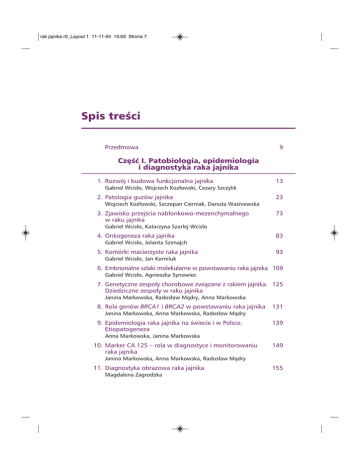 rak jajnika r0_Layout 1 11-11-04 15:03 Strona 7 Spis treści Przedmowa 9 Część I. Patobiologia, epidemiologia i diagnostyka raka jajnika 1. Rozwój i budowa funkcjonalna jajnika 13 Gabriel Wcisło, Wojciech Kozłowski, Cezary Szczylik 2. Patologia guzów jajnika 23 Wojciech Kozłowski, Szczepan Cierniak, Danuta Waśniewska 3. Zjawisko przejścia nabłonkowo-mezenchymalnego w raku jajnika 73 Gabriel Wcisło, Katarzyna Szarlej-Wcisło 4. Onkogeneza raka jajnika 83 Gabriel Wcisło, Jolanta Szenajch 5. Komórki macierzyste raka jajnika 93 Gabriel Wcisło, Jan Korniluk 6. Embrionalne szlaki molekularne w powstawaniu raka jajnika 109 Gabriel Wcisło, Agnieszka Synowiec 7. Genetyczne zespoły chorobowe związane z rakiem jajnika. 125 Dziedziczne zespoły w raku jajnika Janina Markowska, Radosław Mądry, Anna Markowska 8. Rola genów BRCA1 i BRCA2 w powstawaniu raka jajnika 131 Janina Markowska, Anna Markowska, Radosław Mądry 9. Epidemiologia raka jajnika na świecie i w Polsce. Etiopatogeneza 139 Anna Markowska, Janina Markowska 10. Marker CA 125 – rola w diagnostyce i monitorowaniu raka jajnika 149 Janina Markowska, Anna Markowska, Radosław Mądry 11. Diagnostyka obrazowa raka jajnika Magdalena Zagrodzka 155 rak jajnika r0_Layout 1 11-11-04 15:03 Strona 8 Część II. Postępowanie u chorych na raka jajnika 12. Leczenie chirurgiczne raka jajnika, raka jajowodu i raka otrzewnej 181 Kamil Zalewski, Jakub Rzepka, Mariusz Bidziński 13. Miejsce laparoskopii w raku jajnika 205 Włodzimierz Baranowski, Jacek Doniec 14. Zasady chemioterapii nowotworów i wybrane cytostatyki 215 stosowane w leczeniu systemowym raka jajnika Gabriel Wcisło 15. Chemioterapia pierwszego rzutu w raku jajnika 229 Radosław Mądry, Janina Markowska 16. Chemioterapia drugiej linii i ratująca w raku jajnika 247 Lubomir Bodnar, Agnieszka Gąsowska-Bodnar 17. Chemioterapia wysokodawkowa w raku jajnika z następczym przeszczepieniem szpiku kostnego lub wlewem krwiotwórczych komórek macierzystych pozyskanych z krwi obwodowej 261 Radosław Mądry, Gabriel Wcisło 18. Toksyczność ostra i powikłania późne chemioterapii w raku jajnika 267 Agnieszka Gąsowska-Bodnar, Lubomir Bodnar 19. Mechanizmy oporności na cytostatyki stosowane w leczeniu raka jajnika 285 Marta Smoter 20. Angiogeneza towarzysząca rakowi jajnika a nowe możliwości terapeutyczne 297 Gabriel Wcisło, Janina Markowska, Katarzyna Szarlej-Wcisło, Cezary Szczylik 21. Nowe, eksperymentalne sposoby leczenia raka jajnika w trakcie badań 317 Gabriel Wcisło, Janina Markowska, Katarzyna Szarlej-Wcisło, Cezary Szczylik 22. Radioterapia u chorych na raka jajnika 343 Maria Górnaś 23. Jakość życia kobiet chorych na raka jajnika – aspekty medyczne i psychologiczne Anna Kieszkowska-Grudny 353