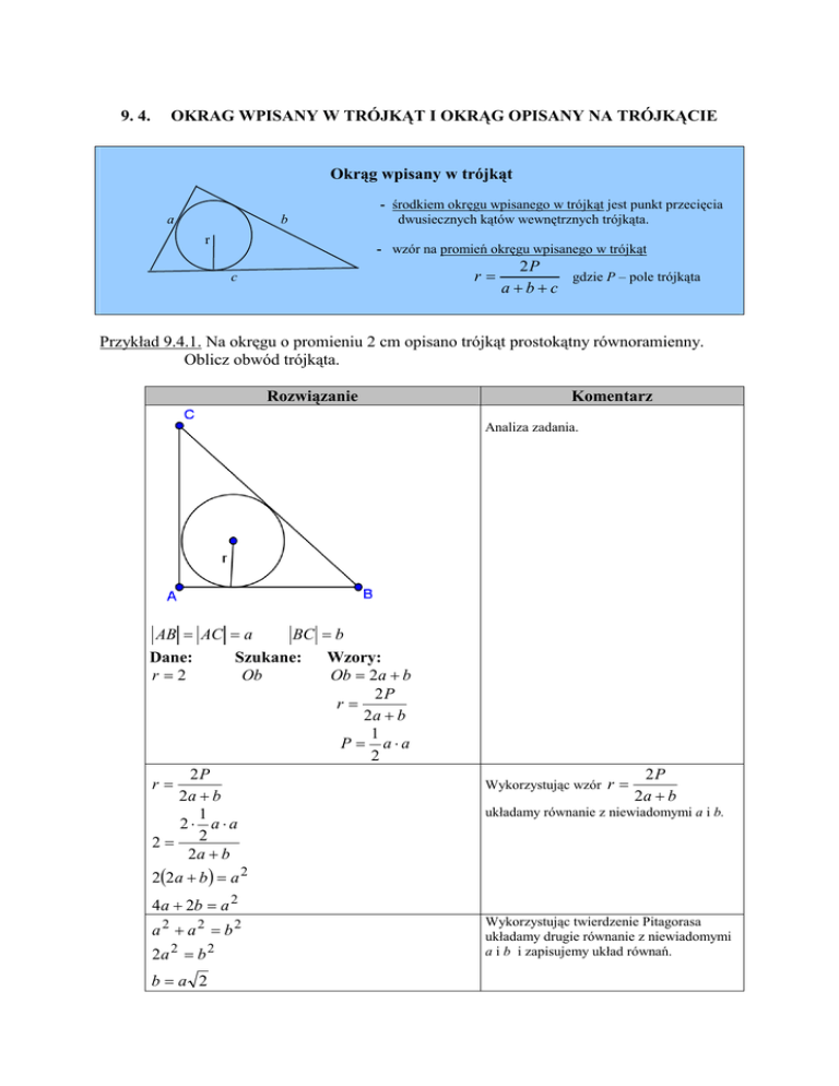 9. 4. OKRAG WPISANY W TRÓJKĄT I OKRĄG OPISANY NA TRÓJKĄCIE Okrąg wpisany w trójkąt a b r - środkiem okręgu wpisanego w trójkąt jest punkt przecięcia dwusiecznych kątów wewnętrznych trójkąta. - wzór na promień okręgu wpisanego w trójkąt r= c 2P gdzie P – pole trójkąta a+b+c Przykład 9.4.1. Na okręgu o promieniu 2 cm opisano trójkąt prostokątny równoramienny. Oblicz obwód trójkąta. Rozwiązanie Komentarz Analiza zadania. AB = AC = a BC = b Dane: Szukane: Wzory: r=2 Ob Ob = 2a + b 2P r= 2a + b 1 P = a⋅a 2 2P r= 2a + b 1 2⋅ a⋅a 2= 2 2a + b Wykorzystując wzór r= 2P 2a + b układamy równanie z niewiadomymi a i b. 2(2a + b ) = a 2 4a + 2b = a 2 a2 + a2 = b2 2a 2 = b 2 b=a 2 Wykorzystując twierdzenie Pitagorasa układamy drugie równanie z niewiadomymi a i b i zapisujemy układ równań. b = a 2 4a + 2b = a 2 Układ równań rozwiązujemy metodą podstawiania. 4a + 2 ⋅ a 2 = a 2 / : a Równanie moŜemy podzielić przez a , bo a>0 4+2 2 = a ( ) b = a 2 = 4+2 2 ⋅ 2 = 4 2 +4 ( Obliczamy b ) Ob = 2a + b = 2 4 + 2 2 + 4 2 + 4 = Obliczamy obwód trójkąta. = 8 + 4 2 + 4 2 + 4 = 12 + 8 2 Okrąg opisany na trójkącie - środkiem okręgu opisanego na trójkącie jest punkt przecięcia symetralnych boków trójkąta S – środek okręgu okrąg opisany na trójkącie ostrokątnym ·S okrąg opisany na trójkącie prostokątnym ·S okrąg opisany na trójkącie rozwartokątnym · • ·S γ a a RR b b β - wzory na promień okręgu opisanego na trójkącie c c α R= a ⋅b⋅c 4P R= a b c = = 2 sin α 2 sin β 2 sin γ gdzie P – pole trójkąta Wzór na promień okręgu opisanego na trójkącie prostokątnym: R = 1 c 2 Przykład 9.4.2. Trójkąt prostokątny jest wpisany w okrąg o promieniu 4 . Oblicz pole tego 3 trójkąta, jeśli stosunek długości przyprostokątnych wynosi . 4 Rozwiązanie Komentarz Analiza zadania. Dane: Szukane: R=4 P a 3 = b 4 1 c /⋅ 2 2 8=c 4= a2 + b2 = c2 a 2 + b 2 = 64 a 3 b = 4 a 2 + b 2 = 64 3 a = 4 b 2 3 b + b 2 = 64 4 Wzory: 1 R= c 2 1 P = a ⋅b 2 Wykorzystując wzór R= 1 c, 2 obliczamy c. Wykorzystując twierdzenie Pitagorasa układamy równanie z niewiadomymi a i b. Budujemy układa równań, który rozwiązujemy metodą podstawiania. 9 2 16 2 b + b = 64 16 16 25 2 16 b = 64 /⋅ 16 25 1024 b2 = 25 32 b= 5 Obliczamy a 3 3 32 24 b= ⋅ = 4 4 5 5 1 1 24 32 384 P = a ⋅b = ⋅ ⋅ = 2 2 5 5 25 a= Obliczamy pole trójkąta. Przykład 9.4.3. Okrąg o promieniu długości 2cm jest opisany na trójkącie. Znajdź długość boku tego trójkąta wiedząc, Ŝe kąt leŜący naprzeciw tego boku ma miarę 30° . Rozwiązanie Komentarz Analiza zadania. Dane: Szukane: R = 2cm a α = 30° a 2 sin 30° a 2= 1 2⋅ 2 2=a 2= Wzory: a R= 2 sin α Obliczamy a , wykorzystując wzór: R= a 2 sin α ĆWICZENIA Ćwiczenie 9.4.1. (3pkt ) Okrąg o promieniu długości 1,5cm jest wpisany w trójkąt równoramienny . Oblicz pole tego trójkąta wiedząc ,Ŝe jego podstawa ma 6 cm . schemat oceniania Numer odpowiedzi Odpowiedź 2 Podanie układu równań z niewiadomą h – wysokość trójkąta oraz b – ramię trójkąta. Podanie wysokości trójkąta h. 3 Podanie pola trójkąta. 1 Liczba punktów 1 1 1 Ćwiczenie 9.4.2. (3pkt ) Promień okręgu opisanego na trójkącie prostokątnym wynosi 4cm . Oblicz pole tego trójkąta, jeśli jeden z kątów ostrych wynosi 30° . schemat oceniania Numer odpowiedzi Odpowiedź Liczba punktów 1 Podanie długości przeciwprostokątnej. 1 2 Podanie długości przyprostokątnych. 1 3 Podanie pola trójkąta. 1 Ćwiczenie 9.4.3. (3pkt ) Podstawa trójkąta równoramiennego wynosi 4 . Środek okręgu opisanego na tym trójkącie dzieli wysokość opuszczoną na podstawę w stosunku 3 : 5 . Oblicz obwód trójkąta. schemat oceniania Numer odpowiedzi Odpowiedź 2 Podanie długości odcinków na jakie środek okręgu dzieli wysokość trójkąta. Podanie długości ramienia trójkąta. 3 Podanie obwodu trójkąta. 1 Liczba punktów 1 1 1 Ćwiczenie 9.4.4. (2pkt ) W trójkącie równoramiennym kąt między ramionami wynosi 120° , a wysokość opuszczona na podstawę ma długość 6 cm . Oblicz promień okręgu opisanego na trójkącie. schemat oceniania Numer odpowiedzi Odpowiedź Liczba punktów 1 Podanie długości ramienia trójkąta 1 2 Podanie promienia okręgu opisanego na trójkącie. 1