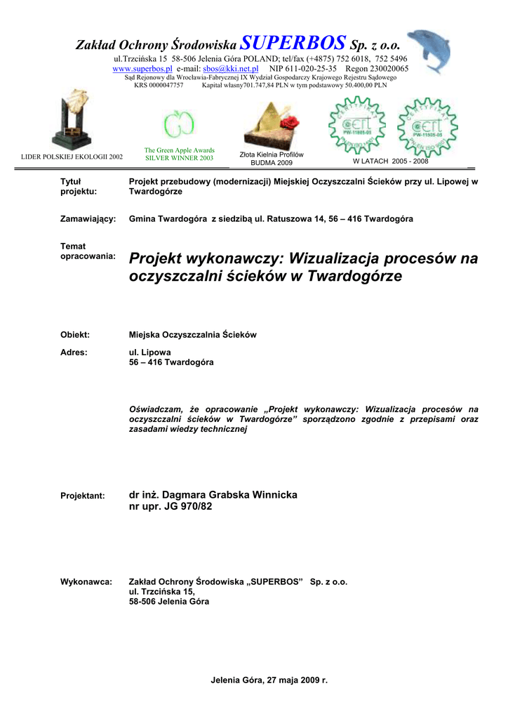 Zakład Ochrony Środowiska SUPERBOS Sp. z o.o. ul.Trzcińska 15 58-506 Jelenia Góra POLAND; tel/fax (+4875) 752 6018, 752 5496 www.superbos.pl e-mail: [email protected] NIP 611-020-25-35 Regon 230020065 Sąd Rejonowy dla Wrocławia-Fabrycznej IX Wydział Gospodarczy Krajowego Rejestru Sądowego KRS 0000047757 Kapitał własny701.747,84 PLN w tym podstawowy 50.400,00 PLN LIDER POLSKIEJ EKOLOGII 2002 The Green Apple Awards SILVER WINNER 2003 Złota Kielnia Profilów BUDMA 2009 W LATACH 2005 - 2008 Tytuł projektu: Projekt przebudowy (modernizacji) Miejskiej Oczyszczalni Ścieków przy ul. Lipowej w Twardogórze Zamawiający: Gmina Twardogóra z siedzibą ul. Ratuszowa 14, 56 – 416 Twardogóra Temat opracowania: Projekt wykonawczy: Wizualizacja procesów na oczyszczalni ścieków w Twardogórze Obiekt: Miejska Oczyszczalnia Ścieków Adres: ul. Lipowa 56 – 416 Twardogóra Oświadczam, że opracowanie „Projekt wykonawczy: Wizualizacja procesów na oczyszczalni ścieków w Twardogórze” sporządzono zgodnie z przepisami oraz zasadami wiedzy technicznej Projektant: dr inż. Dagmara Grabska Winnicka nr upr. JG 970/82 Wykonawca: Zakład Ochrony Środowiska „SUPERBOS” Sp. z o.o. ul. Trzcińska 15, 58-506 Jelenia Góra Jelenia Góra, 27 maja 2009 r. 1 SPIS TREŚCI: str. 1. WSTĘP. 4 1.1. PODSTAWA OPRACOWANIA. 4 1.2. PRZEDMIOT OPRACOWANIA. 4 1.3. ZAKRES OPRACOWANIA. 4 2. OPIS TECHNICZNY. 5 2 SPIS RYSUNKÓW: Rys. nr 1. Elementy sterowania i automatyki – Hala dmuchaw Rys. nr 2. Elementy sterowania i automatyki – Przepompownia parter Rys. nr 3. Elementy sterowania i automatyki – Przepompownia piwnica Rys. nr 4. Elementy sterowania i automatyki – Teren oczyszczalni Rys. nr 5. Szafka sterown. zasil. TD – zasilanie Rys. nr 6. Szafa sterown. zasil. TD – wejścia sterownika Rys. nr 7. Szafa sterown. zasil. TD – wyjścia sterownika. Rys. nr 8. Szafa sterown. zasil. TD we/wy analogowe Rys. nr 9. Szafa sterown. zasil. TD – zasil. dmuchawy DM-1 Rys. nr 10. Szafa sterown. zasil. TD – zasil. dmuchawy DM-2 Rys. nr 11. Szafa sterown. zasil. TD – zasil. dmuchawy DM-3 Rys. nr 12. Szafa sterown. zasil. TD – zasil. dmuchawy DM-4 Rys. nr 13. Szafa sterown. zasil. TD – zasil. dmuchawy DM-5 Rys. nr 14. Szafa sterown. zasil. TD elewacja 3 1. WSTĘP. 1.1. PODSTAWA OPRACOWANIA. Podstawę opracowania projektu wykonawczego „Wizualizacja procesów na oczyszczalni ścieków w TWARDOGÓRZE” stanowi umowa Nr UMiG-IT-0342-81RC/08 z dnia 26.11.2008 r. zawarta pomiędzy Gminą TWARDOGÓRA „Zamawiającym” a Zakładem Ochrony Środowiska „SUPERBOS” Sp. z o.o. w Jeleniej Górze „Wykonawcą”. 1.2 PRZEDMIOT OPRACOWANIA. Przedmiotem opracowania technologicznych zachodzących TWARDOGÓRZE. jest wizualizacja procesów w oczyszczalni ścieków w 1.3. ZAKRES OPRACOWANIA, Projekt obejmuje swoim zakresem : - wytyczne do doboru urządzeń pozwalających na wyświetlenie oraz sygnalizację na panelu stanów pracy urządzeń zainstalowanych na oczyszczalni w TWARDOGÓRZE, dzięki którym prowadzone są procesy technologiczne oczyszczania ścieków, - rozmieszczenie kamer oraz dobór urządzeń do podglądu i rejestracji na płycie CD-ROM obrazu terenu oczyszczalni ze szczególnym monitorowaniem samochodów asenizacyjnych dowożących ścieki oraz osady. 4 2. OPIS TECHNICZNY. W dyżurce obsługi należy zainstalować szafę sterowniczą SS do której należy doprowadzić (vide projekt budowlany- elektryczny) przewody sterownicze z urządzeń znajdujących się odpowiednio w pomieszczeniach oczyszczalni: ŁĄCZNIK POMIIEDZY REAKTORAMI BIOLOGICZNYMI • Stanowisko PIX-u – praca dwóch pompek dawkujących: - dawkowanie PIX-u do dwóch reaktorów –praca-awaria • Hala dmuchaw – szafa dmuchaw SZD - praca pięciu dmuchaw –praca -awaria, - stany tlenu w dwóch reaktorach nitryfikacji • Pompa do osadu – praca - awaria • Praca czterech mieszadeł w reaktorach –praca - awaria Zebrane sygnały przesyłane poprzez stanowisko – szafkę rozdzielnicy głównej dmuchaw RG-D do szafy SS w dyżurce oraz dodatkowo poprzez radiomodem. ZMODERNIZOWANY BUDYNEK PRZEPOMPOWNI PARTER • Hala odwadniania i higienizacji osadu – praca prasy oraz dawkownika wapna – higienizacja osadów - sygnalizacja praca – awaria każdego z tych urządzeń 5 PIWNICA - przepompownia ścieków do reaktorów biologicznych - dwa ciągi po dwie pompy – praca-awaria każdej pompy - sygnalizacja przekazywana z indywidualnych szaf sterowniczych ciągów pomp, - dmuchawy do podnośników w osadnikach – praca – awaria każdej dmuchawy, - przepompownia na złoża biologiczne - dwie pompy – praca – awaria pomp-przekaz z indywidualnej skrzynki sterowniczej pomp. Hermetyczna stacja zlewcza do ścieków dowożonych- ilość dowożonych ścieków, awaria pompowania. Hermetyczna stacja zlewcza do osadów dowożonych – ilość dowożonych osadów ,awaria pompowania. Przepompownia osadów dowożonych – dwie pompy –awaria – praca – przekaz z indywidualnej skrzynki sterowniczej pomp. Sitopiaskownik – praca lub awaria sita, przenośników ślimakowych. Przepływomierz - przetwornik ultradźwiękowy w studzience na kanale wylotowym oczyszczonych ścieków na terenie oczyszczalni – pomiar ilości ścieków wypływających z oczyszczalni. Zgarniacz osadu z osadników wtórnych – praca – awaria- przekaz z indywidualnej szafy sterowniczej zgarniacza. 6 MOMITORING TERENU OCZYSZCZALNI . Na terenie oczyszczalni będą zainstalowane obserwujące teren oczyszczalni zamontowane na: - na budynku biurowym skierowana dowożonych, trzy kamery na stację zwleczą ścieków - na budynku przepompowni skierowana na wjazd oczyszczalni, - na budynku przepompowni skierowana na zgarniaczem. na teren osadniki wtórne ze Zadaniem szafy sterowniczej zamontowanej w dyżurce jest zbieranie stanów pracy i wysyłanie sygnałów sterowania oraz monitoring pracy urządzeń zainstalowanych na oczyszczalni poprzez komputer. Panel, komputer W