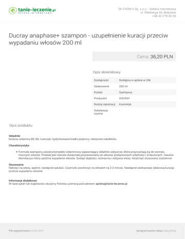 SK-FARM II Sp. z o.o. - Apteka Internetowa ul. Kleeberga 34, Białystok +48 42 279 40 05 Ducray anaphase+ szampon - uzupełnienie kuracji przeciw wypadaniu włosów 200 ml Cena: 36,20 PLN Opis słownikowy Dostępność Dostępny w aptece w 24h Opakowanie 200 ml Postać Szampony Producent DUCRAY Rodzaj rejestracji Kosmetyk Substancja czynna - Opis produktu Składniki biotyna, witaminy B5, B6, ruszczyk, hydrolizowane białko pszenicy, nikotynian tokoferolu Charakterystyka Formuła szamponu zawiera kompleks witaminowy zapewniający składniki odżywcze, które przyczyniają się do wzrostu mocnych włosów. Produkt jest również doskonale przystosowany do włosów pozbawionych witalności i zmęczonych. Zawiera Monolauryn, który opóźnia wypadanie włosów. Dodaje objętości, wzmacnia i odżywia włosy. Może być stosowany codziennie. Stosowanie Nałożyć na włosy, spienić, następnie spłukać. Czynność powtórzyć na włosach na 2-3 minuty. Następnie zastosować właściwą kurację przeciw wypadaniu włosów. Informacje dodatkowe W razie pytań lub wątpliwości służymy Państwu pomocą pod adresem [email protected]. Plik wygenerowano: 02-03-2017 Powered by TCPDF (www.tcpdf.org) Oprogramowanie sklepu: AptusShop