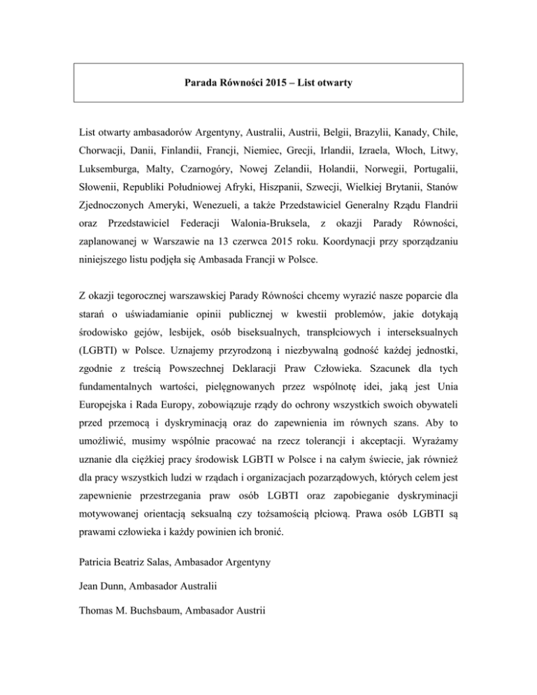 Parada Równości 2015 – List otwarty List otwarty ambasadorów Argentyny, Australii, Austrii, Belgii, Brazylii, Kanady, Chile, Chorwacji, Danii, Finlandii, Francji, Niemiec, Grecji, Irlandii, Izraela, Włoch, Litwy, Luksemburga, Malty, Czarnogóry, Nowej Zelandii, Holandii, Norwegii, Portugalii, Słowenii, Republiki Południowej Afryki, Hiszpanii, Szwecji, Wielkiej Brytanii, Stanów Zjednoczonych Ameryki, Wenezueli, a także Przedstawiciel Generalny Rządu Flandrii oraz Przedstawiciel Federacji Walonia-Bruksela, z okazji Parady Równości, zaplanowanej w Warszawie na 13 czerwca 2015 roku. Koordynacji przy sporządzaniu niniejszego listu podjęła się Ambasada Francji w Polsce. Z okazji tegorocznej warszawskiej Parady Równości chcemy wyrazić nasze poparcie dla starań o uświadamianie opinii publicznej w kwestii problemów, jakie dotykają środowisko gejów, lesbijek, osób biseksualnych, transpłciowych i interseksualnych (LGBTI) w Polsce. Uznajemy przyrodzoną i niezbywalną godność każdej jednostki, zgodnie z treścią Powszechnej Deklaracji Praw Człowieka. Szacunek dla tych fundamentalnych wartości, pielęgnowanych przez wspólnotę idei, jaką jest Unia Europejska i Rada Europy, zobowiązuje rządy do ochrony wszystkich swoich obywateli przed przemocą i dyskryminacją oraz do zapewnienia im równych szans. Aby to umożliwić, musimy wspólnie pracować na rzecz tolerancji i akceptacji. Wyrażamy uznanie dla ciężkiej pracy środowisk LGBTI w Polsce i na całym świecie, jak również dla pracy wszystkich ludzi w rządach i organizacjach pozarządowych, których celem jest zapewnienie przestrzegania praw osób LGBTI oraz zapobieganie dyskryminacji motywowanej orientacją seksualną czy tożsamością płciową. Prawa osób LGBTI są prawami człowieka i każdy powinien ich bronić. Patricia Beatriz Salas, Ambasador Argentyny Jean Dunn, Ambasador Australii Thomas M. Buchsbaum, Ambasador Austrii Colette Taquet, Ambasador Belgii Alfredo Leoni, Ambasador Brazylii Alexandra Bugailiskis, Ambasador Kanady Alfredo García Castelblanco, Ambasador Chile Andrea Bekić, Ambasador Chorwacji Steen Hommel, Ambasador Danii Hanna Lehtinen, Ambasador Finlandii Pierre Buhler, Ambasador Francji Rolf Nikel, Ambasador Niemiec Stavros Spyridakis, chargé d’affaires a.i. Ambasady Grecji Gerard Keown, Ambasador Irlandii Anna Azari, Ambasador Izraela Alessandro De Pedys, Ambasador Włoch Šarūnas Adomavičius, Ambasador Litwy Georges Faber, Ambasador Luksemburga Pierre Clive Agius, Ambasador Malty Ramiz Bašić, Ambasador Czarnogóry Wendy Hinton, Ambasador Nowej Zelandii Paul Bekkers, Ambasador Holandii Karsten Klepsvik, Ambasador Norwegii Maria Amélia Paiva, Ambasador Portugalii Robert Krmelj, Ambasador Słowenii Simon Jabulani Ntombela, Ambasador Republiki Południowej Afryki Agustín Núñez Martinez, Ambasador Hiszpanii Staffan Herrström, Ambasador Szwecji Robin Barnett, Ambasador Wielkiej Brytanii Stephen Mull, Ambasador Stanów Zjednoczonych Ameryki Luis Gomez Urdaneta, Ambasador Wenezueli Yves Wantens, Przedstawiciel Generalny Rządu Flandrii Franck Pezza, Przedstawiciel Federacji Walonia-Bruksela Dodatkowe informacje: Ambasada Francji w Polsce Pierwszy Radca, zastępca szefa misji dyplomatycznej Sylvain Guiaugué, tel. +48 606 306 444