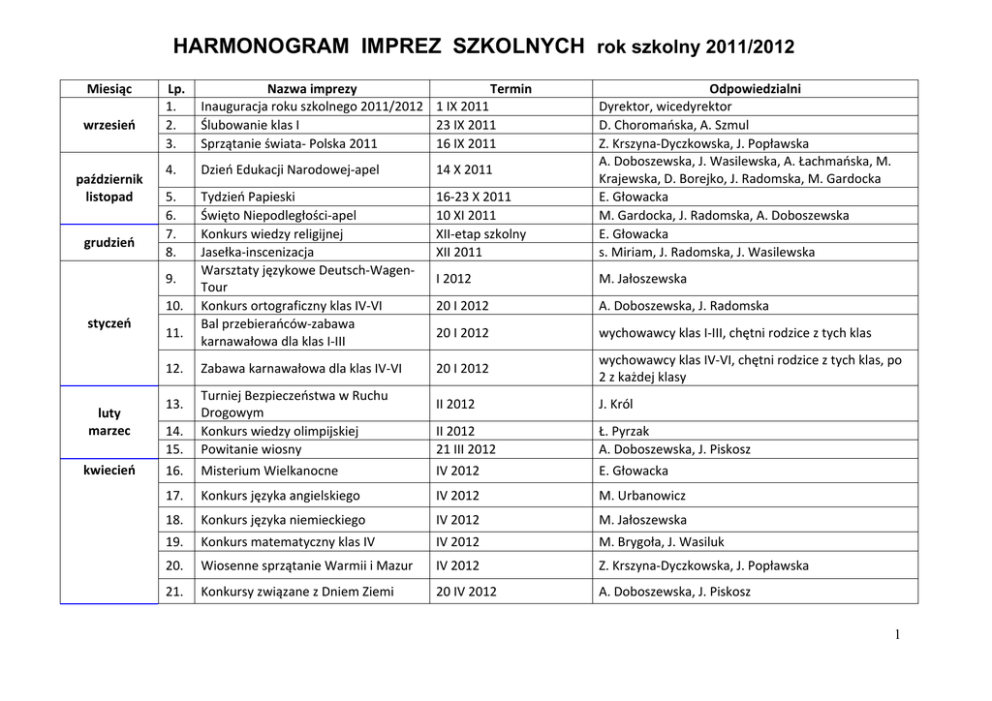 HARMONOGRAM IMPREZ SZKOLNYCH rok szkolny 2011/2012 Miesiąc wrzesień październik listopad grudzień Lp. Nazwa imprezy Termin 1. Inauguracja roku szkolnego 2011/2012 1 IX 2011 2. Ślubowanie klas I 23 IX 2011 3. Sprzątanie świata‐ Polska 2011 16 IX 2011 4. Dzień Edukacji Narodowej‐apel 14 X 2011 5. 6. 7. 8. Tydzień Papieski Święto Niepodległości‐apel Konkurs wiedzy religijnej Jasełka‐inscenizacja Warsztaty językowe Deutsch‐Wagen‐ Tour Konkurs ortograficzny klas IV‐VI Bal przebierańców‐zabawa karnawałowa dla klas I‐III 16‐23 X 2011 10 XI 2011 XII‐etap szkolny XII 2011 Odpowiedzialni Dyrektor, wicedyrektor D. Choromańska, A. Szmul Z. Krszyna‐Dyczkowska, J. Popławska A. Doboszewska, J. Wasilewska, A. Łachmańska, M. Krajewska, D. Borejko, J. Radomska, M. Gardocka E. Głowacka M. Gardocka, J. Radomska, A. Doboszewska E. Głowacka s. Miriam, J. Radomska, J. Wasilewska I 2012 M. Jałoszewska 20 I 2012 A. Doboszewska, J. Radomska 20 I 2012 wychowawcy klas I‐III, chętni rodzice z tych klas Zabawa karnawałowa dla klas IV‐VI 20 I 2012 wychowawcy klas IV‐VI, chętni rodzice z tych klas, po 2 z każdej klasy II 2012 J. Król II 2012 21 III 2012 Ł. Pyrzak A. Doboszewska, J. Piskosz 9. 10. styczeń 11. 12. luty marzec kwiecień 14. 15. Turniej Bezpieczeństwa w Ruchu Drogowym Konkurs wiedzy olimpijskiej Powitanie wiosny 16. Misterium Wielkanocne IV 2012 E. Głowacka 17. Konkurs języka angielskiego IV 2012 M. Urbanowicz 18. Konkurs języka niemieckiego IV 2012 M. Jałoszewska 19. Konkurs matematyczny klas IV IV 2012 M. Brygoła, J. Wasiluk 20. Wiosenne sprzątanie Warmii i Mazur IV 2012 Z. Krszyna‐Dyczkowska, J. Popławska 21. Konkursy związane z Dniem Ziemi 20 IV 2012 A. Doboszewska, J. Piskosz 13. 1 maj czerwiec cały rok 22. Święto Konstytucji 3 Maja 30 IV 2012 M. Gardocka, A. Doboszewska, J. Radomska 23. Konkurs matematyczny klas V V 2012 M. Brygoła, J. Wasiluk 24. Konkurs matematyczny klas III V 2012 B. Michalak, J. Piskosz, K. Bujnowska 25. Konkurs ortograficzny klas III V 2012 B. Michalak, J. Piskosz, K. Bujnowska 26. Konkurs wiedzy o Unii Europejskiej V 2012 H. Kwiatkowska 27. Święto Patrona Szkoły 18 V 2012 J. Radomska, A. Doboszewska, M. Gardocka 28. Festyn szkolny z okazji Dnia Dziecka 1 VI 2012 Dyrektor szkoły,wicedyrektor, nauczyciele wychowania fizycznego, wychowawcy klas 29. Konkurs wiedzy o uzależnieniach VI 2012 H. Kwiatkowska 30. Pożegnanie klas VI – uroczystość VI 2012 W. Jałoszewski, M. Gardocka, A. Płotast, Z. Krszyna‐ Dyczkowska‐ polonez 31. Zakończenie roku szkolnego 29 VI 2012 Dyrektor, wicedyrektor 32. Zbiórka surowców wtórnych J. Piskosz 33. Konkursy przedmiotowe: j. polski, matematyka, przyroda, historia cały rok według wykazu W‐M Kuratorium Oświaty w Olsztynie 34. Zawody sportowe 35. Konkursy i imprezy biblioteczne 36. Konkursy plastyczne 37. Konkursy ekologiczne J. Radomska, A. Doboszewska, J. Wasiluk, Z. Krszyna‐ Dyczkowska, M. Gardocka W. Jałoszewski, Ł. Pyrzak według odrębnych harmonogramów M. Dziudzik‐Pływaczewska M. Dziudzik‐Pływaczewska, nauczyciele klas I‐III J. Piskosz Na podstawie informacji zebranych od nauczycieli harmonogram opracowała: Krystyna Bujnowska 2