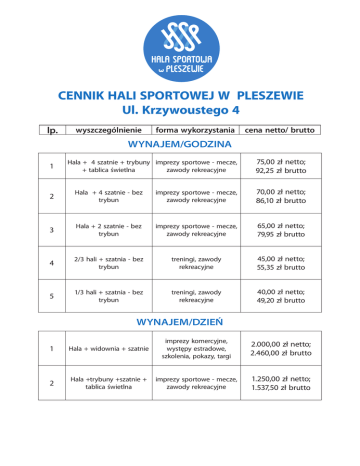 CENNIK HALI SPORTOWEJ W PLESZEWIE Ul. Krzywoustego 4 lp. wyszczególnienie forma wykorzystania cena netto/ brutto WYNAJEM/GODZINA 1 Hala + 4 szatnie + trybuny imprezy sportowe - mecze, + tablica świetlna zawody rekreacyjne 75,00 zł netto; 92,25 zł brutto 2 Hala + 4 szatnie - bez trybun imprezy sportowe - mecze, zawody rekreacyjne 70,00 zł netto; 86,10 zł brutto 3 Hala + 2 szatnie - bez trybun imprezy sportowe - mecze, zawody rekreacyjne 65,00 zł netto; 79,95 zł brutto 4 2/3 hali + szatnia - bez trybun treningi, zawody rekreacyjne 45,00 zł netto; 55,35 zł brutto 5 1/3 hali + szatnia - bez trybun treningi, zawody rekreacyjne 40,00 zł netto; 49,20 zł brutto WYNAJEM/DZIEŃ 1 Hala + widownia + szatnie imprezy komercyjne, występy estradowe, szkolenia, pokazy, targi 2 Hala +trybuny +szatnie + tablica świetlna imprezy sportowe - mecze, zawody rekreacyjne 2.000,00 zł netto; 2.460,00 zł brutto 1.250,00 zł netto; 1.537,50 zł brutto