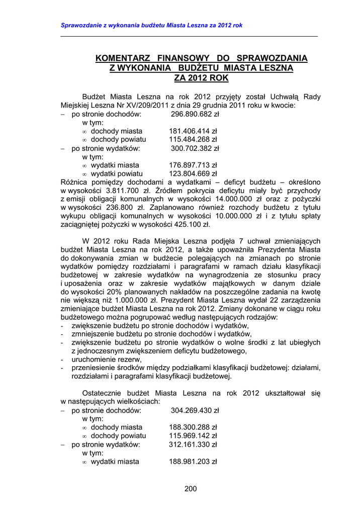 Sprawozdanie z wykonania budżetu Miasta Leszna za 2012 rok _______________________________________________________________ KOMENTARZ FINANSOWY DO SPRAWOZDANIA Z WYKONANIA BUDŻETU MIASTA LESZNA ZA 2012 ROK Budżet Miasta Leszna na rok 2012 przyjęty został Uchwałą Rady Miejskiej Leszna Nr XV/209/2011 z dnia 29 grudnia 2011 roku w kwocie: − po stronie dochodów: 296.890.682 zł w tym: • dochody miasta 181.406.414 zł • dochody powiatu 115.484.268 zł − po stronie wydatków: 300.702.382 zł w tym: • wydatki miasta 176.897.713 zł • wydatki powiatu 123.804.669 zł Różnica pomiędzy dochodami a wydatkami – deficyt budżetu – określono w wysokości 3.811.700 zł. Źródłem pokrycia deficytu miały być przychody z emisji obligacji komunalnych w wysokości 14.000.000 zł oraz z pożyczki w wysokości 236.800 zł. Zaplanowano również rozchody budżetu z tytułu wykupu obligacji komunalnych w wysokości 10.000.000 zł i z tytułu spłaty zaciągniętej pożyczki w wysokości 425.100 zł. W 2012 roku Rada Miejska Leszna podjęła 7 uchwał zmieniających budżet Miasta Leszna na rok 2012, a także upoważniła Prezydenta Miasta do dokonywania zmian w budżecie polegających na zmianach po stronie wydatków pomiędzy rozdziałami i paragrafami w ramach działu klasyfikacji budżetowej w zakresie wydatków na wynagrodzenia ze stosunku pracy i uposażenia oraz w zakresie wydatków majątkowych w danym dziale do wysokości 20% planowanych nakładów na poszczególne zadania na kwotę nie większą niż 1.000.000 zł. Prezydent Miasta Leszna wydał 22 zarządzenia zmieniające budżet Miasta Leszna na rok 2012. Zmiany dokonane w ciągu roku budżetowego można pogrupować według następujących rodzajów: - zwiększenie budżetu po stronie dochodów i wydatków, - zmniejszenie budżetu po stronie dochodów i wydatków, - zwiększenie budżetu po stronie wydatków o wolne środki z lat ubiegłych z jednoczesnym zwiększeniem deficytu budżetowego, - uruchomienie rezerw, - przeniesienie środków między podziałkami klasyfikacji budżetowej: działami, rozdziałami i paragrafami klasyfikacji budżetowej. Ostatecznie budżet Miasta Leszna na rok 2012 ukształtował się w następujących wielkościach: − po stronie dochodów: 304.269.430 zł w tym: • dochody miasta 188.300.288 zł • dochody powiatu 115.969.142 zł − po stronie wydatków: 312.161.330 zł w tym: • wydatki miasta 188.981.203 zł 200 Sprawozdanie z wykonania budżetu Miasta Leszna za 2012 rok _______________________________________________________________ • wydatki powiatu 123.180.127 zł Planowany deficyt budżetu wyniósł 7.891.900 zł, który zamierzono pokryć przychodami: z emisji obligacji komunalnych w kwocie 14.000.000 zł, z zaciągniętej pożyczki w kwocie 217.000 zł i z kredytu na wyprzedzające finansowanie działań finansowanych ze środków pochodzących z budżetu Unii Europejskiej w wysokości 1.800.000 zł. Po stronie przychodów zaplanowano również wolne środki jako nadwyżka środków pieniężnych na rachunku bieżącym budżetu wynikającą z rozliczeń wyemitowanych papierów wartościowych, kredytów i pożyczek z lat ubiegłych w kwocie 6.300.000 zł. Kwota planowanych rozchodów ogółem wyniosła 14.425.100 zł, z tego: z tytułu wykupu obligacji komunalnych wynosiła 14.000.000 zł oraz z tytułu spłaty pożyczki w kwocie 425.100 zł. W dniu 20 grudnia 2012 roku Rada Miejska Leszna Uchwałą Nr XXII/359/2012 ustaliła wykaz wydatków niewygasających z końcem roku budżetowego 2012 oraz określiła ostateczny termin dokonania tych wydatków. Wydatki niewygasające określono w wysokości 7.530.709 zł, z tego: wydatki majątkowe w kwocie 5.822.843 zł i wydatki bieżące w kwocie 1.707.866 zł. W 2012 roku zrealizowano budżet Miasta w następujących wielkościach: − po stronie dochodów: 299.947.076,85 zł w tym: • dochody miasta 185.522.368,12 zł • dochody powiatu 114.424.708,73 zł − po stronie wydatków: 299.614.889,65 zł w tym: • wydatki miasta 178.764.666,12 zł • wydatki powiatu 120.850.223,53 zł Rok budżetowy zakończył się nadwyżką budżetową w wysokości 332.187,20 zł. W 2012 wyemitowano obligacje komunalne w kwocie 14.000.000 zł, zaciągnięto pożyczkę w kwocie 217.000 zł, zaciągnięto kredyt na wyprzedzające finansowanie w kwocie 1.798.227,59 zł. Finansowaniu budżetu służyły również „wolne środki z roku 2011” w kwocie 6.336.929,33 zł. W 2012 roku dokonano wykupu wcześniej wyemitowanych obligacji komunalnych w kwocie 14.000.000 zł oraz spłacono pożyczki z Wojewódzkiego Funduszu Ochrony Środowiska i Gospodarki Wodnej w kwocie 425.100 zł. Rozliczenie budżetu ogółem w 2012 roku z uwzględnieniem przychodów i rozchodów budżetu przedstawia się następująco: 1. zrealizowane dochody + pozostałe wpływy: • emisja obligacji komunalnych • zaciągnięcie pożyczki • kredyt na wyprzedzające finansowanie • wolne środki z 2011 roku • dodatnie różnice kursowe • umorzenie pożyczki 201 299.947.076,85 zł 14.000.000,00 zł 217.000,00 zł 1.798.227,59 zł 6.336.929,33 zł 765,47 zł 137.020,00 zł Sprawozdanie z wykonania budżetu Miasta Leszna za 2012 rok _______________________________________________________________ razem wpływy 322.437.019,24 zł 2. zrealizowane wydatki łącznie z wydatkami niewygasającymi + pozostałe rozchody: • wykup obligacji komunalnych • spłata pożyczki razem rozchody 3. wolne środki za 2012 rok 299.614.889,65 zł 14.000.000,00 zł 425.100,00 zł 314.039.989,65 zł 8.397.029,59 zł Wolne środki wykazane w powyższym rozliczeniu powstały jako nadwyżka środków pieniężnych na rachunku bieżącym budżetu Miasta Leszna wynikająca z rozliczeń wyemitowanych papierów wartościowych, kredytów i pożyczek z lat ubiegłych. Rozdysponowanie kwoty wolnych środków za 2012 rok Prezydent Miasta zaproponuje po przyjęciu sprawozdania z wykonania budżetu przez Radę M