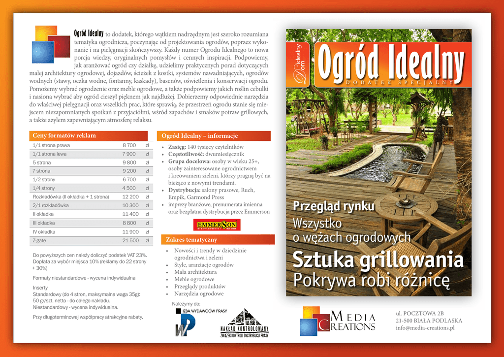 tematyka ogrodnicza, poczynając od projektowania ogrodów, poprzez wykonanie i na pielęgnacji skończywszy. Każdy numer Ogrodu Idealnego to nowa porcja wiedzy, oryginalnych pomysłów i cennych inspiracji. Podpowiemy, jak aranżować ogród czy działkę, udzielimy praktycznych porad dotyczących małej architektury ogrodowej, dojazdów, ścieżek z kostki, systemów nawadniających, ogrodów wodnych (stawy, oczka wodne, fontanny, kaskady), basenów, oświetlenia i konserwacji ogrodu. Pomożemy wybrać ogrodzenie oraz meble ogrodowe, a także podpowiemy jakich roślin cebulki i nasiona wybrać aby ogród cieszył pięknem jak najdłużej. Dobierzemy odpowiednie narzędzia do właściwej pielęgnacji oraz wszelkich prac, które sprawią, że przestrzeń ogrodu stanie się miejscem niezapomnianych spotkań z przyjaciółmi, wśród zapachów i smaków potraw grillowych, a także azylem zapewniającym atmosferę relaksu. Ceny formatów reklam D omidealny Ogród Idealny to dodatek, którego wątkiem nadrzędnym jest szeroko rozumiana Ogród Idealny D o D a t e k s p e c j a l n y Ogród Idealny – informacje 1/1 strona prawa 8 700 zł 1/1 strona lewa 7 900 zł 5 strona 9 800 zł 7 strona 9 200 zł 1/2 strony 6 700 zł 1/4 strony 4 500 zł Rozkładówka (II okładka + 1 strona) 12 200 zł 2/1 rozkładówka 10 300 zł II okładka 11 400 zł III okładka 8 800 zł IV okładka 11 900 zł Z-gate 21 500 zł Do powyższych cen należy doliczyć podatek VAT 23%. Dopłata za wybór miejsca 10% (reklamy do 22 strony + 30%) Formaty niestandardowe - wycena indywidualna Inserty Standardowy (do 4 stron, maksymalna waga 35g): 50 gr/szt. netto - do całego nakładu. Niestandardowy - wycena indywidualna. Przy długoterminowej współpracy atrakcyjne rabaty. • Zasięg: 140 tysięcy czytelników • Częstotliwość: dwumiesięcznik • Grupa docelowa: osoby w wieku 25+, osoby zainteresowane ogrodnictwem i kreowaniem zieleni, którzy pragną być na bieżąco z nowymi trendami. • Dystrybucja: salony prasowe, Ruch, Empik, Garmond Press • imprezy branżowe, prenumerata imienna oraz bezpłatna dystrybucja przez Emmerson Zakres tematyczny • Nowości i trendy w dziedzinie ogrodnictwa i zeleni • Style, aranżacje ogrodów • Mała architektura • Meble ogrodowe • Przeglądy produktów • Narzędzia ogrodowe Przegląd rynku Wszystko o wężach ogrodowych Sztuka grillowania Pokrywa robi różnicę Należymy do: IZBA WYDAWCÓW PRASY m edia c reations ul. POCZTOWA 2B 21-500 BIAŁA PODLASKA [email protected]