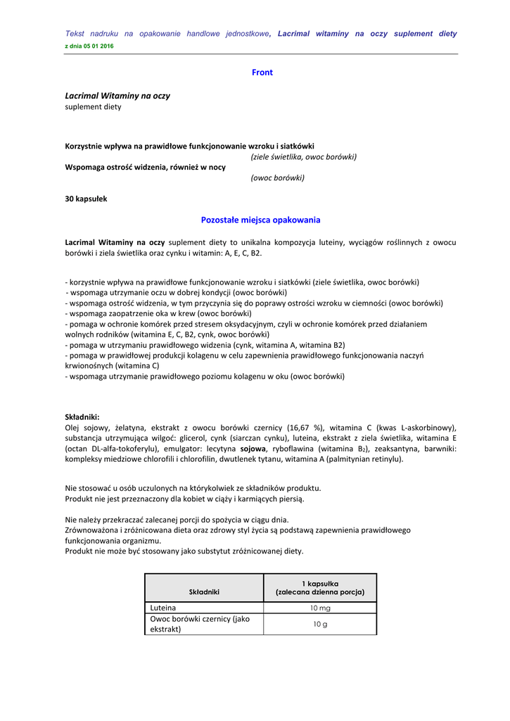 Tekst nadruku na opakowanie handlowe jednostkowe, Lacrimal witaminy na oczy suplement diety z dnia 05 01 2016 Front Lacrimal Witaminy na oczy suplement diety Korzystnie wpływa na prawidłowe funkcjonowanie wzroku i siatkówki (ziele świetlika, owoc borówki) Wspomaga ostrość widzenia, również w nocy (owoc borówki) 30 kapsułek Pozostałe miejsca opakowania Lacrimal Witaminy na oczy suplement diety to unikalna kompozycja luteiny, wyciągów roślinnych z owocu borówki i ziela świetlika oraz cynku i witamin: A, E, C, B2. - korzystnie wpływa na prawidłowe funkcjonowanie wzroku i siatkówki (ziele świetlika, owoc borówki) - wspomaga utrzymanie oczu w dobrej kondycji (owoc borówki) - wspomaga ostrość widzenia, w tym przyczynia się do poprawy ostrości wzroku w ciemności (owoc borówki) - wspomaga zaopatrzenie oka w krew (owoc borówki) - pomaga w ochronie komórek przed stresem oksydacyjnym, czyli w ochronie komórek przed działaniem wolnych rodników (witamina E, C, B2, cynk, owoc borówki) - pomaga w utrzymaniu prawidłowego widzenia (cynk, witamina A, witamina B2) - pomaga w prawidłowej produkcji kolagenu w celu zapewnienia prawidłowego funkcjonowania naczyń krwionośnych (witamina C) - wspomaga utrzymanie prawidłowego poziomu kolagenu w oku (owoc borówki) Składniki: Olej sojowy, żelatyna, ekstrakt z owocu borówki czernicy (16,67 %), witamina C (kwas L-askorbinowy), substancja utrzymująca wilgoć: glicerol, cynk (siarczan cynku), luteina, ekstrakt z ziela świetlika, witamina E (octan DL-alfa-tokoferylu), emulgator: lecytyna sojowa, ryboflawina (witamina B2), zeaksantyna, barwniki: kompleksy miedziowe chlorofili i chlorofilin, dwutlenek tytanu, witamina A (palmitynian retinylu). Nie stosować u osób uczulonych na którykolwiek ze składników produktu. Produkt nie jest przeznaczony dla kobiet w ciąży i karmiących piersią. Nie należy przekraczać zalecanej porcji do spożycia w ciągu dnia. Zrównoważona i zróżnicowana dieta oraz zdrowy styl życia są podstawą zapewnienia prawidłowego funkcjonowania organizmu. Produkt nie może być stosowany jako substytut zróżnicowanej diety. Składniki Luteina Owoc borówki czernicy (jako ekstrakt) 1 kapsułka (zalecana dzienna porcja) 10 mg 10 g Tekst nadruku na opakowanie handlowe jednostkowe, Lacrimal witaminy na oczy suplement diety z dnia 05 01 2016 Ziele świetlika (jako ekstrakt) Zeaksantyna Witamina E Witamina C Cynk Witamina B2 Witamina A 100 mg 500 µg 10 mg (83% RWS*) 60 mg (75% RWS*) 15 mg (150% RWS*) 1,6 mg (114% RWS*) 400 µg (50% RWS*) *RWS – referencyjna wartość spożycia Zalecane spożycie: 1 kapsułka dziennie. Korzystny efekt wynikający z deklarowanego działania występuje w przypadku spożycia 1 kapsułki dziennie. Najlepiej spożyć przed końcem: data podana poniżej: Przechowywanie: Przechowywać w temperaturze od 15 ͦC do 25 ͦC. Chronić od światła i wilgoci. Przechowywać w sposób niedostępny dla małych dzieci. Nr partii: …………….. Najlepiej spożyć przed końcem: …………… Zawartość netto: 18 g (30 kapsułek po 0,6 g) Producent: [logo MEDANA PHARMA] MEDANA PHARMA S.A. Ul. Władysława Łokietka 10 98-200 Sieradz Kod kreskowy: ...........