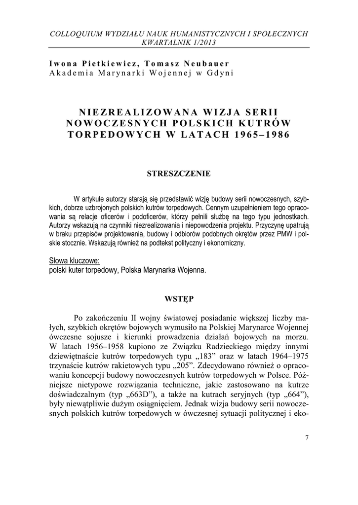 COLLOQUIUM WYDZIAŁU NAUK HUMANISTYCZNYCH I SPOŁECZNYCH KWARTALNIK 1/2013 Iwona Pietkiewicz, Tomasz Neubauer Akademia Marynarki Wojennej w Gdyni NIEZREALIZOWANA WIZJA SERII NOWOCZESNYCH POLSKICH KUTRÓW TORPEDOWYCH W LATACH 1965–1986 STRESZCZENIE W artykule autorzy starają się przedstawić wizję budowy serii nowoczesnych, szybkich, dobrze uzbrojonych polskich kutrów torpedowych. Cennym uzupełnieniem tego opracowania są relacje oficerów i podoficerów, którzy pełnili służbę na tego typu jednostkach. Autorzy wskazują na czynniki niezrealizowania i niepowodzenia projektu. Przyczynę upatrują w braku przepisów projektowania, budowy i odbiorów podobnych okrętów przez PMW i polskie stocznie. Wskazują również na podtekst polityczny i ekonomiczny. Słowa kluczowe: polski kuter torpedowy, Polska Marynarka Wojenna. WSTĘP Po zakończeniu II wojny światowej posiadanie większej liczby małych, szybkich okrętów bojowych wymusiło na Polskiej Marynarce Wojennej ówczesne sojusze i kierunki prowadzenia działań bojowych na morzu. W latach 1956–1958 kupiono ze Związku Radzieckiego między innymi dziewiętnaście kutrów torpedowych typu „183” oraz w latach 1964–1975 trzynaście kutrów rakietowych typu „205”. Zdecydowano również o opracowaniu koncepcji budowy nowoczesnych kutrów torpedowych w Polsce. Późniejsze nietypowe rozwiązania techniczne, jakie zastosowano na kutrze doświadczalnym (typ „663D”), a także na kutrach seryjnych (typ „664”), były niewątpliwie dużym osiągnięciem. Jednak wizja budowy serii nowoczesnych polskich kutrów torpedowych w ówczesnej sytuacji politycznej i eko7 Iwona Pietkiewicz, Tomasz Neubauer nomicznej, niepoparta wcześniejszym doświadczeniem w budowaniu tego typu jednostek oraz późniejsze długie i mozolne próby kolejno wcielanych seryjnych kutrów były początkiem wielu problemów i zmagań polskich specjalistów oraz marynarzy w utrzymaniu tych jednostek w należytym stanie technicznym i bojowym. Ostatecznie Stocznia Północna w Gdańsku wybudowała dla Polskiej Marynarki Wojennej niewielką liczbę (osiem sztuk) kutrów torpedowych i na tym zakończyła się wizja budowy nowych, lekkich, dobrze uzbrojonych jednostek tej klasy. W czerwcu 1957 roku ówczesny dowódca Marynarki Wojennej kontradmirał Zdzisław Studziński jako pierwszy podał oficjalną informację o planach i zamierzeniach budowy polskiego kutra torpedowego. Po tym fakcie zespół konstruktorów Centralnego Biura Konstrukcji Okrętowych 2 w Gdańsku przystąpił do pracy nad nową jednostką. Koncepcja przewidywała okręt bojowy wykonany ze stopów aluminium o dwóch rodzajach napędu. Napęd marszowy — silniki wysokoprężne, napęd szczytowy — turbina gazowa. Formalne prace nad polskim kutrem rozpoczęły się w 1958 roku. Zanim powstał finalny projekt kutra, rozpatrywano wiele różnych rozwiązań. W początkowym okresie opracowano cztery projekty oznaczone numerami: „653”, „655”, „657”, „660”. Wszystkie umieszczono na bardzo podobnym kadłubie z cechami półślizgacza, co miało ułatwić pływanie przy dużych prędkościach. Kadłuby przewidziano wykonać z blach stopu aluminium łączonych nitami i spawami. Wariant „657” utrzymał zaprojektowaną wcześniej niską wyporność i uzbrojenie (dwie wyrzutnie torpedowe). Kolejne trzy były znacznie większe i lepiej uzbrojone. Jednak żaden z projektów nie spełniał wymogu prędkości maksymalnej (miała wynosić około 55 węzłów) oraz niezatapialności przy jednoczesnym zalaniu dwóch przedziałów. Dlatego też, na polecenie Dowództwa Marynarki Wojennej, przygotowano dwa nowe opracowania kutra torpedowego (projekt „662” i „663”), różniące się jedynie rodzajami napędu. Na pierwszym z projektów „662” optowano za użyciem NRD-owskich silników 20KVD25, natomiast na „663” — za widlastymi silnikami wysokoprężnymi M-50. Ostatecznie zdecydowano się na projekt „663” z silnikami M-501. Projekt wstępny był krytykowany przez wszystkich specjalistów. Wytknięto brak urządzeń demagnetyzacyjnych, brak łączności wewnętrznej i skrytykowano zbyt małe zbiorniki wody oraz paliwa. Zwrócono również 1 N. Klatka, Fenomen CBKO-2, „Przegląd Morski”, 2000, nr 7-8, s. 37; R. Rochowicz, Polskie kutry torpedowe od idei do prototypu, „Morze, Statki i Okręty”, 2006, nr 1, s. 36-38. 8 COLLOQUIUM WNHiS Niezrealizowana wizja serii nowoczesnych polskich kutrów torpedowych w latach 1965–1986 uwagę na brak torów minowych (nawet kosztem rezygnacji z rufowego stanowiska artyleryjskiego) oraz na złe ustawienie wyrzutni torpedowych (wyloty wystawały poza obrys kadłuba). Pomimo tych i wielu innych uwag prace przy projekcie „663” cały czas kontynuowano. Numer projektu już się nie zmienił, dodano kryptonim „Sroka”. Napęd kutra stanowiły cztery silniki wysokoprężne M50F3 radzieckiej produkcji o mocy maksymalnej 1200 KM każdy pracujące po dwa (poprzez przekładnie) na jeden wał oraz jedna turbina gazowa rodzimej produkcji o mocy maksymalnej 7200 KM pracująca poprzez przekładnie na dwie śruby. W listopadzie 1965 roku podniesiono biało-czerwoną banderę na pierwszym zbudowanym przez polską stocznię kutrze torpedowym oznaczonym ostatecznie jako projekt „663D”. Tak wspomina i ocenia całą sytuację kmdr por. Zbigniew Gęzikiewicz (m.in. oficer mechanik na kutrze typu „663D” i „664”): „W założeniu budowy polskich kutrów było również to, iż do napędu podstawowego miały być dwa silniki i podobno do tego nadawały się silniki Rolls Royce’a. Kiedy strona polska wystąpiła o te silniki do producenta, angielscy przedstawiciele wypytywali, po co nam te silniki. Po wyjaśnieniu, choć nie do końca, faktycznych powodów ich pozyskania, odmówili dostaw, jednocześnie domyślając się, że powody są zupełnie inne niż te przedstawiane. To między innymi spowodowało, że siłownia została wy