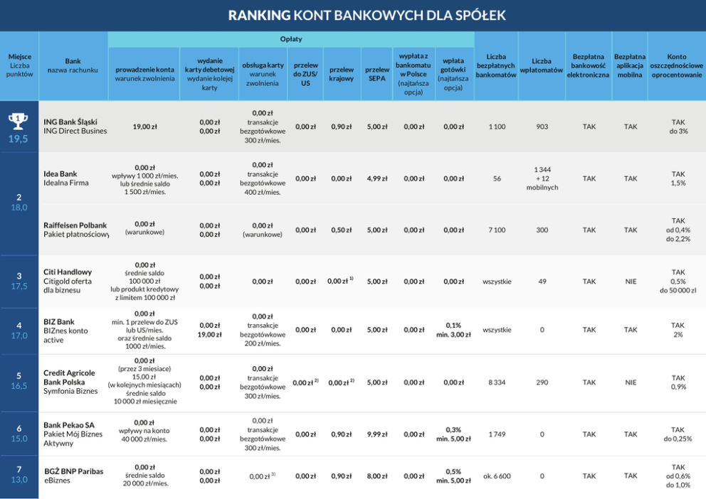RANKING KONT BANKOWYCH DLA SPÓŁEK Opłaty Miejsce Liczba punktów wypłata z bankomatu przelew w Polsce SEPA (najtańsza opcja) Liczba Bezpłatna Bezpłatna Konto Liczba bezpłatnych bankowość aplikacja oszczędnościowe wpłatomatów bankomatów elektroniczna mobilna oprocentowanie prowadzenie konta warunek zwolnienia wydanie karty debetowej wydanie kolejej karty obsługa karty warunek zwolnienia przelew do ZUS/ US przelew krajowy 19,00 zł 0,00 zł 0,00 zł 0,00 zł transakcje bezgotówkowe 300 zł/mies. 0,00 zł 0,90 zł 5,00 zł 0,00 zł 0,00 zł 1 100 903 TAK TAK TAK do 3% 0,00 zł wpływy 1 000 zł/mies. lub średnie saldo 1 500 zł/mies. 0,00 zł 0,00 zł 0,00 zł transakcje bezgotówkowe 400 zł/mies. 0,00 zł 0,00 zł 4,99 zł 0,00 zł 0,00 zł 56 1 344 + 12 mobilnych TAK TAK TAK 1,5% 0,00 zł (warunkowe) 0,00 zł 0,00 zł 0,00 zł (warunkowe) 0,00 zł 0,50 zł 5,00 zł 0,00 zł 0,00 zł 7 100 300 TAK TAK TAK od 0,4% do 2,2% 3 17,5 Citi Handlowy Citigold oferta dla biznesu 0,00 zł średnie saldo 100 000 zł lub produkt kredytowy z limitem 100 000 zł 0,00 zł 0,00 zł 0,00 zł 0,00 zł 5,00 zł 0,00 zł 0,00 zł wszystkie 49 TAK NIE TAK 0,5% do 50 000 zl 4 17,0 BIZ Bank BIZnes konto active 0,00 zł min. 1 przelew do ZUS lub US/mies. oraz średnie saldo 1000 zł/mies. 0,00 zł 19,00 zł 0,00 zł transakcje bezgotówkowe 200 zł/mies. 0,00 zł 0,00 zł 5,00 zł 0,00 zł 0,1% min. 3,00 zł wszystkie 0 TAK TAK TAK 2% 0,00 zł (przez 3 miesiace) 15,00 zł (w kolejnych miesiącach) średnie saldo 10 000 zł miesięcznie 0,00 zł 0,00 zł 0,00 zł transakcje bezgotówkowe 300 zł/mies. 0,00 zł 2) 0,00 zł 2) 5,00 zł 0,00 zł 0,00 zł 8 334 290 TAK NIE TAK 0,9% 0,00 zł transakcje bezgotówkowe 300 zł/mies. 0,00 zł 0,90 zł 9,99 zł 0,00 zł 0,3% min. 5,00 zł 1 749 0 TAK TAK TAK do 0,25% 0,00 zł 0,90 zł 8,00 zł 0,00 zł 0,5% min. 5,00 zł ok. 6 600 0 TAK TAK TAK od 0,6% do 1,0% 1 19,5 Bank nazwa rachunku ING Bank Śląski ING Direct Business Idea Bank Idealna Firma 2 18,0 Raiffeisen Polbank Pakiet płatnościowy 5 16,5 Credit Agricole Bank Polska Symfonia Biznes 6 15,0 Bank Pekao SA Pakiet Mój Biznes Aktywny 0,00 zł wpływy na konto 40 000 zł/mies. 0,00 zł 0,00 zł 7 13,0 BGŻ BNP Paribas eBiznes 0,00 zł średnie saldo 20 000 zł/mies. 0,00 zł 0,00 zł 0,00 zł 3) 0,00 zł 1) wpłata gotówki (najtańsza opcja) RANKING KONT BANKOWYCH DLA SPÓŁEK 8 11,5 BOŚ Bank Konto Wyjątkowe Biznes 59,00 zł + 40,00 zł dla Aktywnych za dodatkowe moduły z Modułem FX (FX i Rozliczeniowy) i Modułem Rozliczeniowym 0,00 zł średnie saldo 25 000 zł/mies. 0,00 zł 0,00 zł 0,00 zł (w pierwszym roku) 30,00 zł (w kolejnych latach) 0,00 zł 0,00 zł 4) 5,00 zł 0,00 zł 0,2% min. 5,00 zł wszystkie 0 TAK NIE TAK 0,9% 0,00 zł 0,00 zł 3,50 zł 0,00 zł 0,00 zł 5) 0,00 zł 6) 1,50 zł 0,3% min. 4,50 zł 0 0 TAK NIE TAK 0,75% 5,00 zł 0,00 zł 0,00 zł 8) 5,00 zł 0,00 zł 0,25% min. 3,00 zł 190 0 TAK NIE NIE 10) 10,00 zł 1,00 zł 0,2% min. 10,00 zł 0 0 TAK TAK TAK 0,55% brak 5,00 zł 1,00% 0 0 TAK NIE NIE 9 9,0 Deutsche Bank db M 10 7,0 Alior Bank Biznes Komfort 45 50,00 zł 11 4,5 Bank BPH Rachunek Symetria 25,00 zł 0,00 zł 0,00 zł 9) 4,00 zł 12 4,0 Toyota Bank Polska Rachunek bieżący 15,00 zł 40,00 zł 40,00 zł 40,00 zł rocznie 0,00 zł 0,00 zł 7) 1,75 zł 10) 1,75 zł 0,00 zł 11) 0,00 zł 11) Wszystkie parametry rachunków podane dla klienta wg założeń: – spółka z o.o. o rocznych przychodach w wysokości ok. 12 mln zł, – średniomiesięczne wpływy na konto to 1 mln zł, zaś średniomiesięczne saldo to 150 tys. zł – wykonuje ok. 40 krajowych przelewów zewnętrznych w miesiącu + przelewy do ZUS i US, 1) 2) 3) 4) 5) 6) – wykonuje 3 przelewy europejskie w miesiącu na ok. 2 500 euro każdy, – potrzebuje 2 kart debetowych do konta, – wypłaca z bankomatów (ok. 1 000 zł miesięcznie każdą z kart), korzystając z najtańszej opcji, – dokonuje licznych transakcji bezgotówkowych na kwotę rzędu 5 000 złotych miesięcznie każdą kartą, – wpłaca gotówkę na konto (średnio 50 000 zł miesięcznie), korzystając z najtańszej opcji, – chce lokować nadwyżki (saldo) na atrakcyjnie oprocentowanym koncie oszczędnościowym, – zainteresowana korzystaniem z bankowości internetowej i mobilnej. 7) 8) 9) 10) 11) 40 darmowych przelewów w miesiącu, 1,50 zł za każdy kolejny 100 darmowych przelewów w miesiącu, w tym do ZUS/US 1,00 zł każdy kolejny 5 zł za drugą kartę 5 darmowych przelewów w miesiącu, 1,20 zł za każdy kolejny 60 darmowcyh przelewów w miesiącu, 1,00 zł za każdy kolejny można wykupić paczkę operacji europejskich, które obniżą koszt przelewu (koszt 10,00 zł/mies.) klient może zostać zwolniony z opłaty za paczkę operacji, jeżeli utrzyma średnie saldo miesięczne na produktach depozytowych na poziomie wyższym o 10 000 zł – łącznie 35 000 zł za wydanie do 3 kart 40 darmowych przelewów w miesiącu, 2,00 zł za każdy kolejny bezpłatne wydanie 2 kart do konta gdy klient wykonuje od 25 do 50 przelewów w miesiącu 1000 darmowych przelewów w miesiącu, 1,00 zł każdy kolejny