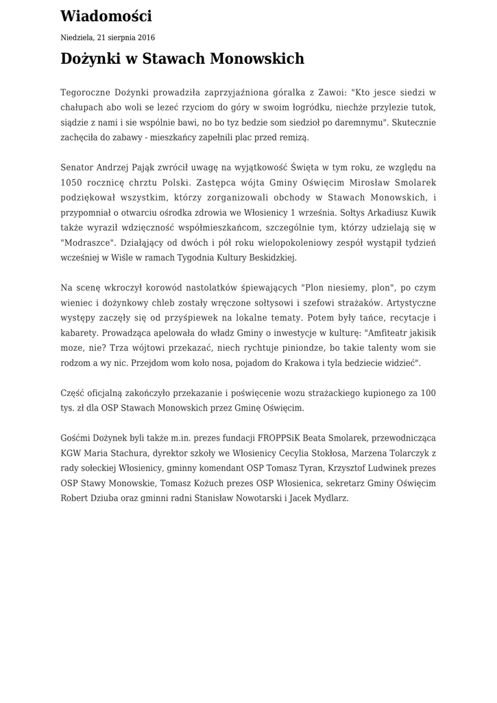Wiadomości Niedziela, 21 sierpnia 2016 Dożynki w Stawach Monowskich Tegoroczne Dożynki prowadziła zaprzyjaźniona góralka z Zawoi: "Kto jesce siedzi w chałupach abo woli se lezeć rzyciom do góry w swoim łogródku, niechże przylezie tutok, siądzie z nami i sie wspólnie bawi, no bo tyz bedzie som siedzioł po daremnymu". Skutecznie zachęciła do zabawy - mieszkańcy zapełnili plac przed remizą. Senator Andrzej Pająk zwrócił uwagę na wyjątkowość Święta w tym roku, ze względu na 1050 rocznicę chrztu Polski. Zastępca wójta Gminy Oświęcim Mirosław Smolarek podziękował wszystkim, którzy zorganizowali obchody w Stawach Monowskich, i przypomniał o otwarciu ośrodka zdrowia we Włosienicy 1 września. Sołtys Arkadiusz Kuwik także wyraził wdzięczność współmieszkańcom, szczególnie tym, którzy udzielają się w "Modraszce". Działąjący od dwóch i pół roku wielopokoleniowy zespół wystąpił tydzień wcześniej w Wiśle w ramach Tygodnia Kultury Beskidzkiej. Na scenę wkroczył korowód nastolatków śpiewających "Plon niesiemy, plon", po czym wieniec i dożynkowy chleb zostały wręczone sołtysowi i szefowi strażaków. Artystyczne występy zaczęły się od przyśpiewek na lokalne tematy. Potem były tańce, recytacje i kabarety. Prowadząca apelowała do władz Gminy o inwestycje w kulturę: "Amfiteatr jakisik moze, nie? Trza wójtowi przekazać, niech rychtuje piniondze, bo takie talenty wom sie rodzom a wy nic. Przejdom wom koło nosa, pojadom do Krakowa i tyla bedziecie widzieć". Część oficjalną zakończyło przekazanie i poświęcenie wozu strażackiego kupionego za 100 tys. zł dla OSP Stawach Monowskich przez Gminę Oświęcim. Gośćmi Dożynek byli także m.in. prezes fundacji FROPPSiK Beata Smolarek, przewodnicząca KGW Maria Stachura, dyrektor szkoły we Włosienicy Cecylia Stokłosa, Marzena Tolarczyk z rady sołeckiej Włosienicy, gminny komendant OSP Tomasz Tyran, Krzysztof Ludwinek prezes OSP Stawy Monowskie, Tomasz Kożuch prezes OSP Włosienica, sekretarz Gminy Oświęcim Robert Dziuba oraz gminni radni Stanisław Nowotarski i Jacek Mydlarz.