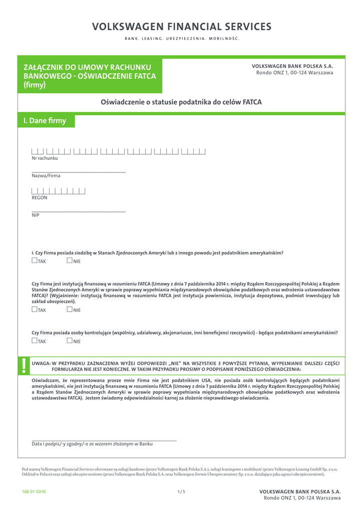 Załącznik do umowy rachunku bankowego - oświadczenie FATCA (firmy) VOLKSWAGEN BANK POLSKA S.A. Rondo ONZ 1, 00-124 Warszawa Oświadczenie o statusie podatnika do celów FATCA I. Dane firmy Nr rachunku ___________________________________ Nazwa/Firma REGON ___________________________________ NIP I. Czy Firma posiada siedzibę w Stanach Zjednoczonych Ameryki lub z innego powodu jest podatnikiem amerykańskim? TAK NIE Czy Firma jest instytucją finansową w rozumieniu FATCA (Umowy z dnia 7 października 2014 r. między Rządem Rzeczypospolitej Polskiej a Rządem Stanów Zjednoczonych Ameryki w sprawie poprawy wypełniania międzynarodowych obowiązków podatkowych oraz wdrożenia ustawodawstwa FATCA)? (Wyjaśnienie: instytucją finansową w rozumieniu FATCA jest instytucja powiernicza, instytucja depozytowa, podmiot inwestujący lub zakład ubezpieczeń). TAK NIE Czy Firma posiada osoby kontrolujące (wspólnicy, udziałowcy, akcjonariusze, inni beneficjenci rzeczywiści) - będące podatnikami amerykańskimi? TAK NIE UWAGA: W przypadku zaznaczenia wyżej odpowiedzi „NIE” na wszystkie 3 powyższe pytania, wypełnianie dalszej części formularza nie jest konieczne. W takim przypadku prosimy o podpisanie poniższego oświadczenia: świadczam, że reprezentowana przeze mnie Firma nie jest podatnikiem USA, nie posiada osób kontrolujących będących podatnikami O amerykańskimi, nie jest instytucją finansową w rozumieniu FATCA (Umowy z dnia 7 października 2014 r. między Rządem Rzeczypospolitej Polskiej a Rządem Stanów Zjednoczonych Ameryki w sprawie poprawy wypełniania międzynarodowych obowiązków podatkowych oraz wdrożenia ustawodawstwa FATCA). Jestem świadomy odpowiedzialności karnej za złożenie nieprawdziwego oświadczenia. Data i podpis/-y zgodny/-e ze wzorem złożonym w Banku od nazwą Volkswagen Financial Services oferowane są usługi bankowe (przez Volkswagen Bank Polska S.A.), usługi leasingowe i mobilność (przez Volkswagen Leasing GmbH Sp. z o.o. P Oddział w Polsce) oraz usługi ubezpieczeniowe (przez Volkswagen Bank Polska S.A. oraz Volkswagen Serwis Ubezpieczeniowy Sp. z o.o. działające jako agenci ubezpieczeniowi). 166 01 0316 1/5 VOLKSWAGEN BANK POLSKA S.A. Rondo ONZ 1, 00-124 Warszawa II. Oświadczenia świadczam, że podmiot przeze mnie reprezentowany posiada następujący status w rozumieniu Umowy z dnia 7 października 2014 r. między O Rządem Rzeczypospolitej Polskiej a Rządem Stanów Zjednoczonych Ameryki w sprawie poprawy wypełniania międzynarodowych obowiązków podatkowych oraz wdrożenia ustawodawstwa FATCA („Umowa FATCA”). Należy wskazać tylko jedną z poniższych kategorii. Przed wypełnieniem prosimy o zapoznanie się z Informacją dodatkową (część IV) Podatnik USA - Szczególna Osoba Amerykańska wg FATCA - w przypadku zaznaczenia tego pola konieczne jest wskazanie numeru TIN nr TIN: Podatnik USA - Osoba Amerykańska inna niż Szczególna Osoba Amerykańska wg FATCA czestnicząca Instytucja Finansowa - w przypadku zaznaczenia tego pola konieczne jest wskazanie numeru GIIN (amerykański numer U identyfikacyjny nadawany instytucjom finansowym zarejestrowanym na portalu IRS) Nr GIIN: arejestrowana Współpracująca Instytucja Finansowa lub Współpracująca Instytucja Finansowa - w przypadku zaznaczenia tego pola Z konieczne jest wskazanie numeru GIIN (amerykański numer identyfikacyjny nadawany instytucjom finansowym zarejestrowanym na portalu IRS) Nr GIIN: Zwolniony Uprawniony Odbiorca Wyłączona Instytucja Finansowa Aktywny Niefinansowy Podmiot Zagraniczny (z siedzibą poza USA) Pasywny Niefinansowy Podmiot Zagraniczny (z siedzibą poza USA) bez osoby sprawującej kontrolę będącej amerykańskim podatnikiem asywny Niefinansowy Podmiot Zagraniczny (z siedzibą poza USA) z osobą sprawującą kontrolę będącą amerykańskim podatnikiem - w dalszej P części (pkt. III) należy wskazać amerykańskie osoby kontrolujące Prosimy o wypełnienie jedynie w przypadku zaznaczenia ostatniej opcji powyżej Imię i Nazwisko beneficjenta rzeczywistego: Adres: Jest podatnikiem USA nr TIN: Nie jest podatnikiem USA Nie jest podatnikiem USA Imię i Nazwisko beneficjenta rzeczywistego: Adres: Jest podatnikiem USA nr TIN: Oświadczam, że jestem świadomy/świadoma odpowiedzialności karnej za złożenie fałszywego oświadczenia. Zobowiązuję się do informowania Banku o zmianach wskazanego wyżej statusu FATCA. Data i podpis/-y zgodny/-e ze wzorem złożonym w Banku 166 01 0316 2/5 VOLKSWAGEN BANK POLSKA S.A. Rondo ONZ 1, 00-124 Warszawa III. Informacja dodatkowa Na podstawie ustawy z dnia 9 października 2015 roku o wykonywaniu Umowy między Rządem Rzeczypospolitej Polskiej a Rządem Stanów Zjednoczonych Ameryki w sprawie poprawy wypełniania międzynarodowych obowiązków podatkowych oraz wdrożenia ustawodawstwa FATCA (Dz.U. z 2015 r., poz. 1712), zwanej dalej „Ustawą FATCA”, Bank ma obowiązek: 1) identyfikowania amerykańskich rachunków raportowanych oraz rachunków posiadanych przez wyłączone instytucje finansowe; 2) pozyskiwania i przekazywania ministrowi właściwemu do spraw finansów publicznych lub organowi upoważnionemu: a) informacji o amerykańskich rachunkach raportowanych, o których mowa w art. 2 ust. 2 lit. a Umowy FATCA, b) informacji o niewystępowaniu w stosunku do prowadzonego rachunku finansowego okoliczności skutkujących powstaniem obowiązku, o którym mowa w lit. a. Zakres danych dotyczących rachunku i Posiadacza objętych raportowaniem określony został w Art. 2 ust. 2 pkt. a) Umowy FATCA. W przypadku zmiany statusu wskazanego w oświadczeniu, Klient jest zobowiązany złożyć kolejne oświadczenie zgodne z nowym stanem faktycznym i prawnym. Status FATCA należy ustalić zgodnie z Umową FATCA i amerykańskimi przepisami podatkowymi. Definicje statusów FATCA (na podstawie Umowy FATCA): 1) Szczególna Osoba Amerykańska wg FATCA: Oznacza osobę amerykańską, inną niż: (I) spółka kapitał