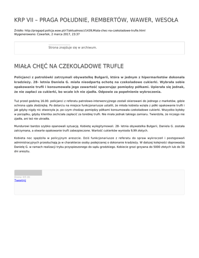 KRP VII – PRAGA POŁUDNIE, REMBERTÓW, WAWER, WESOŁA Źródło: http://pragapd.policja.waw.pl/r7/aktualnosci/1439,Miala-chec-na-czekoladowe-trufle.html Wygenerowano: Czwartek, 2 marca 2017, 23:37 Strona znajduje się w archiwum. MIAŁA CHĘĆ NA CZEKOLADOWE TRUFLE Policjanci z patrolówki zatrzymali obywatelkę Bułgarii, która w jednym z hipermarketów dokonała kradzieży. 28- letnia Daniela G. miała nieodpartą ochotę na czekoladowe cukierki. Wybrała sobie opakowanie trufli i konsumowała jego zawartość spacerując pomiędzy półkami. Upierała się jednak, że nie zapłaci za cukierki, bo wcale ich nie zjadła. Odpowie za popełnienie wykroczenia. Tuż przed godziną 16.00. policjanci z referatu patrolowo-interwencyjnego zostali skierowani do jednego z marketów, gdzie ochrona ujęła złodziejkę. Po dotarciu na miejsce funkcjonariusze ustalili, że młoda kobieta wzięła z półki opakowanie trufli i jak gdyby nigdy nic otworzyła je, po czym chodząc pomiędzy półkami konsumowała czekoladowe cukierki. Wszystko byłoby w porządku, gdyby klientka zechciała zapłacić za torebkę trufli. Nie miała jednak takiego zamiaru. Twierdziła, że niczego nie zjadła, ani też nie ukradła. Mundurowi bardzo szybko opanowali sytuację. Kobietę wylegitymowali. 28- letnia obywatelka Bułgarii, Daniela G. została zatrzymana, a otwarte opakowanie trufli zabezpieczone. Wartość cukierków wyniosła 9,99 złotych. Kobieta noc spędziła w policyjnym areszcie. Dziś funkcjonariusze z referatu do spraw wykroczeń i postępowań administracyjnych przesłuchają ja w charakterze osoby podejrzanej o dokonanie kradzieży. W dalszej kolejności doprowadzą Danielę G. w ramach realizacji trybu przyspieszonego do sądu grodzkiego. Kobiecie grozi grzywna do 5000 złotych lub do 30 dni aresztu. Ocena: 0/5 (0) Tweetnij