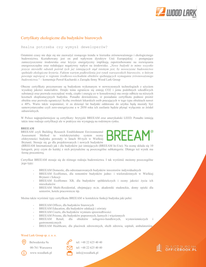 Certyfikaty ekologiczne dla budynków biurowych Realna potrzeba czy wymysł deweloperów? Ostatnimi czasy nie daje się nie zauważyć rosnącego trendu w kierunku zrównoważonego i ekologicznego budownictwa. Kształtowany jest on pod wpływem dyrektyw Unii Europejskiej - postępujące zanieczyszczenie środowiska oraz kryzys energetyczny implikują zapotrzebowanie na rozwiązania energooszczędne oraz redukujące negatywny wpływ na środowisko. „Nowe budynki to mimo wszystko jeszcze niewielki odsetek pośród tych już istniejących stąd istotnym jest, by nowoczesne budownictwo spełniało ekologiczne kryteria. Faktem wartym podkreślenia jest rynek warszawskich biurowców, w którym powstaje najwięcej w regionie środkowo-wschodnim obiektów spełniających wymagania zrównoważonego budownictwa.“ – komentuje Paweł Kucharski z Zarządu firmy Wood Lark Group Obecne certyfikaty przyznawane są budynkom wykonanym w nowoczesnych technologiach z użyciem wysokiej jakości materiałów. Dzięki temu ogranicza się emisję CO2 i jemu podobnych szkodliwych substancji oraz pozwala oszczędzać wodę, ciepło i energię co w konsekwencji ma swoje odbicie na niższych kosztach eksploatacyjnych budynku. Ponadto dowiedziono, iż posiadanie certyfikatu podnosi prestiż obiektu oraz pozwala ograniczyć liczbę zwolnień lekarskich osób pracujących w tego typu obiektach nawet o 40%. Warto także wspomnieć, iż za dziesięć lat budynki oddawane do użytku będą musiały być samowystarczalne czyli zero-energetyczne a w 2050 roku ich zasilanie będzie płynąć wyłącznie ze źródeł odnawialnych. W Polsce najpopularniejsze są certyfikaty: brytyjski BREEAM oraz amerykański LEED. Ponadto istnieją także inne rodzaje certyfikacji ale w praktyce nie występują na rodzimym rynku. BREEAM BREEAM czyli Building Research Establishment Environmental Assessment Method to wielokryterialny system oceny efektywności budynku powstały w latach 80-tych w Wielkiej Brytanii. Stosuje się go dla projektowanych i nowych budynków (BREEAM International) jak i dla budynków już istniejących (BREEAM In-Use). Na ocenę składa się 10 kategorii, przy czym do każdej z nich przynależne są poszczególne subkategorie. Dlatego też wynik ma formę procentową. Certyfikat BREEAM stosuje się do różnego rodzaju budownictwa. I tak wyróżnić możemy poszczególne jego typy: - BREEAM Domestic, dla odrestaurowanych budynków inwestorów indywidualnych BREEAM EcoHomes, dla remontów budynków jedno- i wielorodzinnych w Wielkiej Brytanii i Szkocji BREEAM EcoHomes XB, dla budynków spółdzielczych i oceny jakości życia ich mieszkańców BREEAM Multi-Residential, obejmujący m.in. akademiki studenckie, domy opieki dla seniorów, hotele pracownicze itp. Można także wyróżnić typy certyfikatu BREEAM w kontekście funkcji budynku jaki pełni: - BREEAM Offices, dla budynków biurowych BREEAM Education, dla budynków edukacji i oświaty BREEAM Courts, dla budynków wymiaru sprawiedliwości BREEAM Prisons, dla budynków poprawnych, karnych i więziennych BREEAM Retail, dla obiektów usługowo-handlowych, wystawienniczych i gastronomicznych BREEAM Healthcare, dla placówek zdrowotnych, służb zdrowia, szpitali, ambulatoriów, Wood Lark Group sp. z. o. o. ul: Belwederska 9a tel: +48 22 625 40 40 00-761 Warszawa tel: +48 22 625 40 40 www.woodlark.pl [email protected] - przychodni BREEAM Industrial, dla budynków przemysłowych i fabryk, warsztatów. Budynek poddawany certyfikacji BREEAM oceniany jest w 5-stopniowej ocenie punktowej, na którą składa się 9 kategorii środowiskowych. Są nimi: Zarządzanie – Management a. rozruch Zdrowie i dobre samopoczucie – Health and Wellbeing a. oprawy oświetleniowe o wysokiej częstotliwości Energia – Energy a. wydajność energetyczna b. kontrola zużycia energii przez najemców c. technologie bez lub niskowęglowe Transport – Transport Woda – Water a. zużycie wody Materiały – Materials Odpady – Waste a. składowanie odpadów podlegających recyklingowi b. wykorzystanie terenu i ekologia c. ograniczenie wpływu na środowisko Ekologia i użytkowanie gruntów – Land use and ecology Zanieczyszczenie – Pollution . 1. 2. 3. 4. 5. 6. 7. 8. 9. Aby zostać zakwalifikowanym do oceny budynek musi spełnić minimum 6 z 9 kryteriów, a są nimi: Zarządzanie Zdrowie i dobre samopoczucie Energia Woda Odpady oraz Ekologia i użytkowanie gruntów. Natomiast w/w kategorie środowiskowe mają przypisane wagi w zależności od rodzaju ocenianego budynku: KATEGORIA ŚRODOWISKOWA BREEAM WAGA % BUDYNKI NOWE, ROZBUDOWY, WYKOŃCZENIE BUDYNKU GENERALNE REMONTY Zarządzanie 12 13 Zdrowie i dobre samopoczucie 15 17 Energia 19 21 Transport 8 9 Woda 6 7 Materiały 12,5 14 Odpady 7,5 8 Ekologia i użytkowanie gruntu 10 n. d. Zanieczyszczenie 10 11 Wood Lark Group sp. z. o. o. ul: Belwederska 9a tel: +48 22 625 40 40 00-761 Warszawa tel: +48 22 625 40 40 www.woodlark.pl [email protected] Każda kategoria otrzymuje punktację. Te cząstkowe wyniki traktowane są jako baza do oceny budynku (lub jego projektu). Następnie te punkty się sumuje i mnoży przez odpowiednie wagi (patrz: tabelka powyżej), co w konsekwencji daje zazwyczaj ostateczny wynik. Niekiedy można spotkać się z dodatkową – 10 - grupą kryteriów podnoszących końcową ocenę budynku. Grupa ta dotyczy innowacyjności zastosowanej w budynku i w ostatecznej fazie oceny obiektu może podnieść jego ocenę. Poniżej przedstawiono schemat obrazujący ścieżkę oceny certyfikatu BREEAM: - ZDROWIE I SAMOPOCZUCIE - ENERGIA - MATERIAŁY - TRANSPORT - ZANIECZYSZCZENIE - WODA - ODPADY - EKOLOGIA I UŻYTKOWANIE GRUNTU SUMOWANIE I MNOŻENIE PRZEZ WAGI % - ZARZĄDZANIE POZOSTAŁE KATEGORIE PUNKTY Z POSZCZEGÓLNYCH KATEGORII KATEGORIE MINIMUM PUNKTY ZA INNOWACYJNOŚĆ WYNIK FINALNY Wynik certyfikacji otrzymuje się w procentowej formie, w skali 5-stopniowej, który obrazuje poniższa tabela: OCENA WARTOŚĆ % ACCEPTA