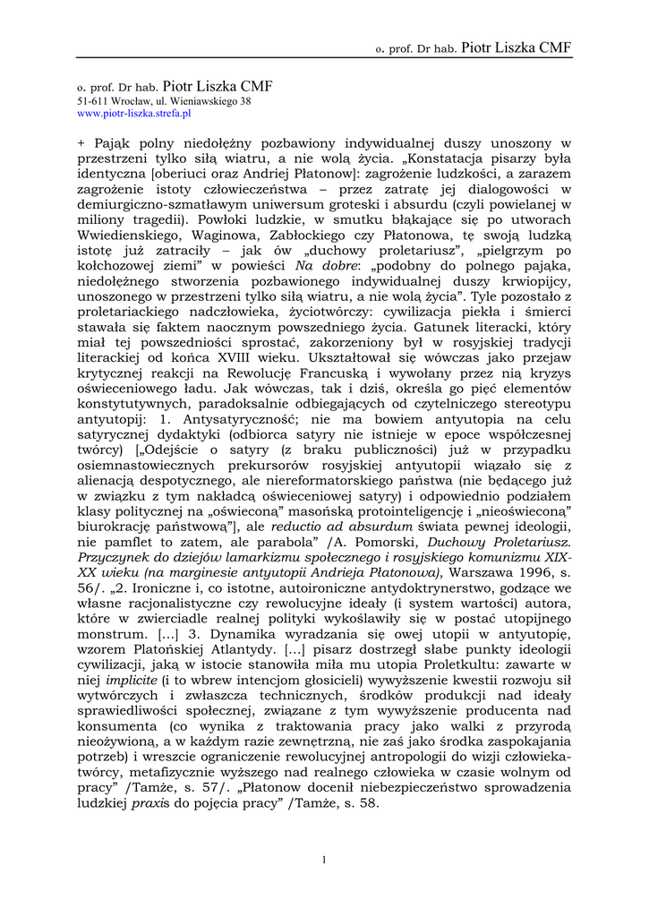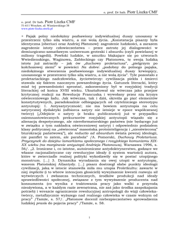 o. prof. Dr hab. Piotr Liszka CMF o. prof. Dr hab. Piotr Liszka CMF 51-611 Wrocław, ul. Wieniawskiego 38 www.piotr-liszka.strefa.pl + Pająk polny niedołężny pozbawiony indywidualnej duszy unoszony w przestrzeni tylko siłą wiatru, a nie wolą życia. „Konstatacja pisarzy była identyczna [oberiuci oraz Andriej Płatonow]: zagrożenie ludzkości, a zarazem zagrożenie istoty człowieczeństwa – przez zatratę jej dialogowości w demiurgiczno-szmatławym uniwersum groteski i absurdu (czyli powielanej w miliony tragedii). Powłoki ludzkie, w smutku błąkające się po utworach Wwiedienskiego, Waginowa, Zabłockiego czy Płatonowa, tę swoją ludzką istotę już zatraciły – jak ów „duchowy proletariusz”, „pielgrzym po kołchozowej ziemi” w powieści Na dobre: „podobny do polnego pająka, niedołężnego stworzenia pozbawionego indywidualnej duszy krwiopijcy, unoszonego w przestrzeni tylko siłą wiatru, a nie wolą życia”. Tyle pozostało z proletariackiego nadczłowieka, życiotwórczy: cywilizacja piekła i śmierci stawała się faktem naocznym powszedniego życia. Gatunek literacki, który miał tej powszedniości sprostać, zakorzeniony był w rosyjskiej tradycji literackiej od końca XVIII wieku. Ukształtował się wówczas jako przejaw krytycznej reakcji na Rewolucję Francuską i wywołany przez nią kryzys oświeceniowego ładu. Jak wówczas, tak i dziś, określa go pięć elementów konstytutywnych, paradoksalnie odbiegających od czytelniczego stereotypu antyutopij: 1. Antysatyryczność; nie ma bowiem antyutopia na celu satyrycznej dydaktyki (odbiorca satyry nie istnieje w epoce współczesnej twórcy) [„Odejście o satyry (z braku publiczności) już w przypadku osiemnastowiecznych prekursorów rosyjskiej antyutopii wiązało się z alienacją despotycznego, ale niereformatorskiego państwa (nie będącego już w związku z tym nakładcą oświeceniowej satyry) i odpowiednio podziałem klasy politycznej na „oświeconą” masońską protointeligencję i „nieoświeconą” biurokrację państwową”], ale reductio ad absurdum świata pewnej ideologii, nie pamflet to zatem, ale parabola” /A. Pomorski, Duchowy Proletariusz. Przyczynek do dziejów lamarkizmu społecznego i rosyjskiego komunizmu XIXXX wieku (na marginesie antyutopii Andrieja Płatonowa), Warszawa 1996, s. 56/. „2. Ironiczne i, co istotne, autoironiczne antydoktrynerstwo, godzące we własne racjonalistyczne czy rewolucyjne ideały (i system wartości) autora, które w zwierciadle realnej polityki wykoślawiły się w postać utopijnego monstrum. […] 3. Dynamika wyradzania się owej utopii w antyutopię, wzorem Platońskiej Atlantydy. […] pisarz dostrzegł słabe punkty ideologii cywilizacji, jaką w istocie stanowiła miła mu utopia Proletkultu: zawarte w niej implicite (i to wbrew intencjom głosicieli) wywyższenie kwestii rozwoju sił wytwórczych i zwłaszcza technicznych, środków produkcji nad ideały sprawiedliwości społecznej, związane z tym wywyższenie producenta nad konsumenta (co wynika z traktowania pracy jako walki z przyrodą nieożywioną, a w każdym razie zewnętrzną, nie zaś jako środka zaspokajania potrzeb) i wreszcie ograniczenie rewolucyjnej antropologii do wizji człowiekatwórcy, metafizycznie wyższego nad realnego człowieka w czasie wolnym od pracy” /Tamże, s. 57/. „Płatonow docenił niebezpieczeństwo sprowadzenia ludzkiej praxis do pojęcia pracy” /Tamże, s. 58. 1 o. prof. Dr hab. Piotr Liszka CMF + Pająk swastyki „Niedaleko Linzu, w kantonie Wels w Lambach nad rzeką Traun znajduje się opactwo benedyktyńskie założone w 1056 roku” /F. Ribadeau-Dumas, Tajemne zapiski magów Hitlera, przeł. Z. Siewak-Sojka. T. Papis-Gruszecka, Wydawnictwo 4 & F, Warszawa 1992, s. 15/. „w roku 1869, kiedy został opatem w Lambach. Ojciec Hagen był kabalistą. Swastyka, „wirujący krzyż światła oraz starożytny emblemat ludów północnych”. Jest magicznym znakiem, znanym zarówno w Azji jak i w Ameryce Południowej. Znaleziono go również w ruinach Troi i na celtyckich menhirach, podobnie nieobcy był Baskom i Aztekom. Ten znak kultu słońca jest symbolem ognia, stworzenia i życia. […] kiedy swastyka jest odwrócona i obraca się w prawą stronę, symbolizuje wówczas Czarne Słońce, które swym wyznawcom zapewnia nadzwyczajną moc. Taki znak, kierując swe siły przeciwko naturalnemu ruchowi obrotowemu Ziemi i przeciwstawiając się Złotemu Słońcu Życia, sieje pożogę i śmierć. Ów symbol ludzkiej pychy, buntu przeciwko władzy niebios – jak w przypadku zuchwałych budowniczych wieży Babel – odpowiada w kabale liczbie 6. Właśnie ten emblemat rozmyślnie wybrał diaboliczny opat astrolog. Mały Adolf będzie nań patrzył, zastanawiając się nad znaczeniem wirujących pajęczych łap złonośnego znaku, który przywędrował aż tutaj z odległych czasów pogaństwa. Ojciec Hagen miał ów znak w swoim herbie, a także w pierścieniu przysługującym godności opata” /Tamże, s. 17/. „Chłopiec słuchał wyjaśnień przeora Johanna Lanza, entuzjasty mitów germańskich, który twierdził ponadto, że owe kabalistyczne krzyże dały początek jego inicjacji. W klasztornej bibliotece, dzięki staraniom ojca Hagena, znajdowało się mnóstwo ksiąg na temat wiedzy tajnej oraz symbolu zwanego swastyką. Rozpoznajemy w niej – wyjaśniał – prapoczątek Zoharu, transcendentalne koło Ezechiela, rotę kabalistów, tarot magów i Cyganów, znak wiedzy tajemnej, która rozwijała się w wieku XI wraz ze sztuką i żeglarstwem. […] A kościół Paura Kirche w Lambach także ma swoje tajemne znaczenie: jest zbudowany w formie trójkąta, posiada trzy dzwonnice, trzy portyki, trzy rozety i trzy ołtarze – to masońska idea trójni. […] Trithemius został w roku 1503 oskarżony o uprawianie magii […] W swej Kronice więziennej opat klasztoru w Sponheim zamieścił wspaniałe opowiastki magiczne […] W 
