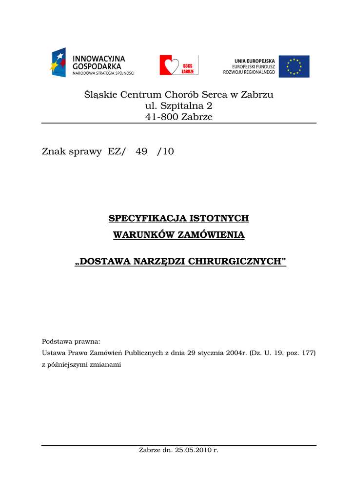 Śląskie Centrum Chorób Serca w Zabrzu ul. Szpitalna 2 41-800 Zabrze Znak sprawy EZ/ 49 /10 SPECYFIKACJA ISTOTNYCH WARUNKÓW ZAMÓWIENIA „DOSTAWA NARZĘDZI CHIRURGICZNYCH” Podstawa prawna: Ustawa Prawo Zamówień Publicznych z dnia 29 stycznia 2004r. (Dz. U. 19, poz. 177) z późniejszymi zmianami Zabrze dn. 25.05.2010 r. Śląskie Centrum Chorób Serca w Zabrzu ul. Szpitalna 2 41-800 Zabrze SPECYFIKACJA ISTOTNYCH WARUNKÓW ZAMÓWIENIA Przetarg nieograniczony na „DOSTAWĘ NARZĘDZI CHIRURGICZNYCH” Spis treści : Rozdział 1 Zamawiający Rozdział 2 Opis przedmiotu Zamówienia Rozdział 3 Opis sposobu przygotowania oferty Rozdział 4 Opis sposobu obliczania ceny oferty Rozdział 5 Wymagania Zamawiającego Rozdział 6 Dokumenty wymagane od Wykonawców Rozdział 7 Kryteria oceny Rozdział 8 Termin realizacji zamówienia Rozdział 9 Składanie ofert Rozdział 10 Tryb udzielania wyjaśnień Rozdział 11 Termin związania ofertą Rozdział 12 Otwarcie ofert Rozdział 13 Osoby upoważnione do kontaktów z Wykonawcami Rozdział 14 Zagadnienia dotyczące umowy Rozdział 15 Środki odwoławcze Załączniki ( 1 – 6) - załącznik nr 1 Formularz oferty - załącznik nr 2 Oświadczenie zgodne z wymogami art. 22 ustawy PZP - załącznik nr 3 Oświadczenie zgodne z wymogami art. 24 ustawy PZP - załącznik nr 4 Projekt umowy - załącznik nr 5 Formularz cenowy - załącznik nr 6 Pakiet 2 I. ZAMAWIAJĄCY Śląskie Centrum Chorób Serca w Zabrzu ul. Szpitalna 2, 41-800 Zabrze Tel. / Fax . 032/ 278 43 35 Strona internetowa : www.sccs.pl Adres e-mail do kontaktów z Zamawiającym : [email protected] II. OPIS PRZEDMIOTU ZAMÓWIENIA 1. Przedmiot zamówienia obejmuje dostawę narzędzi chirurgicznych zawartych w Pakiecie nr 1 do nr 3 (zał. nr 6). CPV 33.14.14.11-4 Wykluczamy możliwość składania ofert wariantowych . III. 1. OPIS SPOSOBU PRZYGOTOWANIA OFERTY Aby oferta mogła brać udział w ocenie powinna spełniać wymogi Ustawy Prawo Zamówień Publicznych i niniejszej specyfikacji. 2. Oferta składana przez Wykonawcę winna być sporządzona w języku polskim. 3. Ofertę stanowią załączniki : nr 1, nr 2, nr 3, nr 4, nr 5 i nr 6 oraz inne oświadczenia woli podpisane przez Wykonawcę. 4. W załączniku nr 2 – oświadczenie art.22 Wykonawca może polegać na własnej wiedzy, doświadczeniu, potencjale technicznym, osobach zdolnych do wykonania zamówienia i zdolnościach finansowych może też polegać na wiedzy i doświadczeniu, potencjale technicznym, osobach zdolnych do wykonania zamówienia lub zdolnościach finansowych innych podmiotów, niezależnie od charakteru prawnego łączących go z nimi stosunków. Wykonawca w takiej sytuacji zobowiązany jest udowodnić Zamawiającemu, iż będzie dysponował zasobami niezbędnymi do realizacji zamówienia, w szczególności przedstawiając w tym celu pisemne zobowiązanie tych podmiotów do oddania mu do dyspozycji niezbędnych zasobów na okres korzystania z nich przy wykonaniu zamówienia. 3 5. Wykonawca winien spełniać wszystkie warunki wymagane w punkcie V. 6. Oferta winna być podpisana przez osobę upełnomocnioną do reprezentowania firmy, co musi wynikać z załączonych do oferty dokumentów. 7. Wszystkie kartki Oferty winny być połączone w sposób trwały uniemożliwiający ich wysunięcie się ponumerowane, a każda kartka podpisana /zgodnie z pkt.6/. 8. Wszelkie poprawki lub zmiany w ofercie winny być podpisane własnoręcznie przez osobę podpisującą ofertę /zgodnie z pkt.6/. 9. Zamawiający poprawia oczywiste omyłki rachunkowe, z uwzględnieniem konsekwencji rachunkowych dokonanych poprawek . Przez oczywiste omyłki rachunkowe Zamawiający rozumie - wadliwy wynik działania arytmetycznego przy założeniu, że właściwie podana jest liczba jednostek miar i cena jednostkowa netto. 10. Jeżeli cena oferty lub części zamówienia (pakiet) podano rozbieżnie słownie i liczbą lub podano różne ceny w różnych częściach oferty, przyjmuje się, że prawidłowo podano ten zapis, który odpowiada dokonanemu obliczeniu ceny . 11. Każdy Wykonawca może złożyć tylko jedną ofertę. 12. Wykonawca nie może złożyć kilku alternatywnych Ofert. 13. Nie dopuszcza się składania ofert wariantowych. 14. Ofertę należy umieścić w kopercie zamkniętej w sposób gwarantujący zachowanie w poufności jej treści. 15. Koperta ma być zaadresowana na: Śląskie Centrum Chorób Serca Ul. Szpitalna 2 41-800 Zabrze oraz oznaczona napisem : „PRZETARG NIEOGRANICZONY NA DOSTAWĘ NARZĘDZIA CHIRURGICZNYCH” 16. Koperta musi być również opisana nazwą i adresem Wykonawcy. 4 17. Zamawiający odrzuca ofertę, jeżeli: 1) jest niezgodna z Ustawą; 2) jej treść nie odpowiada treści Specyfikacji Istotnych Warunków Zamówienia (z zastrzeżeniem art. 87 ust.2 pkt3 Ustawy Prawo Zamówień Publicznych); 3) jej złożenie stanowi czyn nieuczciwej konkurencji w rozumieniu przepisów o zwalczaniu nieuczciwej konkurencji; 4) zawiera rażąco niską cenę w stosunku do przedmiotu zamówienia; 5) została złożona przez Wykonawcę wykluczonego z udziału w postępowaniu o udzielenie zamówienia lub nie zaproszonego do składania ofert; 6) zawiera błędy w obliczeniu ceny; 7) Wykonawca w terminie 3 dni od dnia otrzymania zawiadomienia nie zgodził się na poprawienie omyłki o której mowa w art. 87 ust. 2 pkt. 3 Ustawy Prawo Zamówień Publicznych; 8) jest nieważna na podstawie odrębnych przepisów. 9) Wykonawca nie złożył wyjaśnień wraz z dowodami że oferta nie zawiera rażąco niskiej ceny, 18. Z postępowania o udzielenie zamówienia wyklucza się: 1) Wykonawców, którzy wyrządzili szkodę, nie wykonując zamówienia lub wykonując je nienależycie, jeżeli szkoda ta została stwierdzona orzeczeniem sądu, które uprawomocniło się w okresie 3 lat przed wszczęciem postępowania; 2) Wykonawców, w stosunku do których otwarto likwidację lub których upadłość ogłoszono, z wyjątkiem wykonawców, którzy po ogłosze