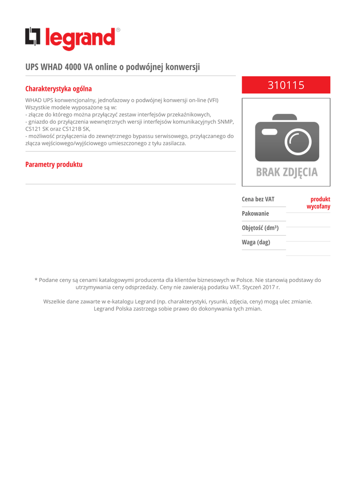 UPS WHAD 4000 VA online o podwójnej konwersji Charakterystyka ogólna 310115 WHAD UPS konwencjonalny, jednofazowy o podwójnej konwersji on-line (VFI) Wszystkie modele wyposażone są w: - złącze do którego można przyłączyć zestaw interfejsów przekaźnikowych, - gniazdo do przyłączenia wewnętrznych wersji interfejsów komunikacyjnych SNMP, CS121 SK oraz CS121B SK, - możliwość przyłączenia do zewnętrznego bypassu serwisowego, przyłączanego do złącza wejściowego/wyjściowego umieszczonego z tyłu zasilacza. Parametry produktu Cena bez VAT Pakowanie produkt wycofany Objętość (dm³) Waga (dag) * Podane ceny są cenami katalogowymi producenta dla klientów biznesowych w Polsce. Nie stanowią podstawy do utrzymywania ceny odsprzedaży. Ceny nie zawierają podatku VAT. Styczeń 2017 r. Wszelkie dane zawarte w e-katalogu Legrand (np. charakterystyki, rysunki, zdjęcia, ceny) mogą ulec zmianie. Legrand Polska zastrzega sobie prawo do dokonywania tych zmian.