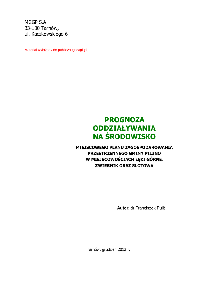 MGGP S.A. 33-100 Tarnów, ul. Kaczkowskiego 6 Materiał wyłożony do publicznego wglądu PROGNOZA ODDZIAŁYWANIA NA ŚRODOWISKO MIEJSCOWEGO PLANU ZAGOSPODAROWANIA PRZESTRZENNEGO GMINY PILZNO W MIEJSCOWOŚCIACH ŁĘKI GÓRNE, ZWIERNIK ORAZ SŁOTOWA Autor: dr Franciszek Pulit Tarnów, grudzień 2012 r. 2 Informacja o kwalifikacjach autora: FRANCISZEK PULIT doktor nauk przyrodniczych członek towarzystw naukowych : Polskiego Towarzystwa Geograficznego Polskiego Towarzystwa Geologicznego Hydrogeolog — Świadectwo Ministra Środowiska Biegły w postępowaniu wodnoprawnym Konsultant Fundacji Ekologicznej „WSPÓLNA EUROPA” * Minister Ochrony Środowiska, nadał dr Franciszkowi Pulitowi, na podstawie posiadanych kwalifikacji, świadectwem Nr V - 1262 z dnia 20 maja 1997 r. uprawnienia do projektowania, wykonywania, dozorowania i kierowania pracami geologicznymi kat.V w zakresie: poszukiwanie i rozpoznawanie zasobów wód podziemnych, określanie warunków hydrogeologicznych w związku z projektowaniem odwodnień budowlanych otworami wiertniczymi, projektowaniem inwestycji mogących zanieczyścić wody podziemne, obejmujących w szczególności składowanie odpadów na powierzchni, bezzbiornikowym magazynowaniem substancji oraz składowaniem odpadów w górotworze, także w podziemnych wyrobiskach górniczych, ustanawianiem obszarów ochronnych zbiorników wód podziemnych oraz wykonywaniem prac na potrzeby wykorzystywania ciepła Ziemi i ujmowania wód podziemnych (Rozporządzenie Ministra Środowiska z dnia 15 czerwca 2005 r., Dz.U. Nr 110, poz. 934). Na podstawie Rozporządzenia Ministra Środowiska z dnia 22 lutego 2000 r. (Dz.U. Nr 15, poz. 199 ) dr Franciszek Pulit posiada kwalifikacje i uzyskał uprawnienia biegłego w zakresie postępowania wodnoprawnego, obowiązujące na terenie całego kraju, nadane przez Wojewodę Małopolskiego świadectwem Nr 161/2000 z dnia 18.12. 2000 r. 3 SPIS TREŚCI : 1. WSTĘP ................................................................................................................... 05 1.1 Przedmiot i położenie obszaru objętego prognozą ................................... 05 1.2. Podstawa prawna.......................................................................................... 05 1.3. Cele i metodyka sporządzania prognozy ................................................... 05 2. Analiza i ocena istniejącego stanu środowiska ...................................... 07 2.1. Położenie fizycznogeograficzne.................................................................. 07 2.2. Budowa geologiczna i tektonika................................................................. 07 2.2.1. Surowce mineralne............................................................................ 10 2.3. Warunki hydrogeologiczne.......................................................................... 10 2.4. Rzeźba terenu................................................................................................ 10 2.5. Klimat lokalny................................................................................................ 11 2.6. Wody powierzchniowe.................................................................................. 11 2.7. Gleby.............................................................................................................. 12 2.8. Środowisko biotyczne, bioróżnorodność flory i fauny.............................. 12 2.9. Ocena istniejących źródeł skażeń i zagrożeń środowiska........................ 14 2.9.1. Zanieczyszczenia powietrza.............................................................. 14 2.9.2. Degradacja powierzchni ziemi przez ruchy masowe i erozję oraz antropogeniczne zmiany rzeźby terenu.......................................... 14 2.9.3. Źródła zanieczyszczeń gleb, wód powierzchniowych i podziemnych.................................................................................................... 15 3. Prawna ochrona zasobów przyrodniczych i kulturowych................... 16 3.1. Zasoby przyrody i krajobrazu podlegające ochronie na podstawie ustawy z dnia 16 kwietnia 2004 r. o ochronie przyrody................................... 16 3.2. Ochrona gruntów rolnych i leśnych............................................................ 16 3.3. Ochrona zasobów dziedzictwa kulturowego.............................................. 16 4. Ocena potencjalnych zmian w środowisku przy braku realizacji ustaleń miejscowego planu zagospodarowania przestrzennego..... 17 5. Analiza i ocena ustaleń projektu miejscowego planu zagospodarowania przestrzennego................................................................................... 18 5.1. Cele projektu miejscowego planu zagospodarowania przestrzennego oraz powiązania z innymi dokumentami.................................................... 18 5.2. Zapisy ustaleń projektu planu..................................................................... 18 5.3. Istniejące problemy ochrony środowiska istotne w realizacji projektu miejscowego planu zagospodarowania przestrzennego w szczególności dotyczące obszarów podlegających ochronie na podstawie ustawy z dnia 16 kwietnia 2004 r. o ochronie przyrody......................................... 19 5.4. Cele ochrony środowiska ustanowione na szczeblu międzynarodowym, wspólnotowym i krajowym oraz sposoby w jakich te cele i inne problemy środowiska zostały uwzględnione podczas opracowania projektu planu............................................................................................... 19 4 6. Analiza i ocena skutków realizacji ustaleń projektu planu, przewidywane znaczące oddziaływania, w tym oddziaływania bezpośrednie, pośrednie, wtórne, skumulowane, krótkoterminowe, średnioterminowe, długoterminowe, stałe i chwilowe oraz pozytywne i negatywne, na cele i przedmiot ochrony obszaru Natura 2000 oraz integralność tego obszaru, a także na środowisko........... 20 6