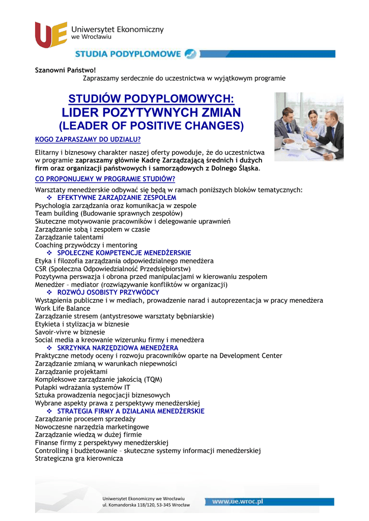 Szanowni Państwo! Zapraszamy serdecznie do uczestnictwa w wyjątkowym programie STUDIÓW PODYPLOMOWYCH: LIDER POZYTYWNYCH ZMIAN (LEADER OF POSITIVE CHANGES) KOGO ZAPRASZAMY DO UDZIAŁU? Elitarny i biznesowy charakter naszej oferty powoduje, że do uczestnictwa w programie zapraszamy głównie Kadrę Zarządzającą średnich i dużych firm oraz organizacji państwowych i samorządowych z Dolnego Śląska. CO PROPONUJEMY W PROGRAMIE STUDIÓW? Warsztaty menedżerskie odbywać się będą w ramach poniższych bloków tematycznych: EFEKTYWNE ZARZĄDZANIE ZESPOŁEM Psychologia zarządzania oraz komunikacja w zespole Team building (Budowanie sprawnych zespołów) Skuteczne motywowanie pracowników i delegowanie uprawnień Zarządzanie sobą i zespołem w czasie Zarządzanie talentami Coaching przywódczy i mentoring SPOŁECZNE KOMPETENCJE MENEDŻERSKIE Etyka i filozofia zarządzania odpowiedzialnego menedżera CSR (Społeczna Odpowiedzialność Przedsiębiorstw) Pozytywna perswazja i obrona przed manipulacjami w kierowaniu zespołem Menedżer – mediator (rozwiązywanie konfliktów w organizacji) ROZWÓJ OSOBISTY PRZYWÓDCY Wystąpienia publiczne i w mediach, prowadzenie narad i autoprezentacja w pracy menedżera Work Life Balance Zarządzanie stresem (antystresowe warsztaty bębniarskie) Etykieta i stylizacja w biznesie Savoir-vivre w biznesie Social media a kreowanie wizerunku firmy i menedżera SKRZYNKA NARZĘDZIOWA MENEDŻERA Praktyczne metody oceny i rozwoju pracowników oparte na Development Center Zarządzanie zmianą w warunkach niepewności Zarządzanie projektami Kompleksowe zarządzanie jakością (TQM) Pułapki wdrażania systemów IT Sztuka prowadzenia negocjacji biznesowych Wybrane aspekty prawa z perspektywy menedżerskiej STRATEGIA FIRMY A DZIAŁANIA MENEDŻERSKIE Zarządzanie procesem sprzedaży Nowoczesne narzędzia marketingowe Zarządzanie wiedzą w dużej firmie Finanse firmy z perspektywy menedżerskiej Controlling i budżetowanie – skuteczne systemy informacji menedżerskiej Strategiczna gra kierownicza Uniwersytet Ekonomiczny we Wrocławiu ul. Komandorska 118/120, 53-345 Wrocław CO WYRÓŻNIA TE STUDIA? Poza przekazywaniem najnowszych osiągnięć wiedzy ukierunkowanej na skuteczne rozwijanie kompetencji menedżerskich i kierowniczych chcemy także utworzyć swoisty KLUB BIZNESU, do którego należeć będą Menedżerowie obecnej i przyszłych edycji studiów. Zależy nam bowiem, abyście mieli Państwo szerszą możliwość: - budowania bliskich, interpersonalnych relacji z innymi Słuchaczami studiów, - wymieniania się wiedzą i doświadczeniami, - wzajemnego polecania swoich usług i produktów czy - dzielenia się informacjami rynkowymi. Praca dyplomowa po ukończeniu studiów została zastąpiona przyjaznym egzaminem menedżerskim, ponieważ wychodzimy z założenia, że najważniejszym elementem w praktyce menedżera jest bezpośrednia komunikacja. Świadectwo ukończenia studiów podyplomowych zawierać będzie nazwy przedmiotów w języku polskim i angielskim (chociaż zajęcia będą prowadzone w języku polskim), dzięki czemu można będzie przedstawić certyfikat ukończenia studiów także w szerszych międzynarodowych kręgach. KTO PROWADZI ZAJĘCIA? Zajęcia prowadzone będą przez najlepszych wykładowców akademickich oraz trenerów biznesu, coachów, psychologów, mediatorów i ekspertów w dziedzinie zarządzania, marketingu, prawa i finansów. W ramach wspomnianego Klubu Biznesu przewidziane są także prelekcje i dyskusje z biznesmenami Diamentów Forbesa oraz top management’em biznesu dolnośląskiego. Do prowadzenia prelekcji i wykładów zaprosiliśmy także znane osoby świata binzesu i życia społecznego – m.in.: Prof. zw. dr hab. Marian Noga – Rektor Akademii Ekonomicznej we Wrocławiu(1999-2005), członek Rady Polityki Pieniężnej (20042010), senator RP IV i V kadencji; Prof. dr hab. Witold Modzelewski – Wiceminister Finansów (1992-96), doradca podatkowy, autor ok. 1000 publikacji; Lidia Geringer de Oedenberg – poseł do Parlamentu Europejskiego; Mec. Leszek Korczak – Dziekan Okręgowej Izby Radców Prawnych we Wrocławiu. Uniwersytet Ekonomiczny we Wrocławiu ul. Komandorska 118/120, 53-345 Wrocław KIEDY i GDZIE ODBYWAJĄ SIĘ ZAJĘCIA? Studia zakładają 140 godzin warsztatów, co oznacza, że przez okres 9 miesięcy spotykamy się weekendowo 1 RAZ W MIESIĄCU! Zajęcia odbywać się będą w nowoczesnych, w pełni mulitmedialnych salach Centrum Kształcenia Ustawicznego Uniwersytetu Ekonomicznego we Wrocławiu. Zaplanowano także SESJE WYJAZDOWE (merytorycznointegracyjne) do ekskluzywnych hoteli SPA, aby tam dzielić się wiedzą oraz lepiej poznać się w menedżerskim gronie, zbudować przyjacielskie relacje i odpocząć od bieżących spraw zawodowych. (Ilość sesji przedyskutujemy z Uczestnikami podczas pierwszego spotkania). Poza programem Studiów planujemy także fakultatywne (nieodpłatne) zajęcia rekreacyjno-rozwojowe dla Uczestników Studiów i Ich Dzieci, podczas których będzie okazja do rodzinnej zabawy i ciekawej rywalizacji. ILE WYNOSI INWESTYCJA W STUDIA? Opłata za cały rok studiów wynosi 4.950 PLN brutto, co w porównaniu do oferowanych na rynku edukacyjnym programów MBA stanowi ok. 1/5 ceny konkurencyjnych programów. Istnieje możliwość rozłożenia płatności na dwie lub więcej rat. Ponadto na Państwa życzenie Uczelnia wystawia stosowne dokumenty potwierdzające zasadność podjęcia studiów. GDZIE MOŻNA DOKONAĆ ZGŁOSZENIA? Zgłoszenia na studia prosimy kierować do Koordynatora Studiów: mgr Agnieszka Ficnerska tel. kom.: 882 714 330; tel. stac.: 71 319 48 35; e-mail: [email protected] Po dokonaniu zgłoszenia, otrzymacie Państwo dalsze szczegółowe informacje dotyczące terminów zajęć, wymaganych dokumentów itd. Zgłoszenia przyjmujemy do: 30 września 2015r. Przewidywany termin rozpoczęcia zajęć: 17 października 2015r. KTO UDZIELA DODATKOWYCH INFORMACJI? Do Państwa d