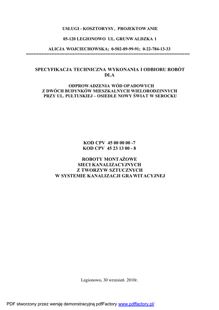USŁUGI - KOSZTORYSY, PROJEKTOW ANIE 05-120 LEGIONOWO UL. GRUNW ALDZKA 1 ALICJA WOJCIECHOWSKA; 0-502-89-99-91; 0-22-784-13-33 ================================================================ SPECYFIKACJA TECHNICZNA WYKONANIA I ODBIORU ROBÓT DLA ODPROW ADZENIA WÓD OPADOWYCH Z DWÓCH BUDYNKÓW MIESZKALNYCH WIELORODZINNYCH PRZY UL. PUŁTUSKIEJ – OSIEDLE NOWY ŚWIAT W SEROCKU KOD CPV 45 00 00 00 -7 KOD CPV 45 23 13 00 - 8 ROBOTY MONTAŻOWE SIECI KANALIZACYJNYCH Z TWORZYW SZTUCZNYCH W SYSTEMIE KANALIZACJI GRA WITACYJNEJ Legionowo, 30 wrzesień 2010r. PDF stworzony przez wersję demonstracyjną pdfFactory www.pdffactory.pl/ SPECYFIKACJA TECHNICZNA WYKONANIA I ODBIORU ROBÓT DLA ODPROW ADZENIA WÓD OPADOWYCH Z DWÓCH BUDYNKÓW MIESZKALNYCH WIELORODZINNYCH PRZY UL. PUŁTUSKIEJ – OSIEDLE NOWY ŚWIAT W SEROCKU KOD CPV 45 00 00 00-7; 45 23 13 00-8 1.a. Przedmiot specyfikacji technicznej. Przedmiotem niniejszej Specyfikacji Technicznej (ST) ąs wymagania dotyczące wykonania i odbioru robót związanych z budową w/w zakresu robót realizowanych dla potrzeb przebudowywanej drogi gminnej ul Sybiraków w Legionowie. 1.b. Zakres stosowania ST. Specyfikacja Techniczna jest stosowana jako dokument przetargowy i kontraktowy przy zlecaniu i realizacji robót wymienionych w punkcie 1.1. 1.c. Zakres robót objętych specyfikacją techniczną. Ustalenia zawarte w niniejszej Specyfikacji Technicznej dotycz ą zasad prowadzenia robót związanych z wykonaniem przyłączy kanalizacji deszczowej do projektowanych wpustów ulicznych w/g rysunków szczegółowych zamieszczonych w Projekcie BudowlanoWykonawczym. Budowa w/w inwestycji obejmuje: -wykonanie wykopu wąskoprzestrzennego szalowanego z wywozem gruntu z pierwszego odcinka , dalej do bezpośredniej zasypki, -nadmiar gruntu pozostałego z wykopów przewidziany jest do wywiezienia na odległość do 5 km., -budowa kanalizacji deszczowej z rur kanalizacyjnych litych PVC klasy "S" Dz 0,20-0,16 m Lłącz. =138 m, -wykonanie studni kanalizacyjnych z kręgów betonowych Dn 1,20 m z włazem żeliwnym typu ciężkiego 40 t oraz studni rewizyjnych z PP lub pE Dn 400 mm, -wykonanie wpustów ulicznych betonowych Dn 500mm zbudowanych z rury betonowej z dnem, rury betonowej z otworem bocznym Dn 0,20m, nadstawki betonowej, pierścienia żelbetowego odciążającego wpust uliczny i pierścienia podtrzymującego wpust oraz wpustu ulicznego żeliwnego typ ciężki Dn 650x450mm. Pod wpust uliczny żeliwny należy zamontować koszt stalowy ocynkowany do studni ściekowych ulicznych. -wykonanie zasypki wykopu pod kanalizację wraz z jego zagęszczeniem pod wynik zagęszczenia gruntu do 1,0 współczynnika w skali Proctora dla potrzeb odbudowy nawierzchni drogi, -mechaniczne i ręczne splantowanie terenu drogi w pasie robót po wybudowaniu kanalizacji, -odbudowa nawierzchni asfaltowej drogi 1.d. Informacje o terenie budowy. Teren osiedla na odcinku wykonywanych robót jest miejscem dojazdowym do istniejących budynków oraz miejscem istniejących parkingów dla samochodów z terenu osiedla. Odbywa się tu ruch samochodowy ii pieszy przeznaczony dla mieszkańców osiedla. Projektowana przebudowa przyłączy kanalizacyjnych przebiega w części istniejącej jezdni o nawierzchni asfaltowej oraz w części istniejących trawników. Uzbrojenie terenu przez który przebiega sieć kanalizacji sanitarnej stanowi sieć gazowa, wodociągowa, kanalizacyjna PDF stworzony przez wersję demonstracyjną pdfFactory www.pdffactory.pl/ sanitarna, energetyczna podziemna i telefoniczna. 1.e. Nazwy i kody. 45.00.00.00-7; 45 23 13 00-8 - Roboty montażowe sieci kanalizacyjnych z tworzyw sztucznych w systemie kanalizacji grawitacyjnej. Przygotowanie terenu pod budowę 45.10.00.00-8; 45.11.12.00-0; 45.11.22.10-0 Wznoszenie kompletnych obiektów budowlanych lub ich części; inżynieria lądowa i wodna 45.20.00.00-9; 45.22.22.00-5; 45.23.13.00-8; 45.23.24.00-6; 45.23.24.10-9; 45.23.24.40-8; 45.23.21.30-2; 45.23.24.50-1; 45.23.24.51-8; 45.23.24.52-5; 45.23.24.53-2; 1.f. Określenia podstawowe. Kanalizacja deszczowa - sieć kanalizacyjna zewnętrzna przeznaczona do odprowadzania wód opadowych z powierzchni terenu i ulic. Kanał - liniowa budowa przeznaczona do grawitacyjnego odprowadzania wód deszczowych. Przyłącze kanalizacji deszczowej - kanał przeznaczony do połączenia studni ulicznych z siecią kanalizacji deszczowej w celu ich odprowadzania. Urządzenia (elementy) uzbrojenia sieci. Studzienka kanalizacyjna - studzienka rewizyjna - na kanale nieprzełazowym przeznaczona do kontroli i prawidłowej eksploatacji kanałów. Studzienka przelotowo-połączeniowa - studzienka kanalizacyjna zlokalizowana na załamaniach osi kanału w planie, na załamaniach spadku kanału, na odcinkach prostych oraz do łączenia co najmniej dwóch kanałów dopływowych w jeden kanał odpływowy. Elementy studzienek. Komora robocza - zasadnicza część studzienki przeznaczona do czynności eksploatacyjnych. Wysokość komory roboczej to odległość pomiędzy rzędną dolnej powierzchni płyty lub innego elementu przykrycia studzienki a rzędną spocznika. Płyta przykrycia studzienki - płyta betonowa lub żelbetowa przykrywająca komorę roboczą studni. Właz zeliwny - właz zamykający zejście do studni rewizyjnej leżący na płycie betonowej studni.. Kineta - wyprofilowany rowek w dnie studzienki, przeznaczony do przepływu w nim ścieków. Spocznik - element dna studzienki pomiędzy kinetą a ścianą komory roboczej. 2. Materiały. Przy wykonywaniu robót budowlanych należy stosować wyroby dopuszczone do obrotu i stosowania w budownictwie zgodnie z: - Rozporządzeniem Ministra Gospodarki Przestrzennej i Budownictwa z dnia 19 grudnia 1994r. w sprawie aprobat i kryteriów technicznych dotyczących wywobów budowlanych (Dz. U. Nr 10 z 1995r. poz. 48 oraz rozporz ądzenie zmieniające w/w rozporządzenie Dz. U. z 1995r. nr 136 poz. 672. - Zarządzeniem Dyrektora Polskiego Centrum Badań i Certyfikacji z d