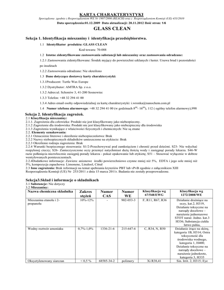 KARTA CHARAKTERYSTYKI Sporządzona zgodnie z Rozporządzeniem WE Nr 1907/2006 (REACH) oraz z Rozporządzeniem Komisji (UE) 453/2010 Data sporządzenia:01.12.2009 Data aktualizacji: 20.11.2012 Ilość stron: 1/6 GLASS CLEAN Sekcja 1. Identyfikacja mieszaniny i identyfikacja przedsiębiorstwa. 1.1 Identyfikator produktu: GLASS CLEAN Kod towaru: 70-088 1.2 Istotne zidentyfikowane zastosowania substancji lub mieszaniny oraz zastosowania odradzane: 1.2.1 Zastosowania zidentyfikowane: Środek myjący do powierzchni szklanych i luster. Usuwa brud i pozostałości po insektach 1.2.2 Zastosowania odradzane: Nie określono 1.3 Dane dotyczące dostawcy karty charakterystyki: 1.3.1Producent: Turtle Wax Europe 1.3.2 Dystrybutor: AMTRA Sp. z o.o. 1.3.2 Adres:ul. Schonów 3, 41-200 Sosnowiec 1.3.3 Telefon: +48 32 294 41 00 1.3.4 Adres email osoby odpowiedzialnej za kartę charakterystyki: [email protected] 1.4 Numer telefonu alarmowego: +48 32 294 41 00 (w godzinach 800- 1600), 112 ( ogólny telefon alarmowy),998 Sekcja 2. Identyfikacja zagrożeń. 2.1 Klasyfikacja mieszaniny: 2.1.1. Zagrożenia dla człowieka: Produkt nie jest klasyfikowany jako niebezpieczny. 2.1.2 Zagrożenie dla środowiska: Produkt nie jest klasyfikowany jako niebezpieczny dla środowiska 2.1.3 Zagrożenia wynikające z właściwości fizycznych i chemicznych: Nie są znane 2.2. Elementy oznakowania: 2.2.1 Oznaczenie literowe i określenie niebezpieczeństwa: Brak 2.2.2 Nazwy niebezpiecznych składników umieszczone na etykiecie: Brak 2.2.3 Określenie rodzaju zagrożenia: Brak 2.2.4 Warunki bezpiecznego stosowania: S1/2-Przechowywać pod zamknięciem i chronić przed dziećmi. S23- Nie wdychać rozpylonej cieczy; S26- Zanieczyszczone oczy przemyć natychmiast dużą ilością wody i zasięgnąć porady lekarza. S46-W razie połknięcia niezwłocznie zasięgnij porady lekarza - pokaż opakowanie lub etykietę; S51 – Stosować wyłącznie w dobrze wentylowanych pomieszczeniach. 2.2.4Dodatkowe informacje: Zawiera: anionowe środki powierzchniowo czynne mniej niż 5%, EDTA i jego sole mniej niż 5%, kompozycja zapachowa: Limonene, Linalool, Citral 2.3 Inne zagrożenia: Brak informacji na temat spełniania kryteriów PBT lub vPvB zgodnie z załącznikiem XIII Rozporządzenia Komisji (UE) Nr 253/2011 z dnia 15 marca 2011r. Badania nie zostały przeprowadzone. Sekcja3.Skład i informacje o składnikach 3.1 Substancje: Nie dotyczy 3.2 Mieszaniny: Nazwa chemiczna składnika Zakres stężeń Mieszanina etanolu i 2propanolu 10%-12% Numer CAS Numer WE Klasyfikacja wg 67/548/EWG Klasyfikacja wg 1272/2008/WE - 902-053-3 F; R11, R67, R36 Działanie drażniące na oczy, kat.2, H319, Działanie toksyczne na narządy docelowe – narażenie jednorazowe STOT naraż. Jedno. kat.3 H336; Substancja ciekła łatwo palna, Działanie żrące na skórę, kategoria 1B, H314; Ostra toksyczność dla środowiska wodnego, kategoria 1, H400; Działanie toksyczne na narządy docelowe – narażenie jednokrote, kategoria 3, H335 Sin. Irrit. 2, H315; Eye Wodny roztwór amoniaku 0,7%-1,0% 1336-21-6 215-647-6 C, R34, N, R50 Oksyetylenowany siarczan < 0,5 % 68585-34-2 polimery Xi R38,41 KARTA CHARAKTERYSTYKI Sporządzona zgodnie z Rozporządzeniem WE Nr 1907/2006 (REACH) oraz z Rozporządzeniem Komisji (UE) 453/2010 Data sporządzenia:01.12.2009 Data aktualizacji: 20.11.2012 Ilość stron: 2/6 GLASS CLEAN alkilosodowy Sól czterosodowa kwasu etylenodiaminotetraoctowego < 0,2 % 64-02-8 200-573-9 Xn; R20/22,R 41 Limonene (d-Limonen) <0,02% 5989-27-5 227-813-5 Xi, N, R10, R38, R43, R50/53 < 0,005% < 0,004% 78-70-6 5392-40-5 201-134-4 226-394-6 Xi, R38 Xi, R38, R43 Linalool (Linalol) Citral (Cytral) Dam. 1, H318 Acute Tox. 4, H302; Acute Tox. 4, H332; Eye Dam. 1 H318; Flam. Liq.3; H226-Skin Irrit.2;H315-Skin Sens.1; H317-Aquatic Acute 1; H400-Aquatic Chronic 1; H410 Skin. Irrit.2; H315 Skin Irrit.2; H315- Skin Sens. 1; H317- Eye Irrit. 2; H319 SEKCJA 4. ŚRODKI PIERWSZEJ POMOCY 4.1 Opis środków pierwszej pomocy: 4.1.1 Połknięcie: W razie połknięcia przepłukać jamę ustną oraz przetransportować do najbliższej placówki medycznej celem podjęcia leczenia. Pokazać opakowanie lub etykietę. Jeśli wystąpią spontanicznie wymioty, trzymać głowę poniżej bioder. 4.1.2. Zatrucie inhalacyjne: Wynieść poszkodowanego z miejsca narażenia i zapewnić dostęp świeżego powietrza oraz spokój i odpoczynek. W przypadku dolegliwości (kaszel, wymioty, zawroty głowy, świszczący oddech) zapewnić pomoc lekarską. Nieprzytomnego ułożyć w pozycji bocznej. 4.1.3. Skażenie skóry: Zdjąć skażoną odzież. Skórę zmyć ciepłą wodą z mydłem. W razie wystąpienia podrażnienia skóry skontaktować się z lekarzem. 4.1.4.Skażenie oczu: Jeżeli poszkodowany nosi szkła kontaktowe niezwłocznie je wyjąć. Dokładnie przemyć oczy dużą ilością wody, wywijając powieki. Zapewnić pomoc okulisty. Uwaga: osoby narażone na skażenie oczu powinny być pouczone o konieczności i sposobie natychmiastowego płukania oczu 4.2 Najważniejsze ostre i opóźnione objawy oraz skutki narażenia: 4.2.1 Skażenie oczu: Może wystąpić podrażnienie, zaczerwienienie oraz łzawienie 4.2.2 Połknięcie: Mogą pojawić się mdłości, wymioty oraz ból brzucha 4.3 Wskazania dotyczące wszelkiej natychmiastowej pomocy lekarskiej i szczególnego postępowania z poszkodowanym: Nie dotyczy. Podjąć leczenie objawowe. SEKCJA 5. POSTĘPOWANIE W PRZYPADKU POŻARU 5.1 Środki gaśnicze: 5.1.1 Odpowiednie środki gaśnicze: Stosować powszechne środki gaśnicze; w zależności od otoczenia. 5.1.2 Niewłaściwe środki gaśnicze: Nie są znane. 5.2 Szczególne zagrożenia związane z mieszaniną: Nie są znane. Należy unikać wdychania produktów spalania. 5.3 Informacje dla straży pożarnej: Środki ochrony ogólnej typowe w przypadku pożaru. Nie należy przebywać w zagrożonej ogniem strefie bez odpowiedniego ubrania odpornego na chemikalia i aparatu do oddychania z niezależn
