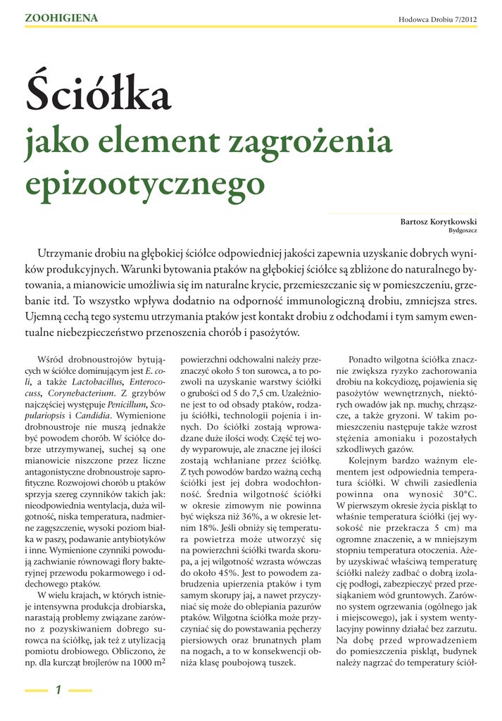 ZOOHIGIENA Hodowca Drobiu 7/2012 Ściółka jako element zagrożenia epizootycznego Bartosz Korytkowski Bydgoszcz Utrzymanie drobiu na głębokiej ściółce odpowiedniej jakości zapewnia uzyskanie dobrych wyników produkcyjnych. Warunki bytowania ptaków na głębokiej ściółce są zbliżone do naturalnego bytowania, a mianowicie umożliwia się im naturalne krycie, przemieszczanie się w pomieszczeniu, grzebanie itd. To wszystko wpływa dodatnio na odporność immunologiczną drobiu, zmniejsza stres. Ujemną cechą tego systemu utrzymania ptaków jest kontakt drobiu z odchodami i tym samym ewentualne niebezpieczeństwo przenoszenia chorób i pasożytów. Wśród drobnoustrojów bytujących w ściółce dominującym jest E. coli, a także Lactobacillus, Enterococuss, Corynebacterium. Z grzybów najczęściej występuje Penicillum, Scopulariopsis i Candidia. Wymienione drobnoustroje nie muszą jednakże być powodem chorób. W ściółce dobrze utrzymywanej, suchej są one mianowicie niszczone przez liczne antagonistyczne drobnoustroje saprofityczne. Rozwojowi chorób u ptaków sprzyja szereg czynników takich jak: nieodpowiednia wentylacja, duża wilgotność, niska temperatura, nadmierne zagęszczenie, wysoki poziom białka w paszy, podawanie antybiotyków i inne. Wymienione czynniki powodują zachwianie równowagi flory bakteryjnej przewodu pokarmowego i oddechowego ptaków. W wielu krajach, w których istnieje intensywna produkcja drobiarska, narastają problemy związane zarówno z pozyskiwaniem dobrego surowca na ściółkę, jak też z utylizacją pomiotu drobiowego. Obliczono, że np. dla kurcząt brojlerów na 1000 m2 1 powierzchni odchowalni należy przeznaczyć około 5 ton surowca, a to pozwoli na uzyskanie warstwy ściółki o grubości od 5 do 7,5 cm. Uzależnione jest to od obsady ptaków, rodzaju ściółki, technologii pojenia i innych. Do ściółki zostają wprowadzane duże ilości wody. Część tej wody wyparowuje, ale znaczne jej ilości zostają wchłaniane przez ściółkę. Z tych powodów bardzo ważną cechą ściółki jest jej dobra wodochłonność. Średnia wilgotność ściółki w okresie zimowym nie powinna być większa niż 36%, a w okresie letnim 18%. Jeśli obniży się temperatura powietrza może utworzyć się na powierzchni ściółki twarda skorupa, a jej wilgotność wzrasta wówczas do około 45%. Jest to powodem zabrudzenia upierzenia ptaków i tym samym skorupy jaj, a nawet przyczyniać się może do oblepiania pazurów ptaków. Wilgotna ściółka może przyczyniać się do powstawania pęcherzy piersiowych oraz brunatnych plam na nogach, a to w konsekwencji obniża klasę poubojową tuszek. Ponadto wilgotna ściółka znacznie zwiększa ryzyko zachorowania drobiu na kokcydiozę, pojawienia się pasożytów wewnętrznych, niektórych owadów jak np. muchy, chrząszcze, a także gryzoni. W takim pomieszczeniu następuje także wzrost stężenia amoniaku i pozostałych szkodliwych gazów. Kolejnym bardzo ważnym elementem jest odpowiednia temperatura ściółki. W chwili zasiedlenia powinna ona wynosić 30°C. W pierwszym okresie życia piskląt to właśnie temperatura ściółki (jej wysokość nie przekracza 5 cm) ma ogromne znaczenie, a w mniejszym stopniu temperatura otoczenia. Ażeby uzyskiwać właściwą temperaturę ściółki należy zadbać o dobrą izolację podłogi, zabezpieczyć przed przesiąkaniem wód gruntowych. Zarówno system ogrzewania (ogólnego jak i miejscowego), jak i system wentylacyjny powinny działać bez zarzutu. Na dobę przed wprowadzeniem do pomieszczenia piskląt, budynek należy nagrzać do temperatury ściół- ZOOHIGIENA Hodowca Drobiu 7/2012 ki. Należy pamiętać o tym, że zbyt zimna ściółka bardzo łatwo ulega zawilgoceniu, a to z kolei wybitnie sprzyja rozwojowi chorobotwórczych mikroorganizmów. Ściółka zaczyna pracować dopiero po upływie około 4 tygodni i wówczas wydziela znaczne ilości ciepła. W okresie letnich upałów należy na to zwracać szczególną uwagę, ponieważ może to prowadzić do występowania u ptaków (a zwłaszcza u brojlerów) zjawiska hipertermii. W ściółce odbywają się złożone procesy biochemiczne i bakteriologiczne rozkładające pomiot. W warunkach sprzyjających wzrasta ilość mikroorganizmów zdolnych do pobierania energii z rozkładu substancji organicznych. Utrzymana w dobrej strukturze ściółka powinna być gruzełkowata, wiązać wilgoć, gazy i zapewnić ptakom ciepło. Ciepło jest poza tym absorbowane od ptaków, emitowane ze ścian i sufitu pomieszczenia nagrzanego słońcem. To wszystko sprzyja różnym procesom biologicznym zachodzącym w ściółce, z czym z kolei związane jest także wytwarzanie ciepła oraz rozwój drobnoustrojów, procesy fermentacji. Ściółka stanowi także źródło witamin – B12 i K, które są syntetyzowane przez florę bakteryjną jelit i drobnoustroje znajdujące się w ściółce. Ptaki zjadając swój pomiot i ściółkę zaopatrują się w witaminę B12 i K. Ściółka jest wręcz idealnym siedliskiem dla rozwoju różnych mikroorganizmów, a szczególnie bakterii, grzybów, pleśni, drożdży. Liczba tych mikroorganizmów jest bardzo zróżnicowana i uzależniona od materiału ściółkowego, czasu jego użytkowania, temperatury i wilgotności. Z reguły są to mikroorganizmy niepatogenne. Jednakże ich zawartość powinna być kontrolowana, szczególnie w początkowym okresie użytkowania, przy występowaniu chorób oraz w przypadku wielokrotnego wykorzystywania zużytej ściółki. Ograniczenie rozwoju flory bakteryjnej i grzy- biczej jest możliwe poprzez stosowanie niektórych dodatków chemicznych i biologicznych. Takie zabiegi mają na celu również zmniejszenie emisji amoniaku. Oprócz gazów i pary wodnej ze ściółki unosi się pył. Ma to miejsce szczególnie w pierwszym tygodniu jej użytkowania (wysoka temperatura, niska wilgotność względna) oraz w okresie letnich upałów, kiedy to p